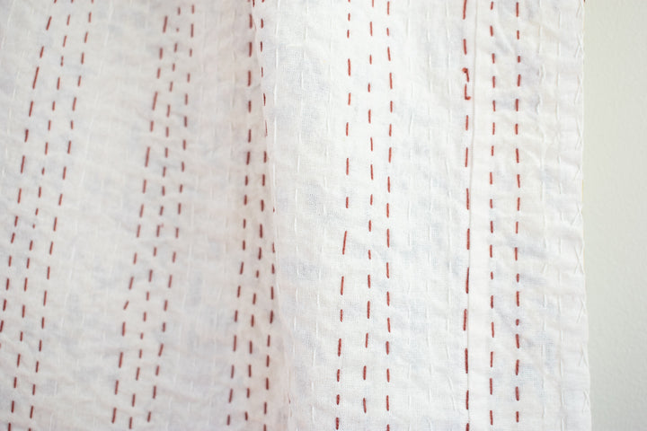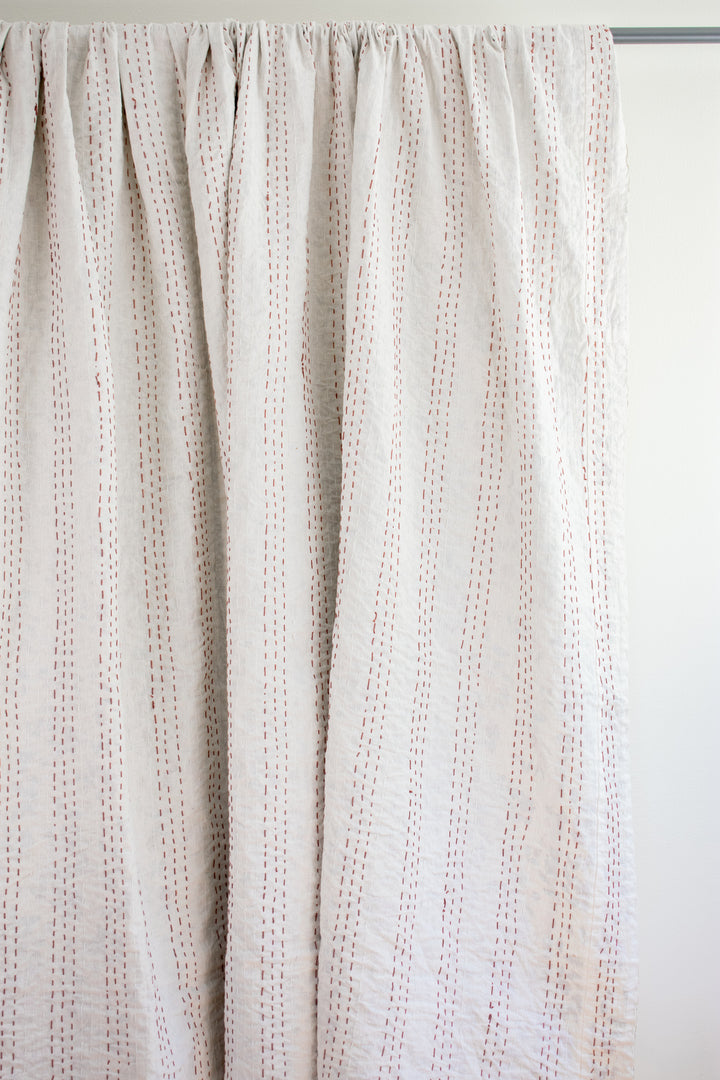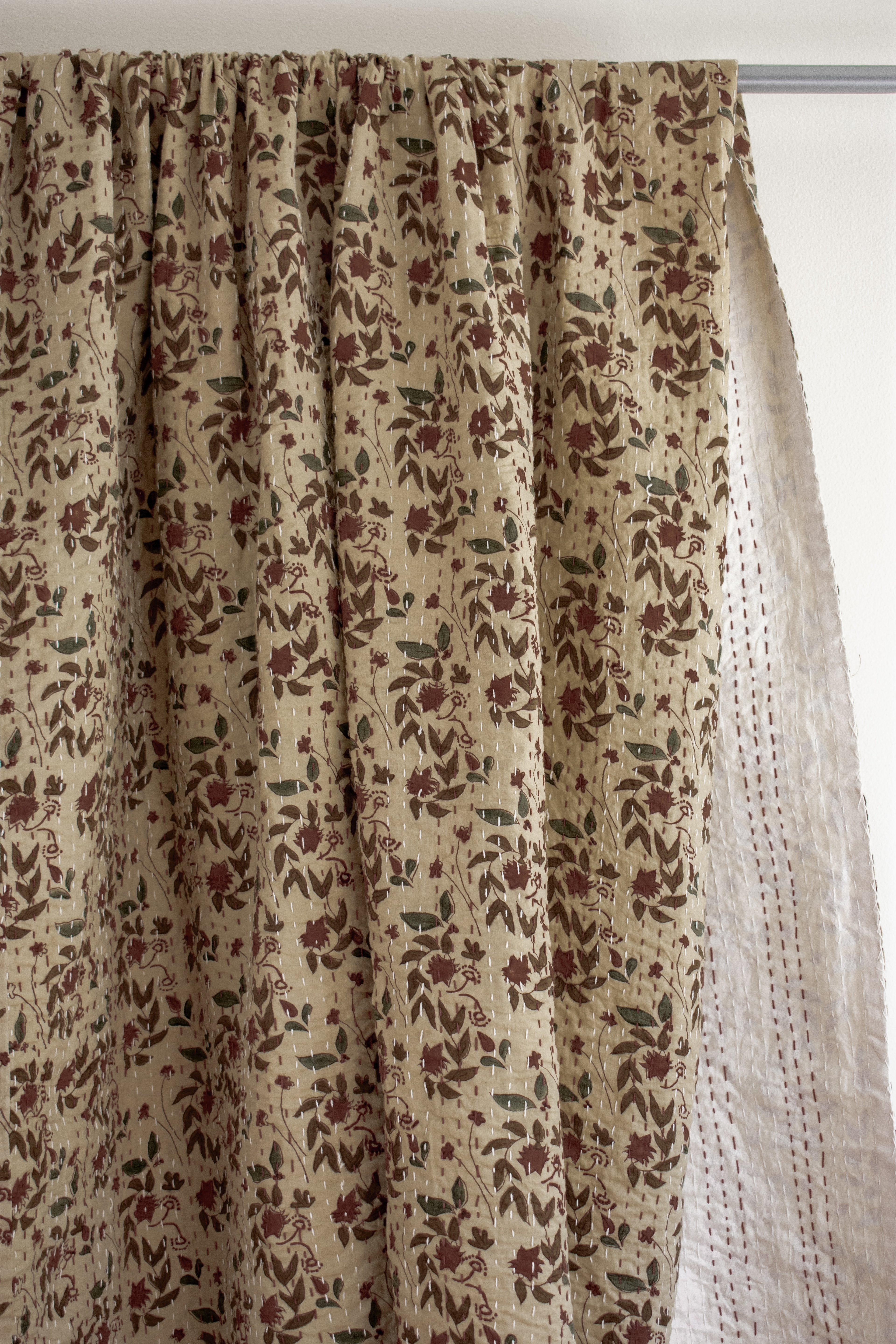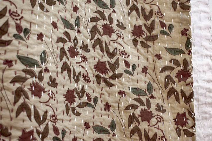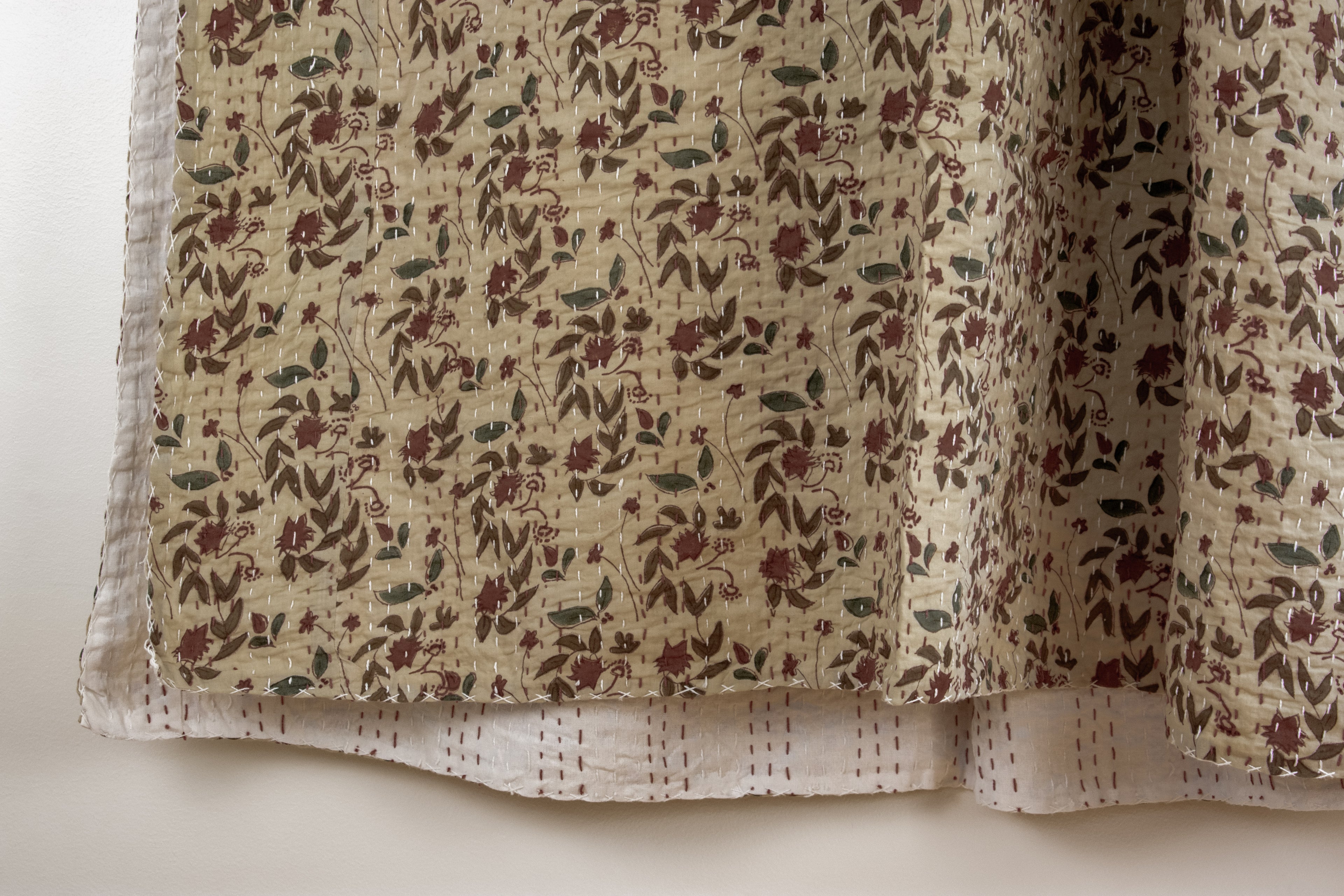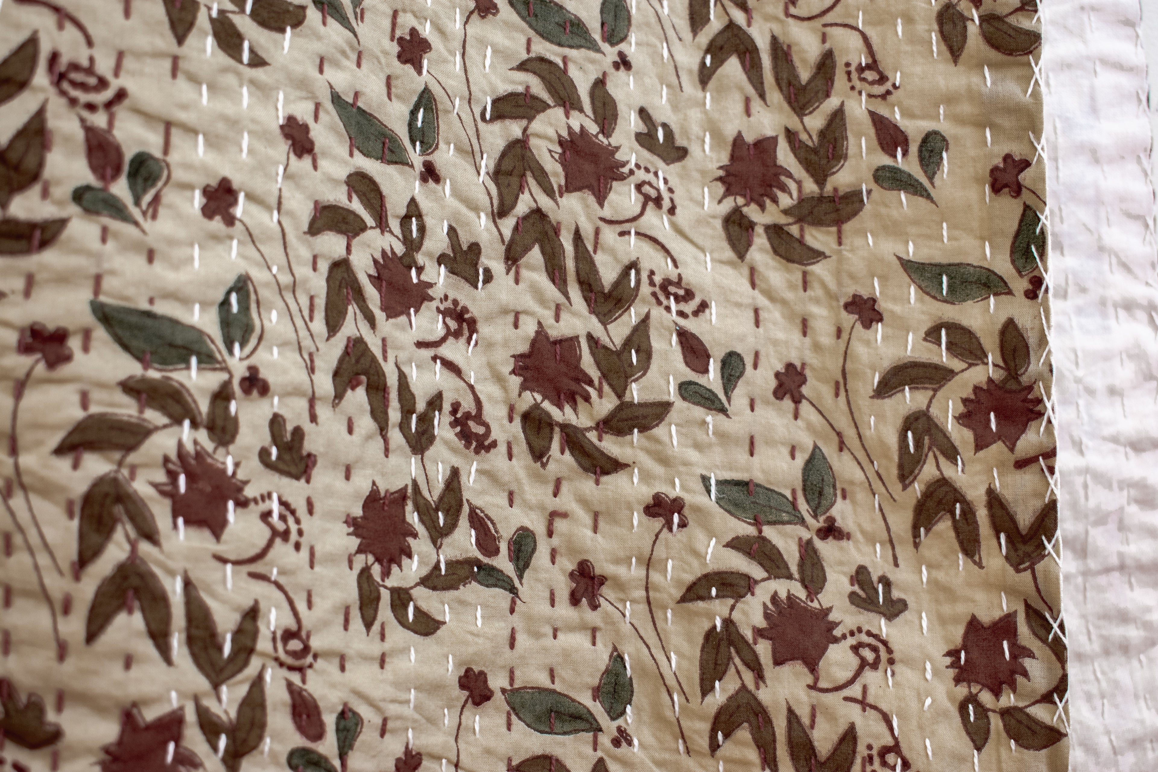 Our large, gorgeous, heirloom quality hand block printed quilts fit beautifully on both King and Queen sized beds. They are a lightweight coverlet-style, giving them a nice drape, and perfect for layering or standing on their own. Two thin layers of cotton fabric are stitched together with hundreds of "kantha" stitches, a centuries-old Bengali tradition of hand stitching. Each quilt is a true labor of love.
