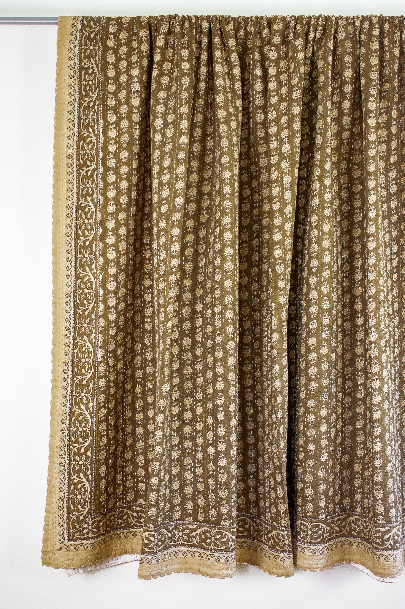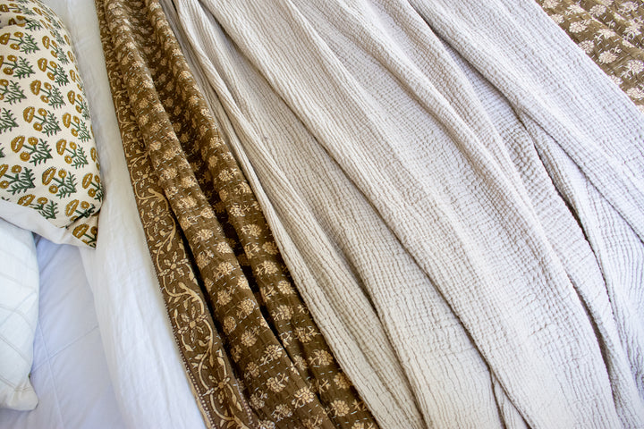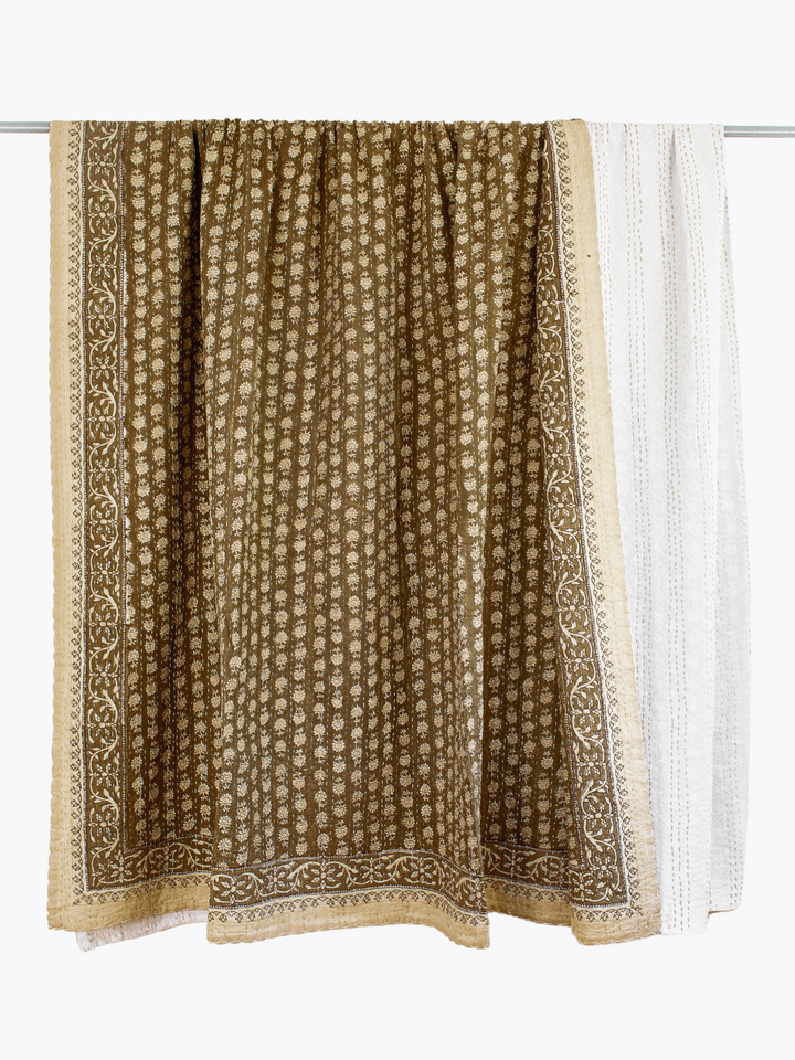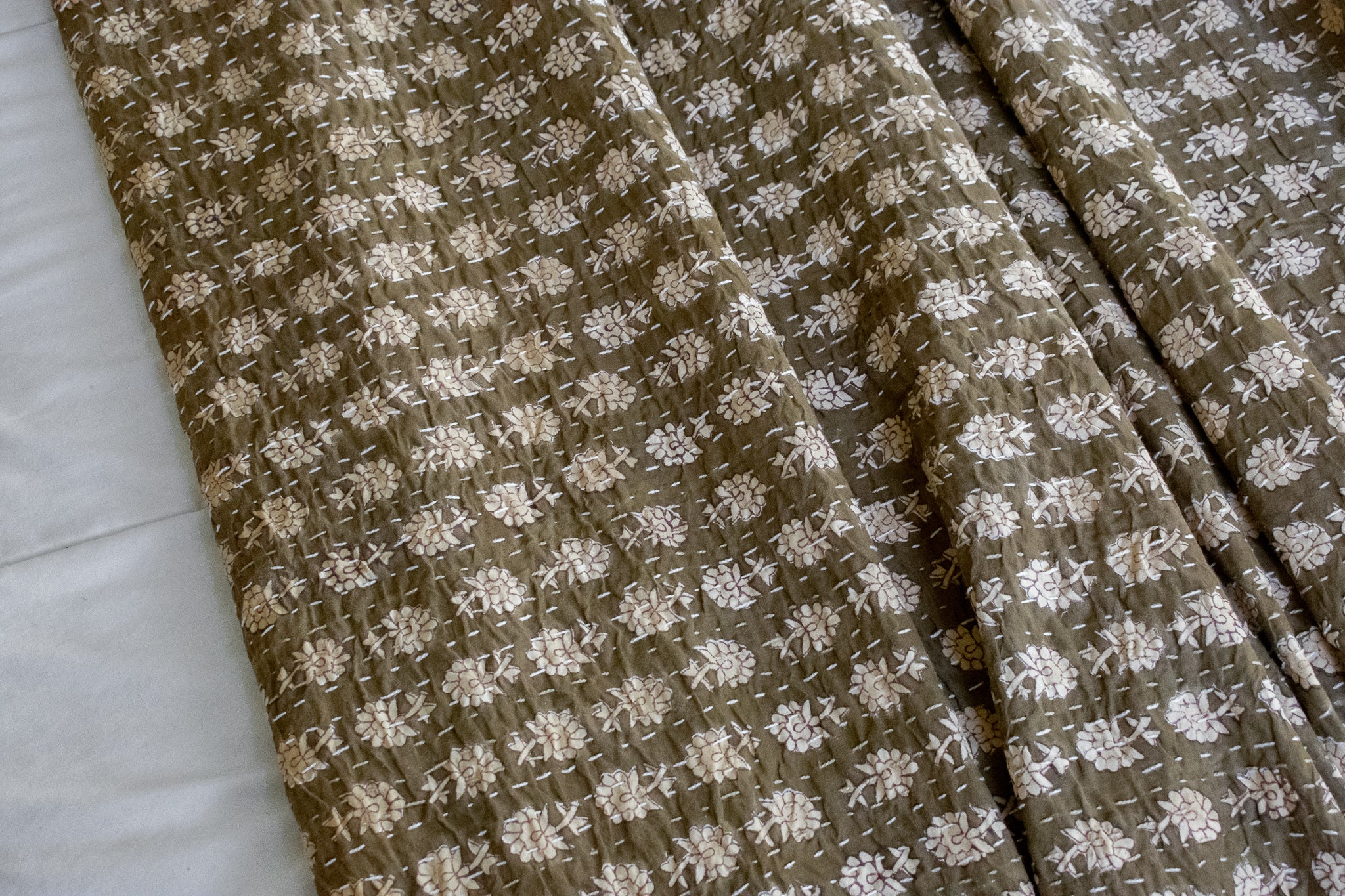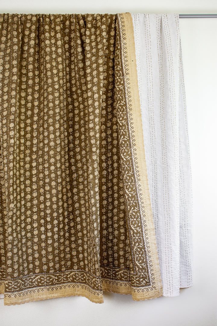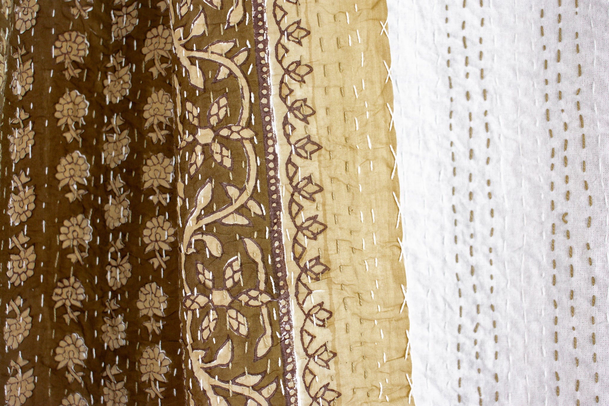 Our large, gorgeous, heirloom quality hand block printed quilts fit beautifully on both King and Queen sized beds. They are a lightweight coverlet-style, giving them a nice drape, and perfect for layering or standing on their own. Two thin layers of cotton fabric are stitched together with hundreds of "kantha" stitches, a centuries-old Bengali tradition of hand stitching. Each quilt is a true labor of love.
