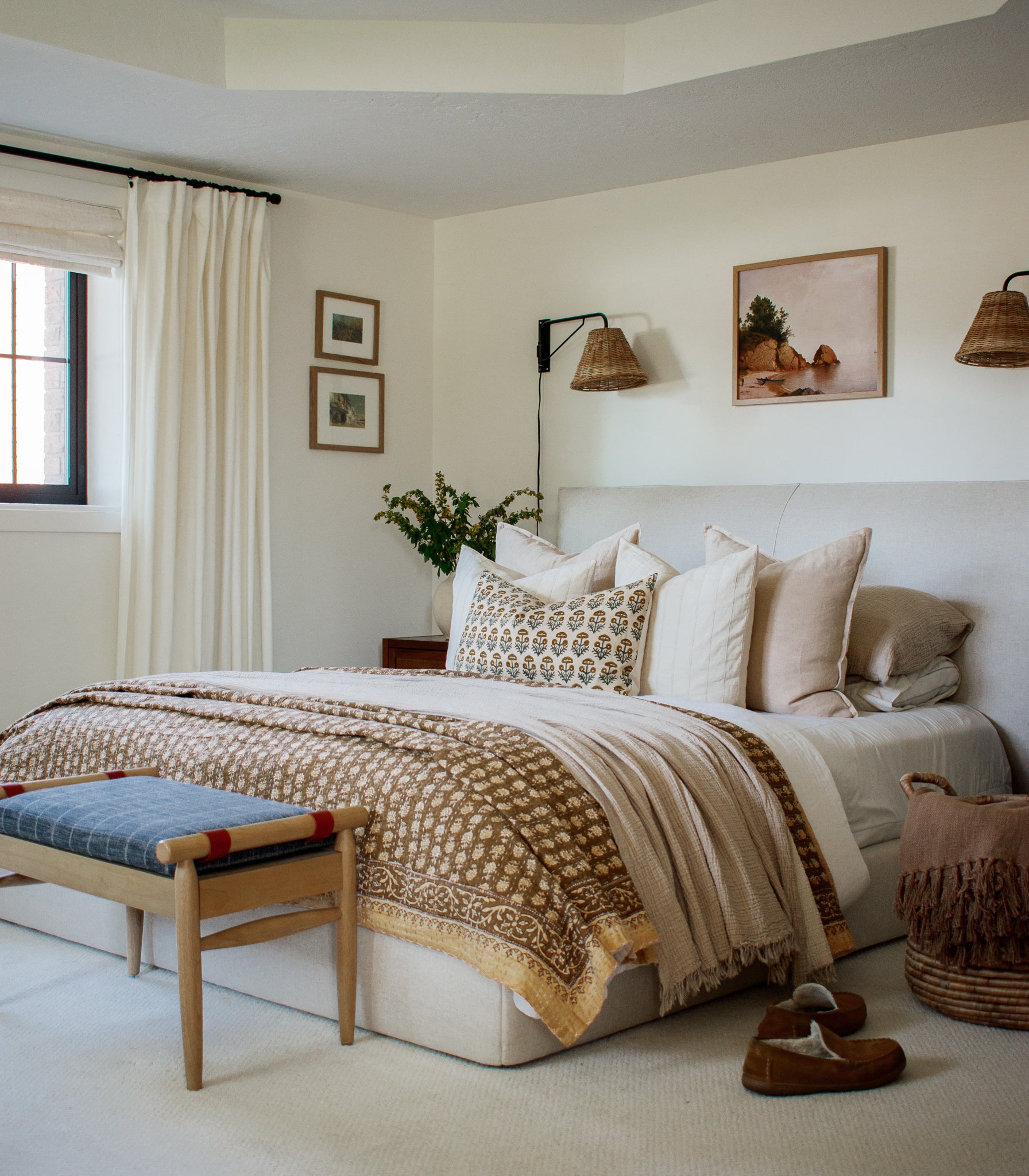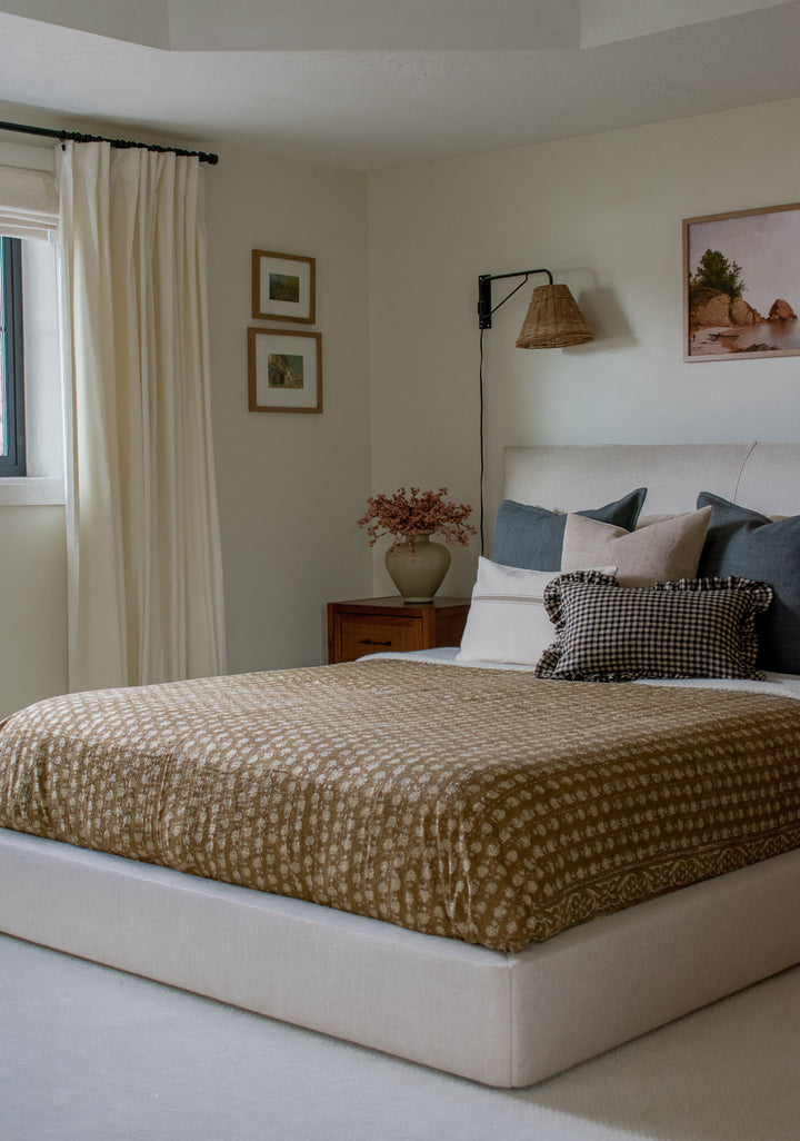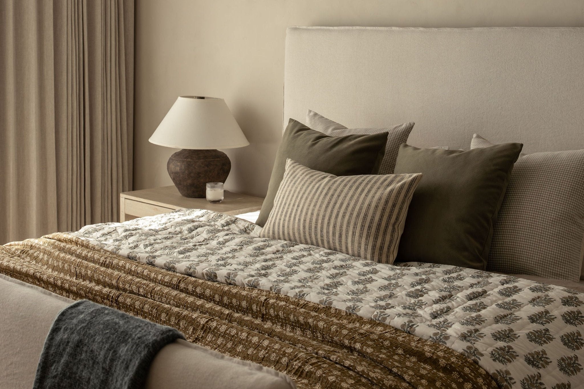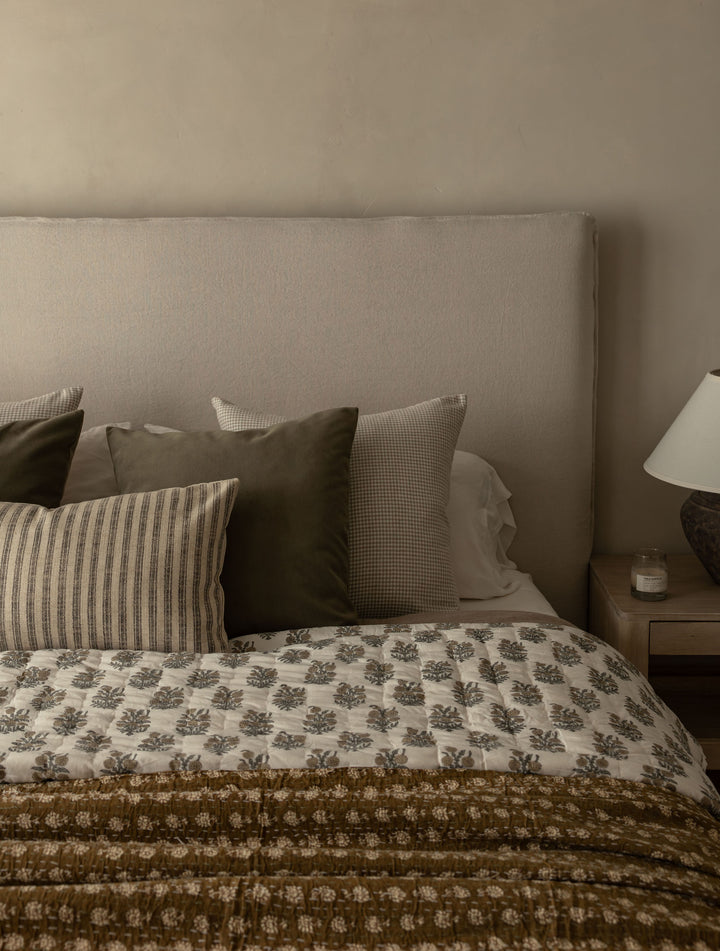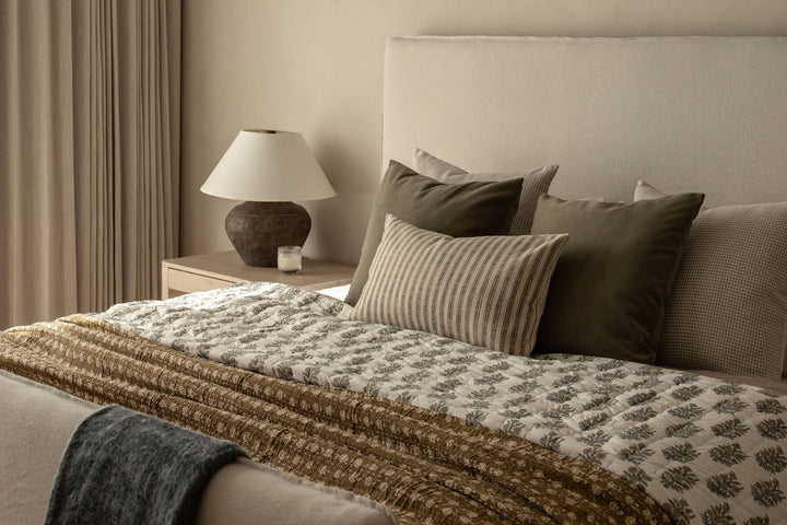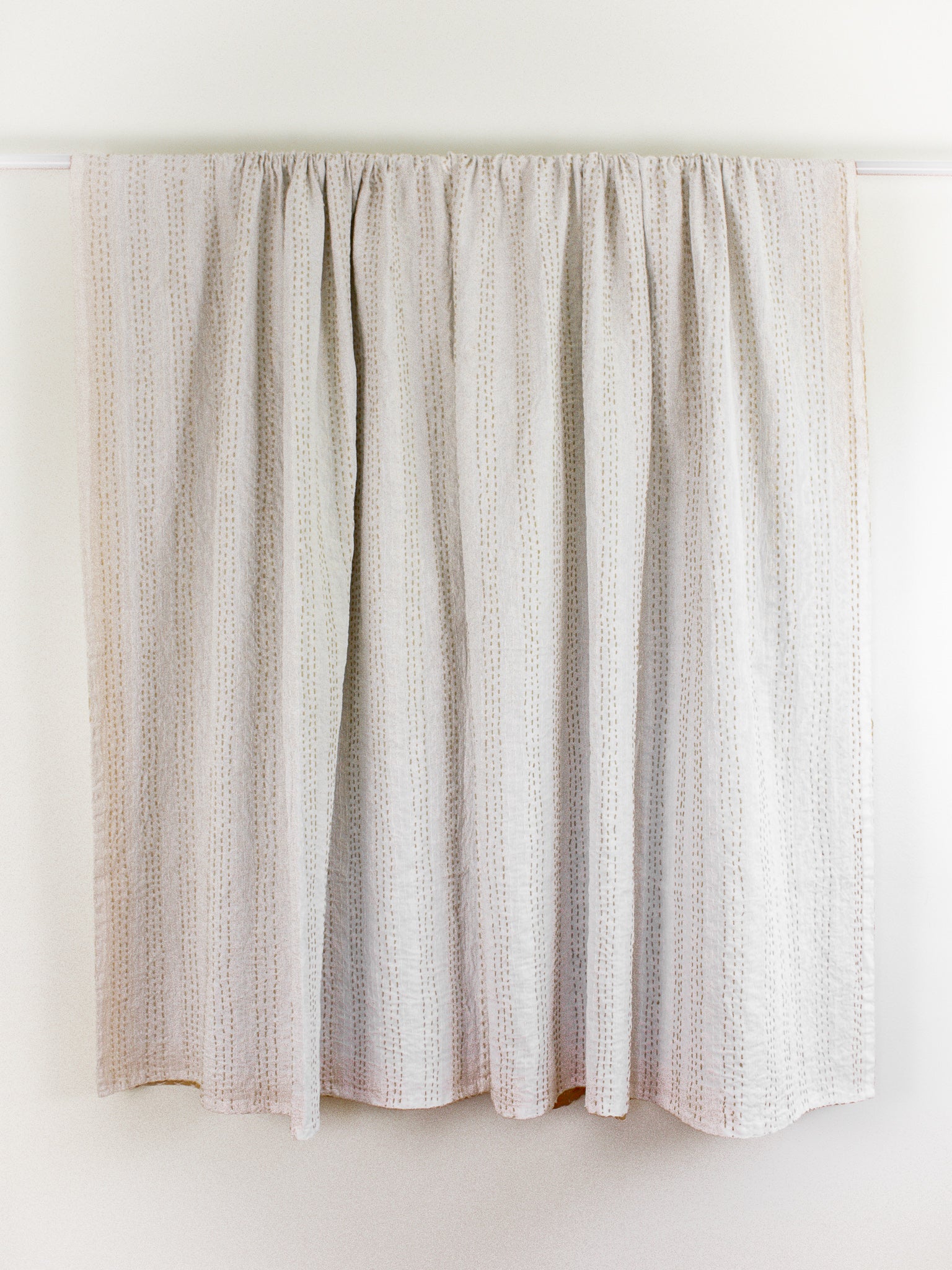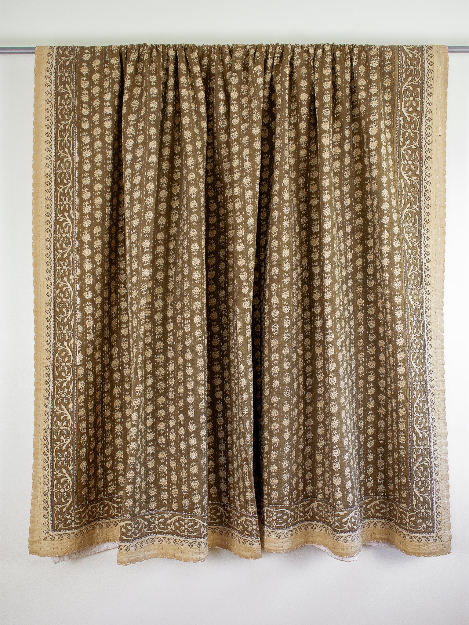 Our large, gorgeous, heirloom quality hand block printed quilts fit beautifully on both King and Queen sized beds. They are a lightweight coverlet-style, giving them a nice drape, and perfect for layering or standing on their own. Two thin layers of cotton fabric are stitched together with hundreds of "kantha" stitches, a centuries-old Bengali tradition of hand stitching. Each quilt is a true labor of love.