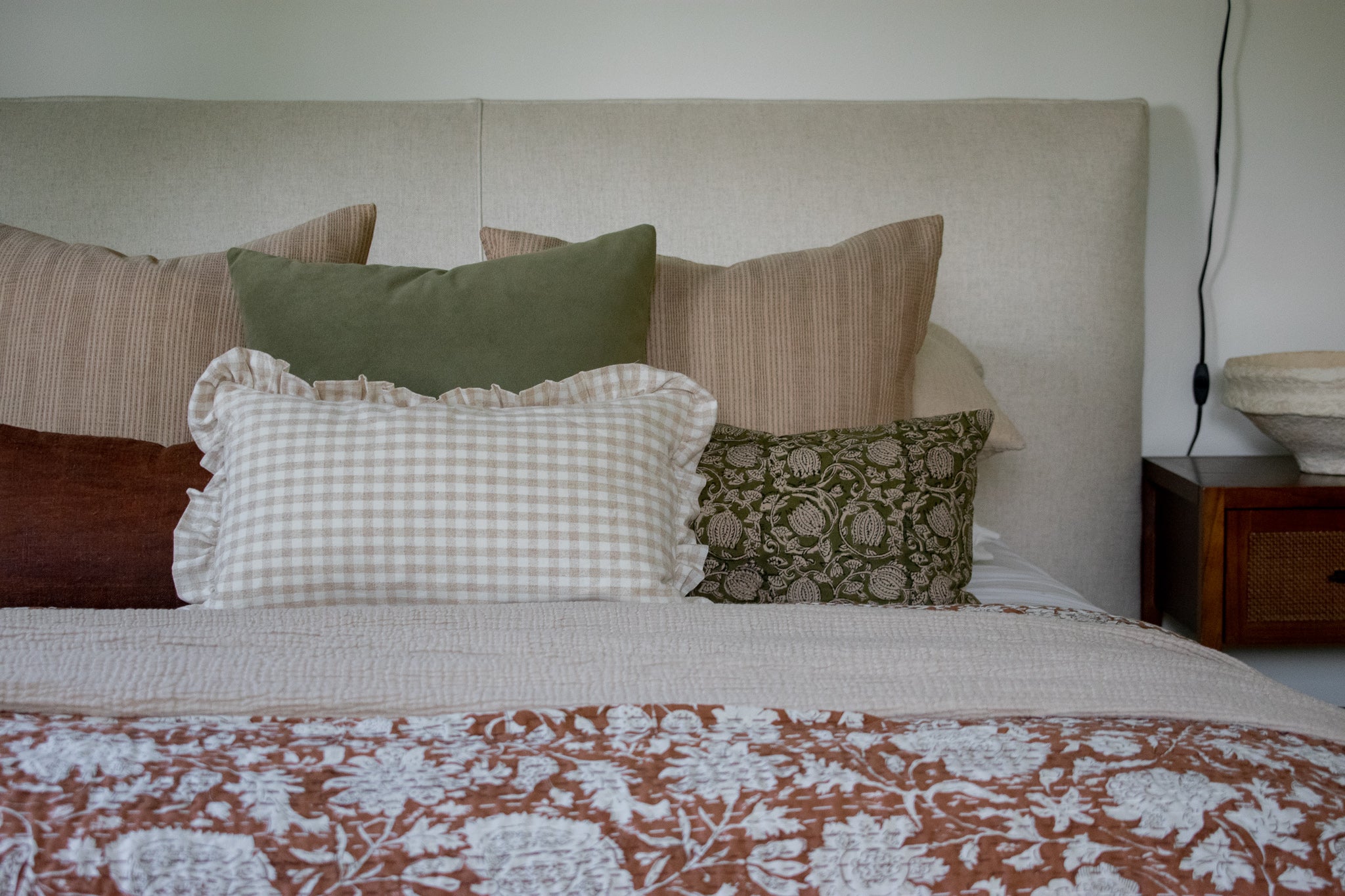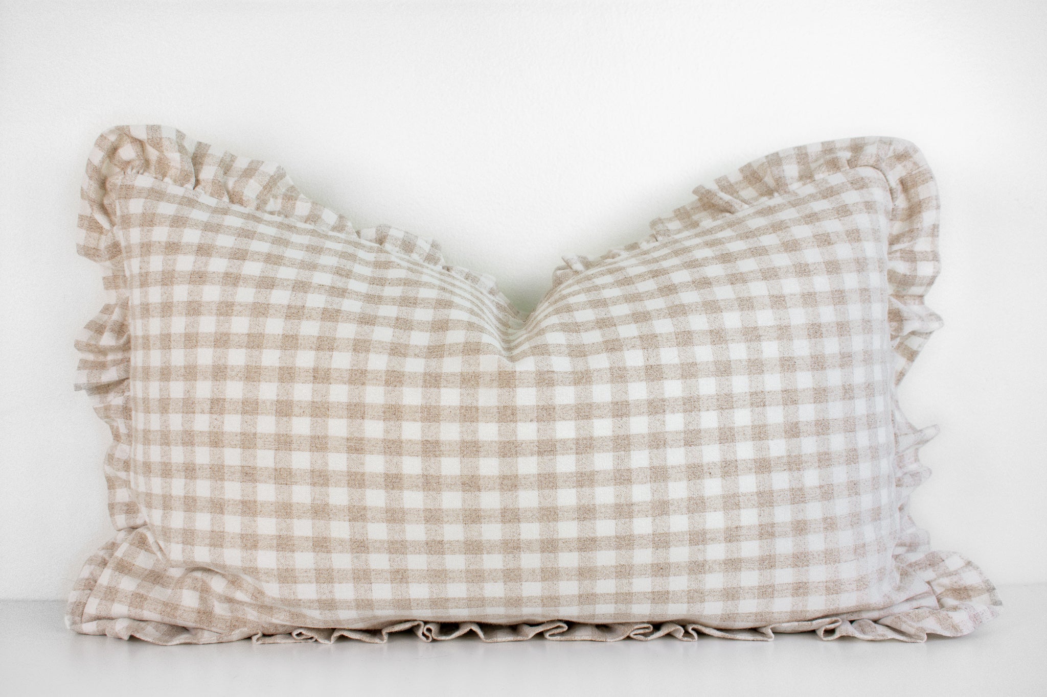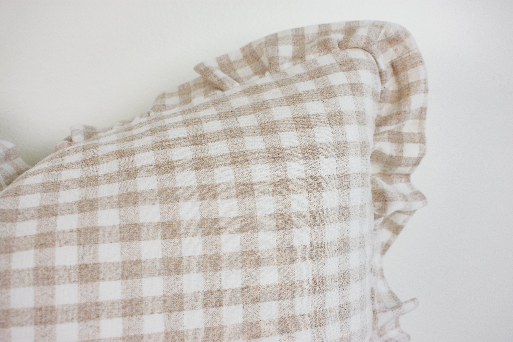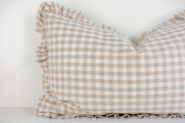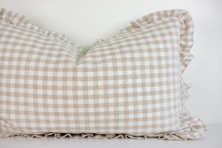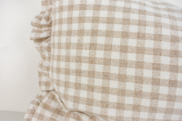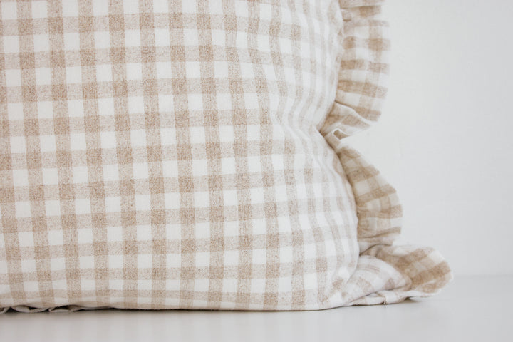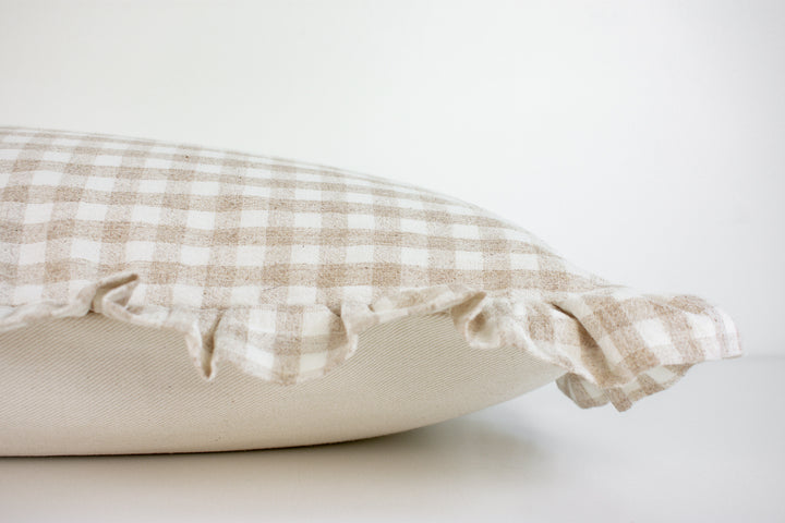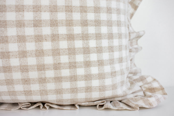 Hmong Organic Woven Pillow Cover - Ruffle Edge Gingham - Beige and Ivory