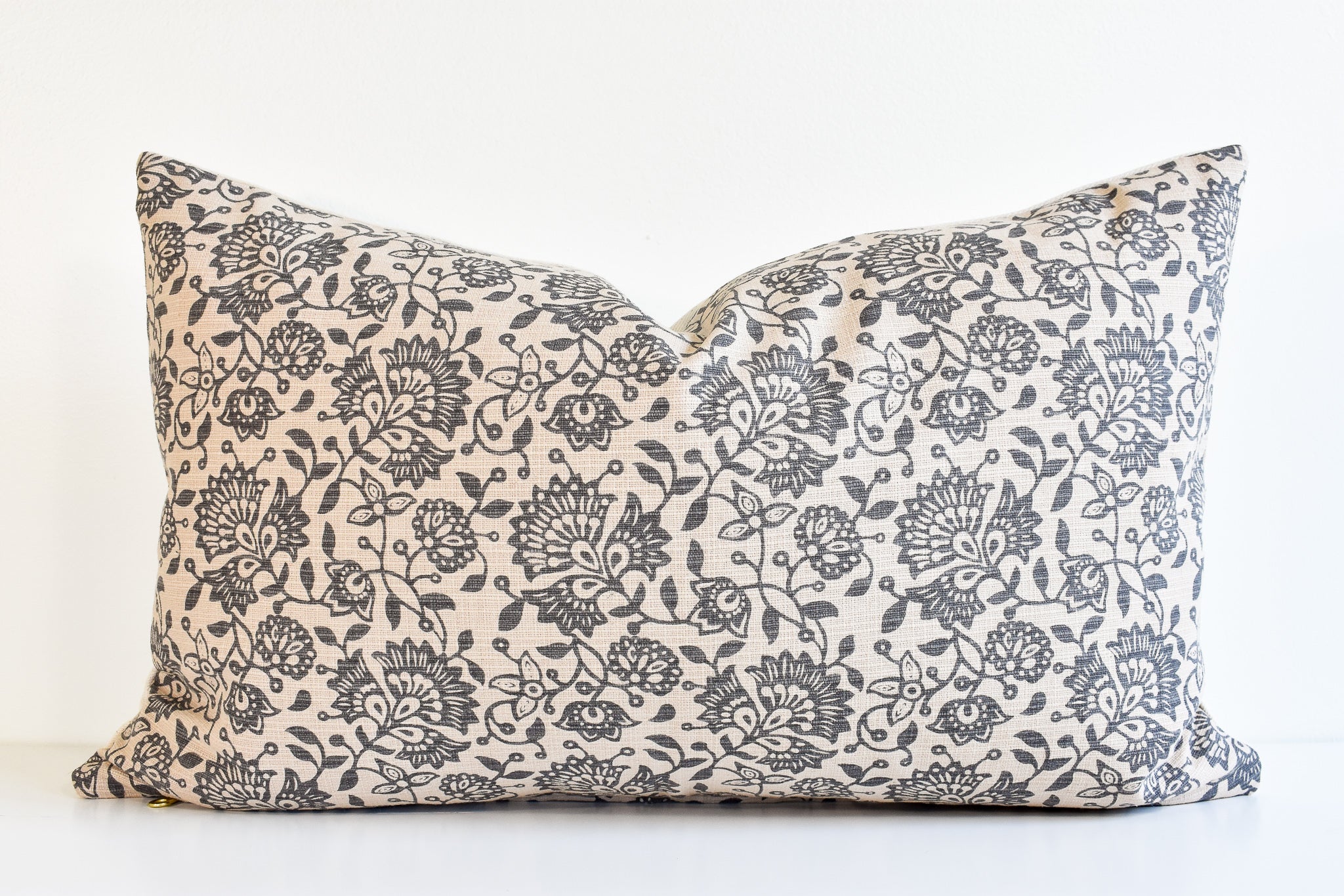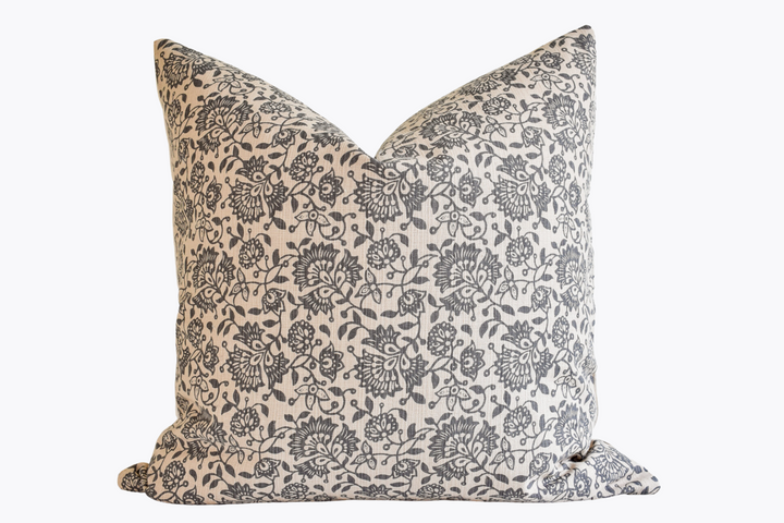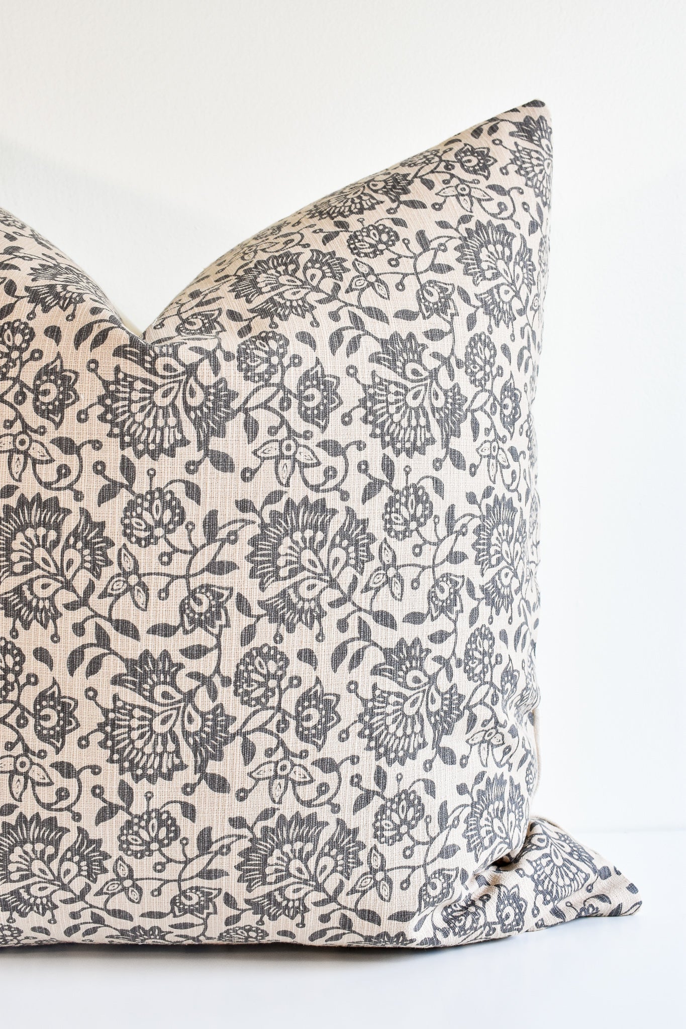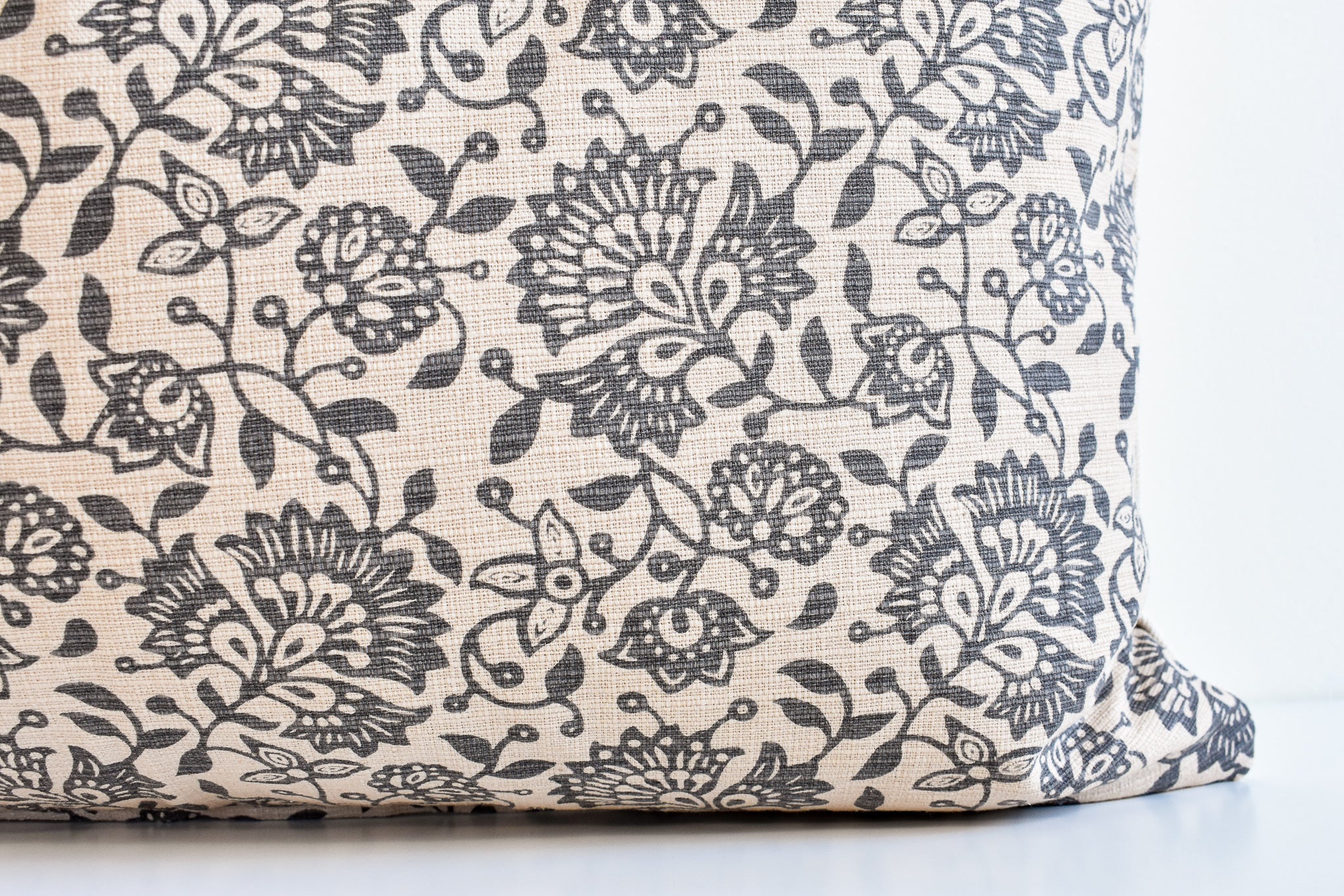 Hmong Floral Block Print Pillow Cover - Cream and Pewter