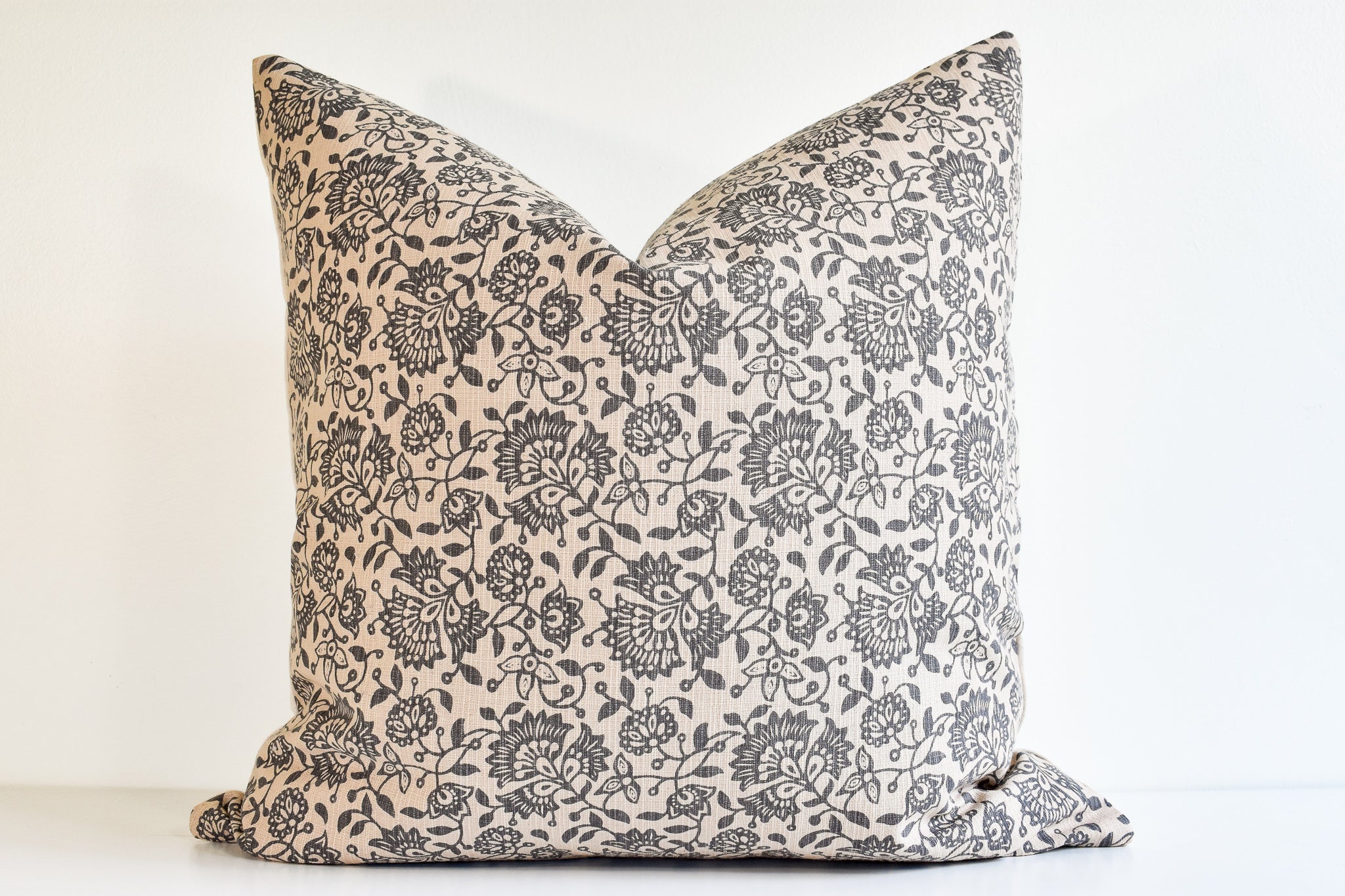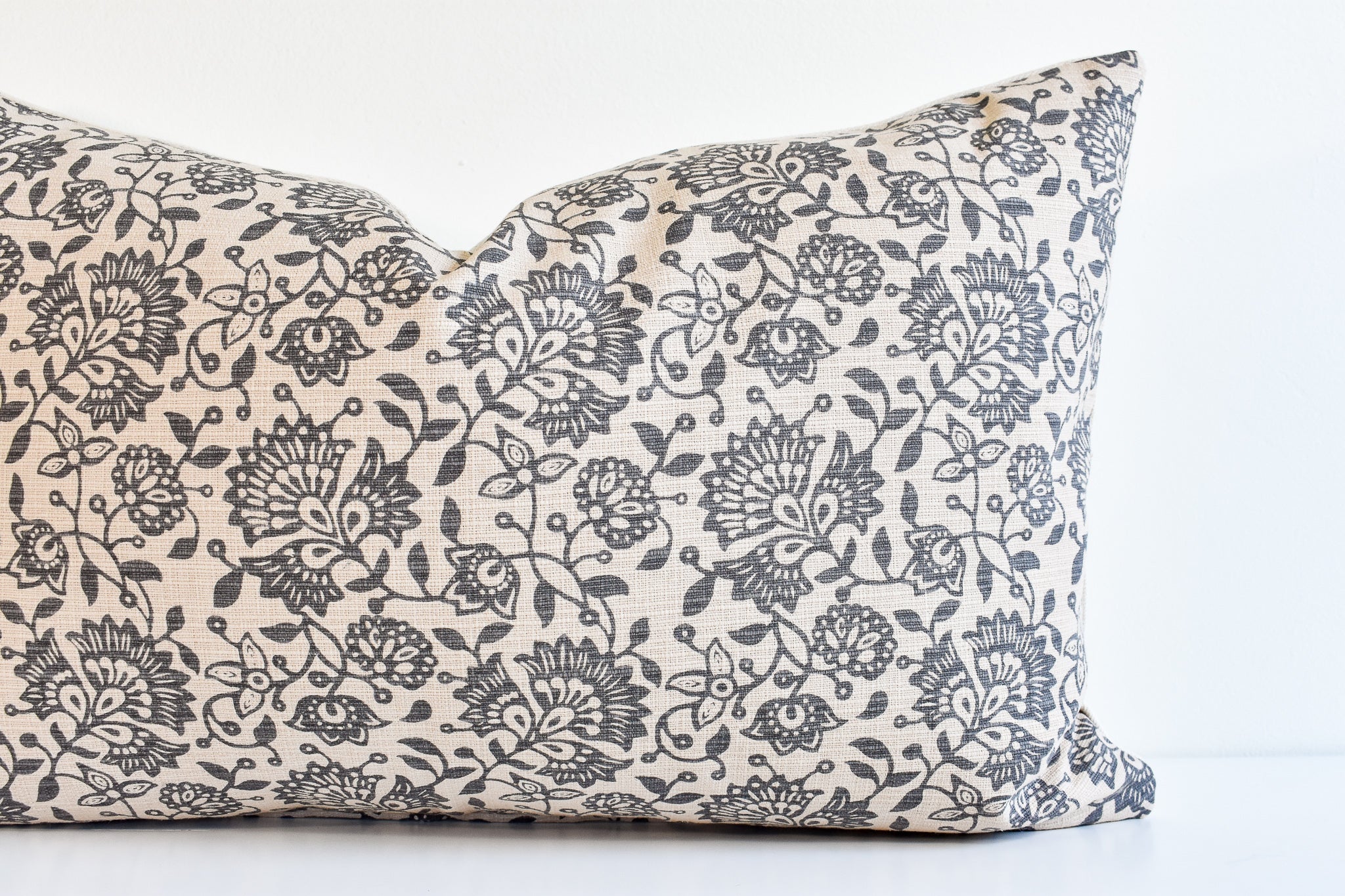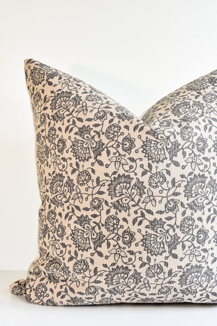Hmong Floral Block Print Pillow Cover - Cream and Pewter