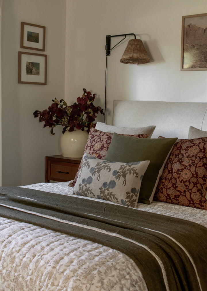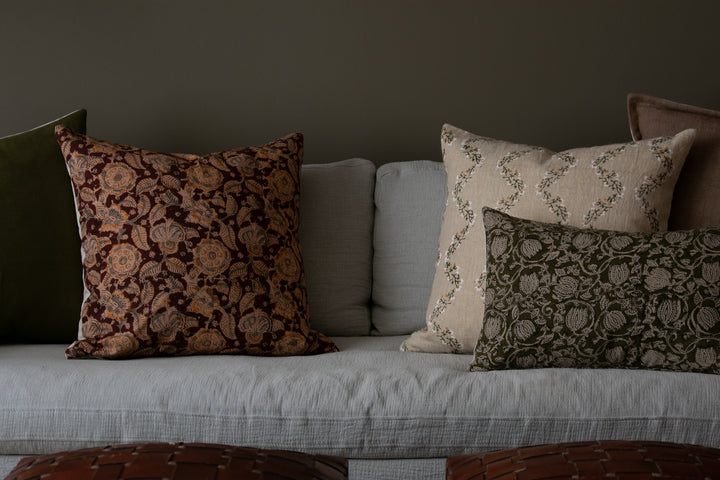 Our Indian Block Print Pillows are a true labor of love. We designed each one and had them hand block printed by our talented artisans on luxuriously soft, 100% natural linen. Their rich colors and intricate details elevate any space and add a gorgeous cultural dimension to any room!