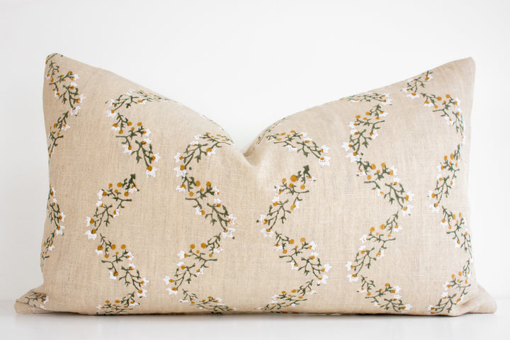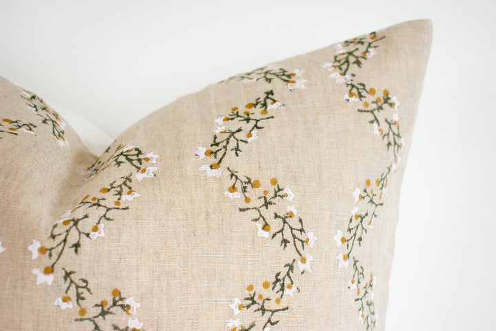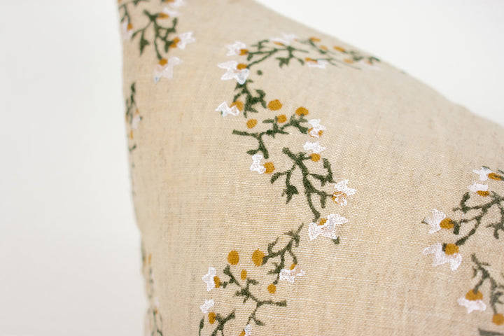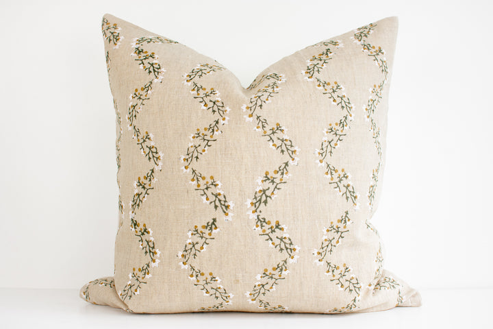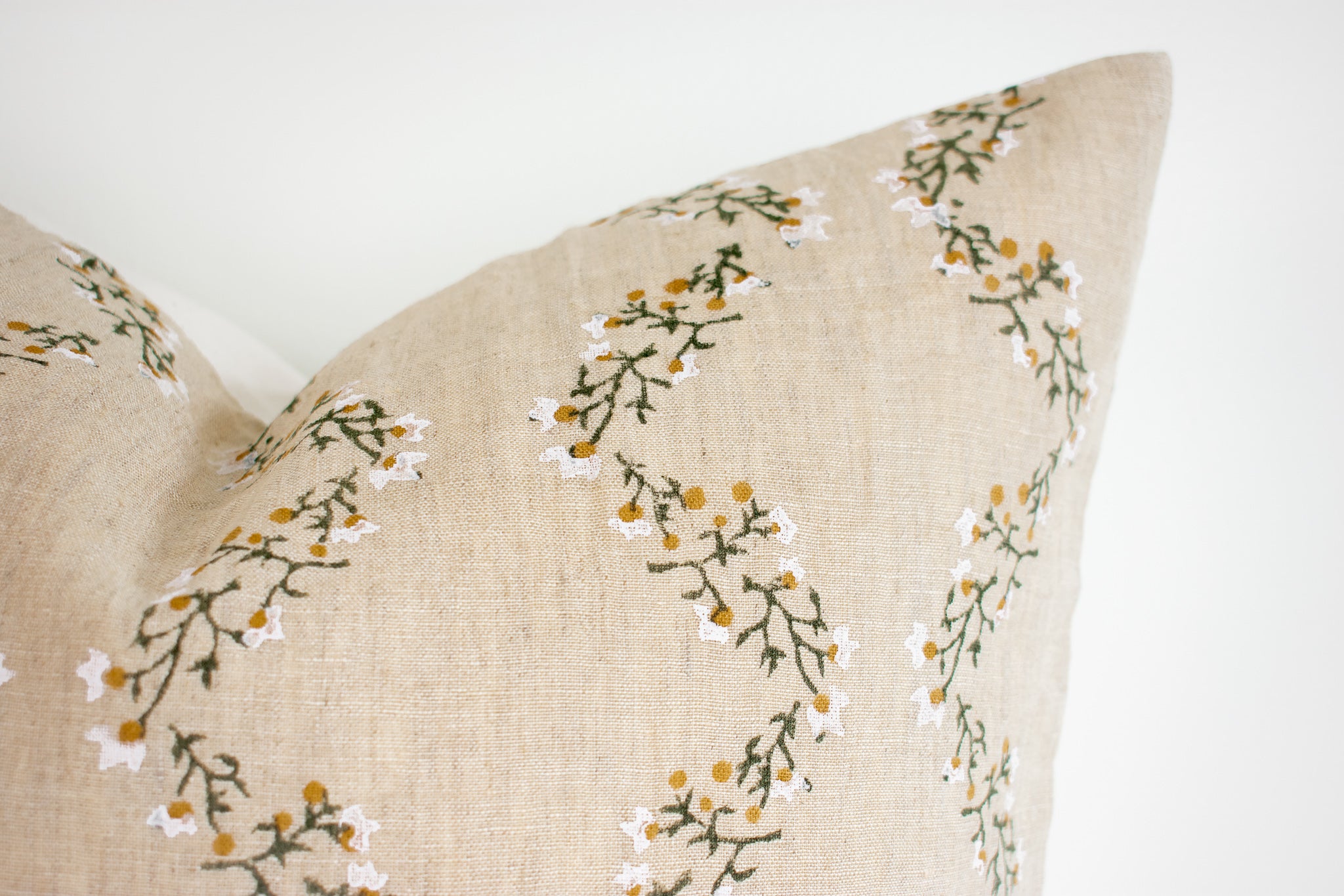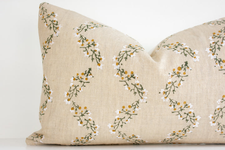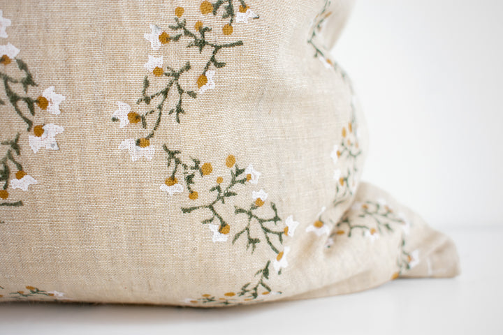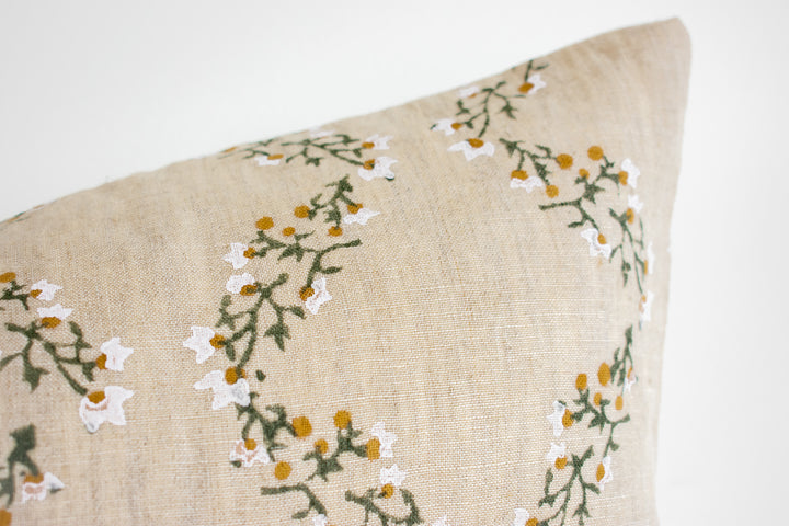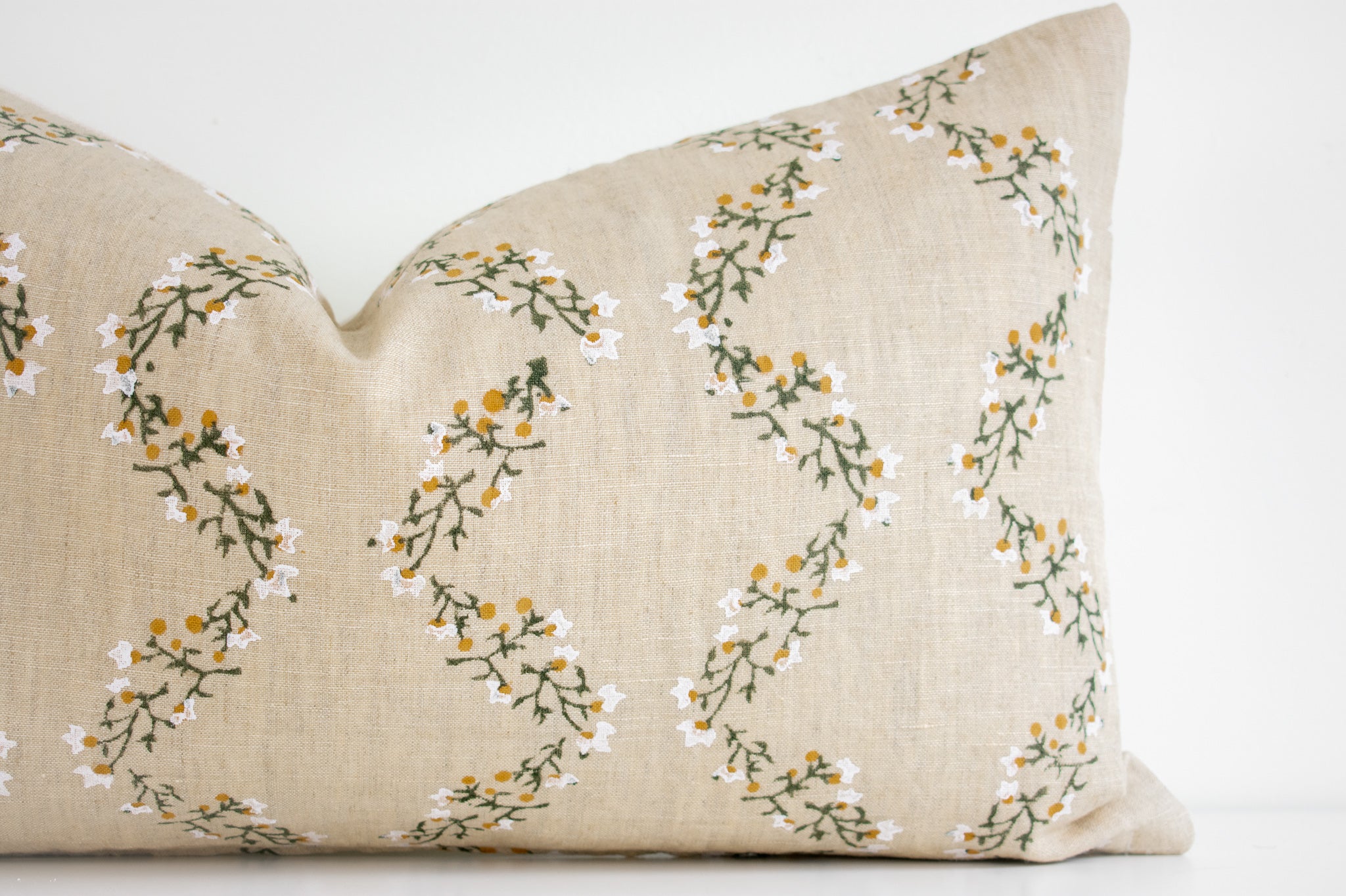 Indian Block Print Pillow Cover - Faded Gold, Olive, Ivory Scallop