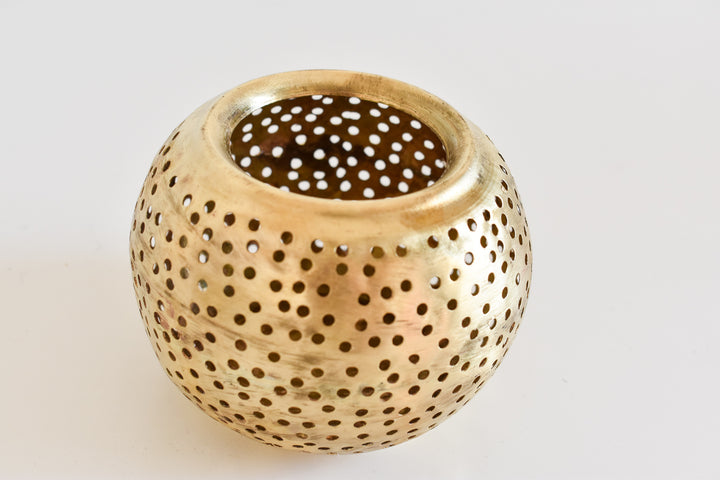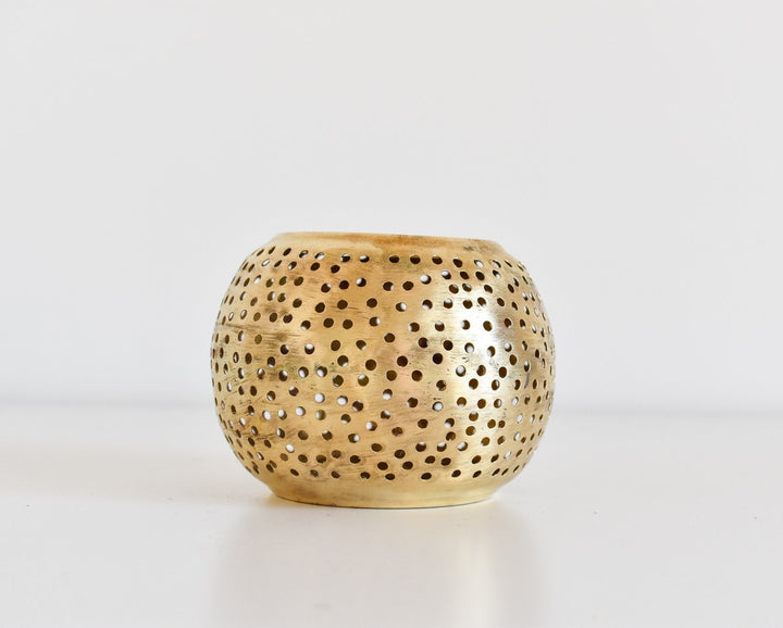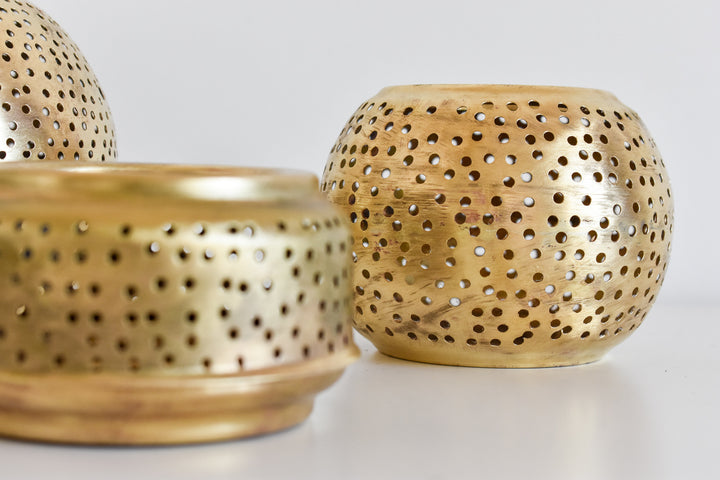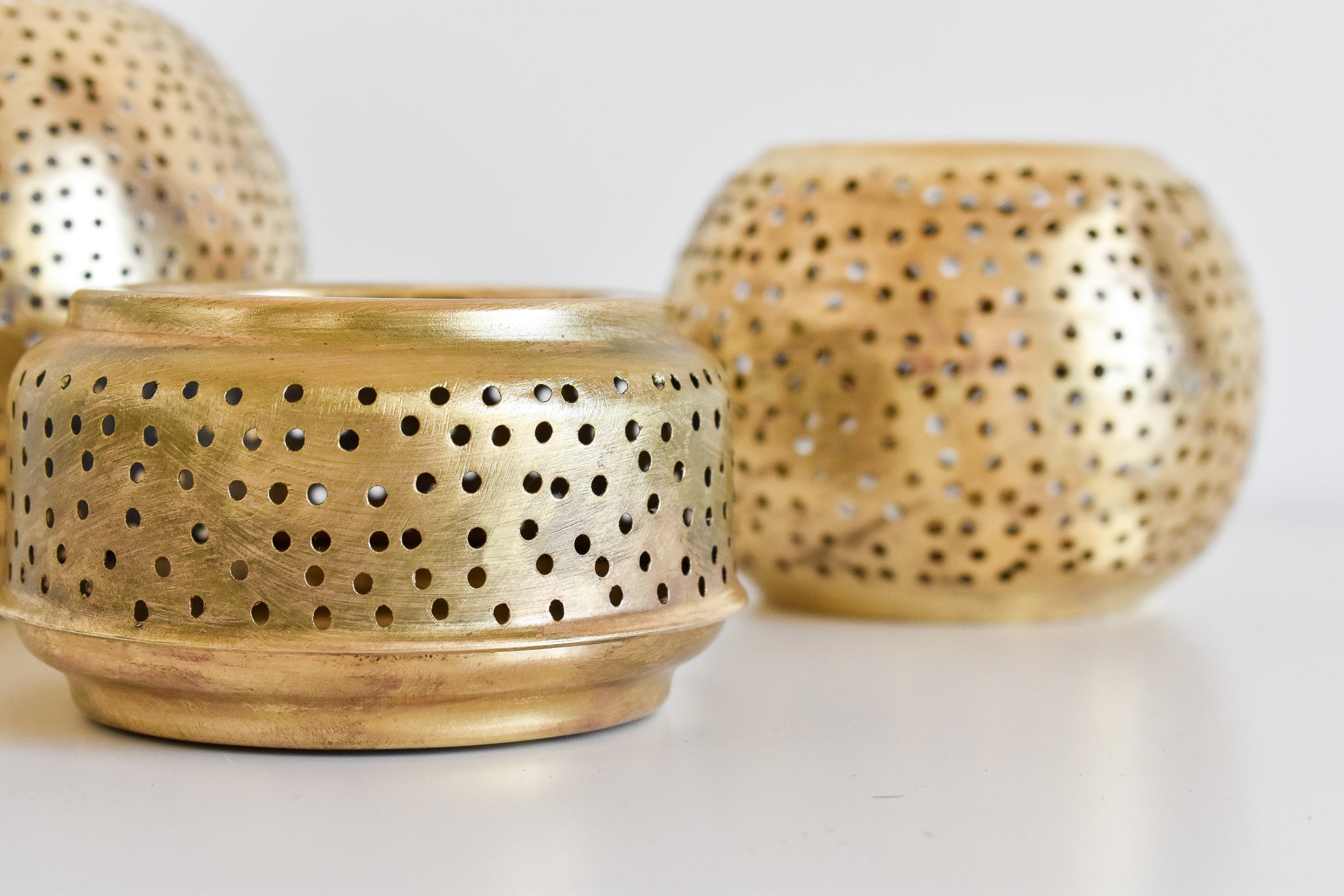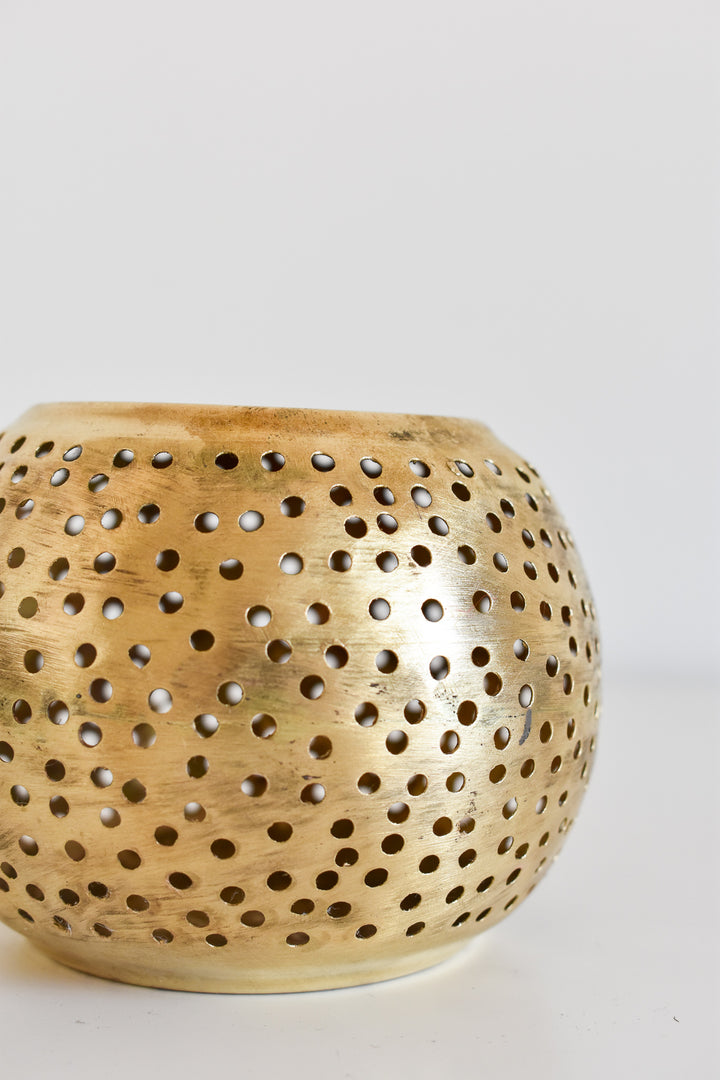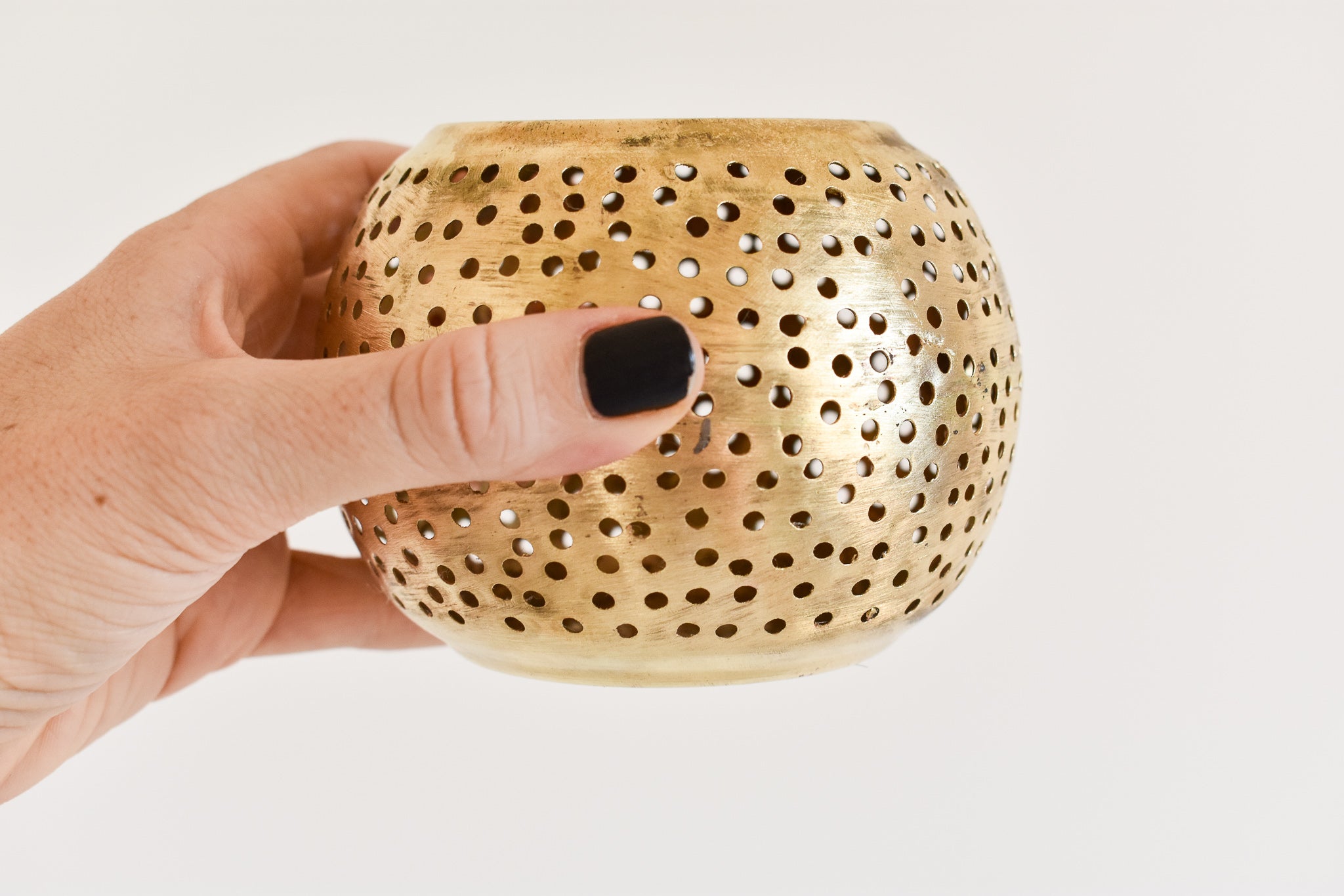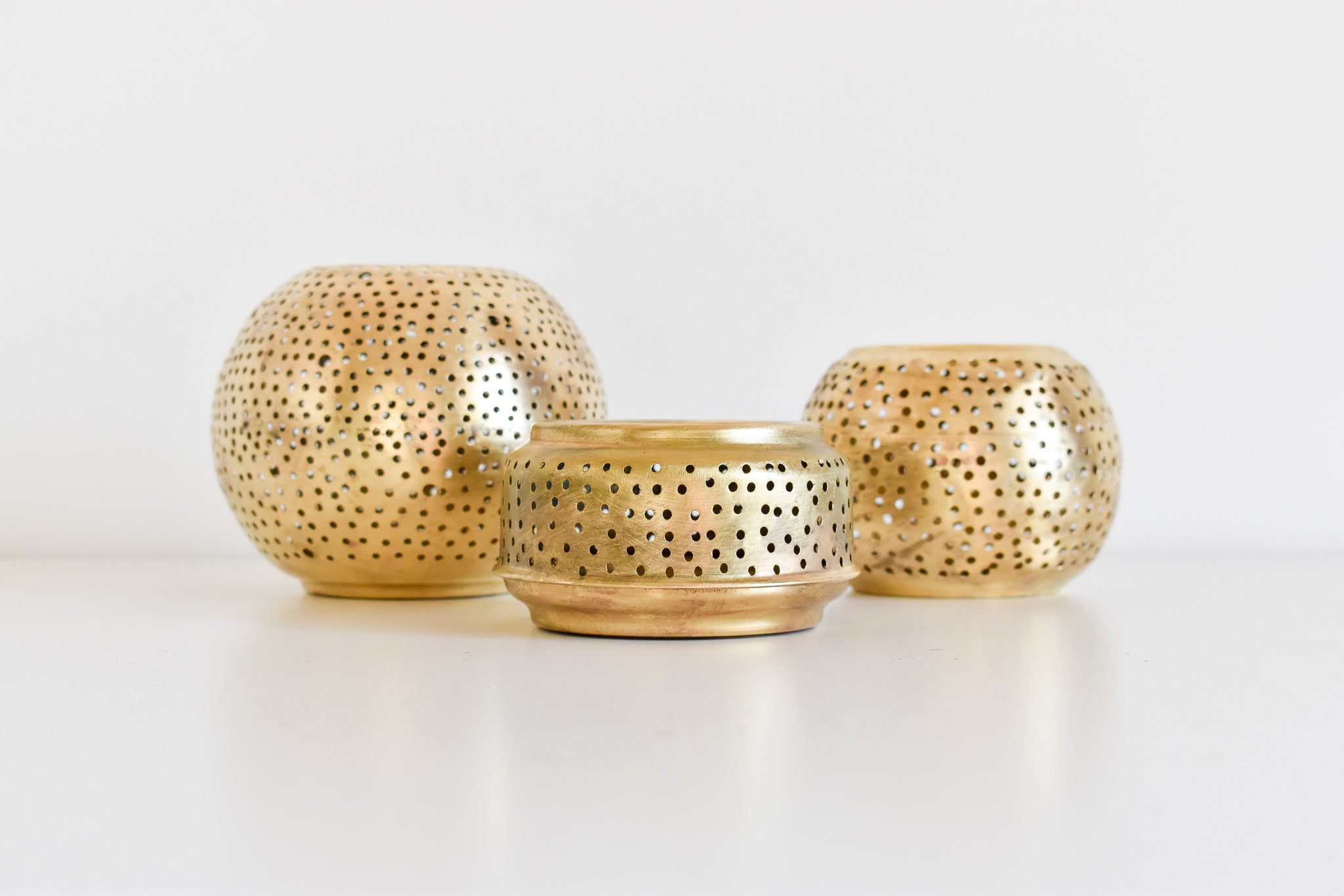 Hand crafted in Morocco, our brass candle holders are full of rich charm and character. These gorgeous, one of a kind pieces add a pop of texture and rich color to any space. Each is perfectly imperfect, and can be used in a myriad of ways. On a nightstand, coffee table, book shelf, with or without a candle, they are sure to brighten and beautify any space!