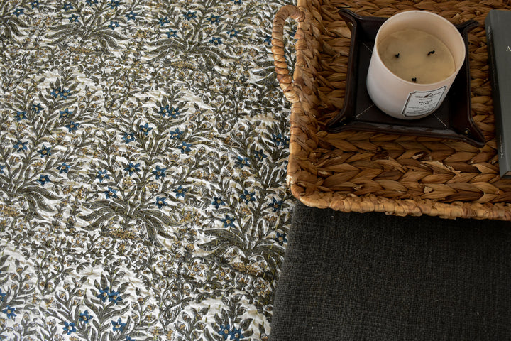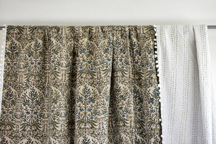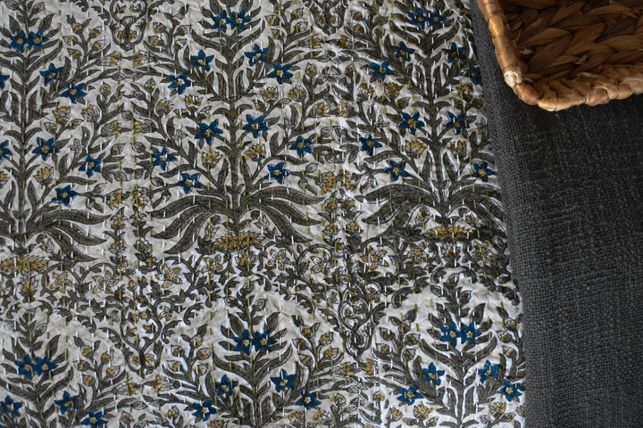Our large, gorgeous, heirloom quality hand block printed quilts fit beautifully on both King and Queen sized beds. They are a lightweight coverlet-style, giving them a nice drape, and perfect for layering or standing on their own. Two thin layers of cotton fabric are stitched together with hundreds of "kantha" stitches, a centuries-old Bengali tradition of hand stitching. Each quilt is a true labor of love.