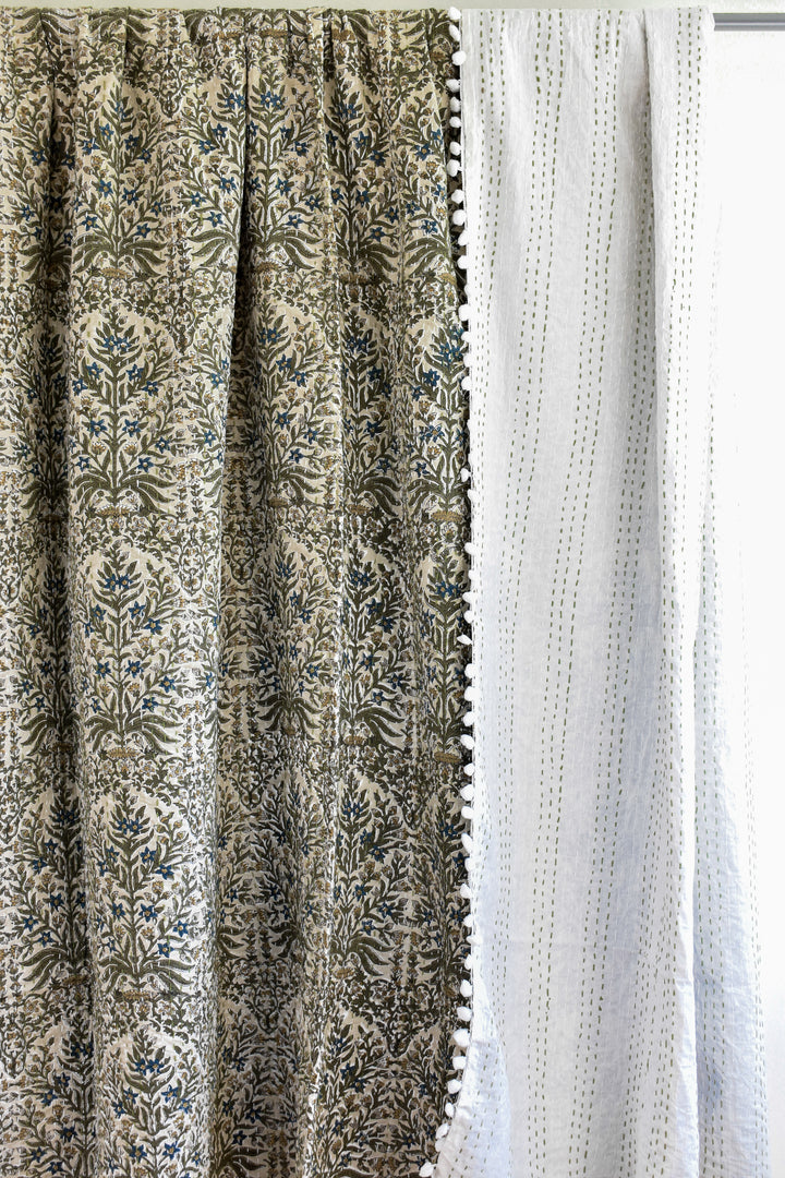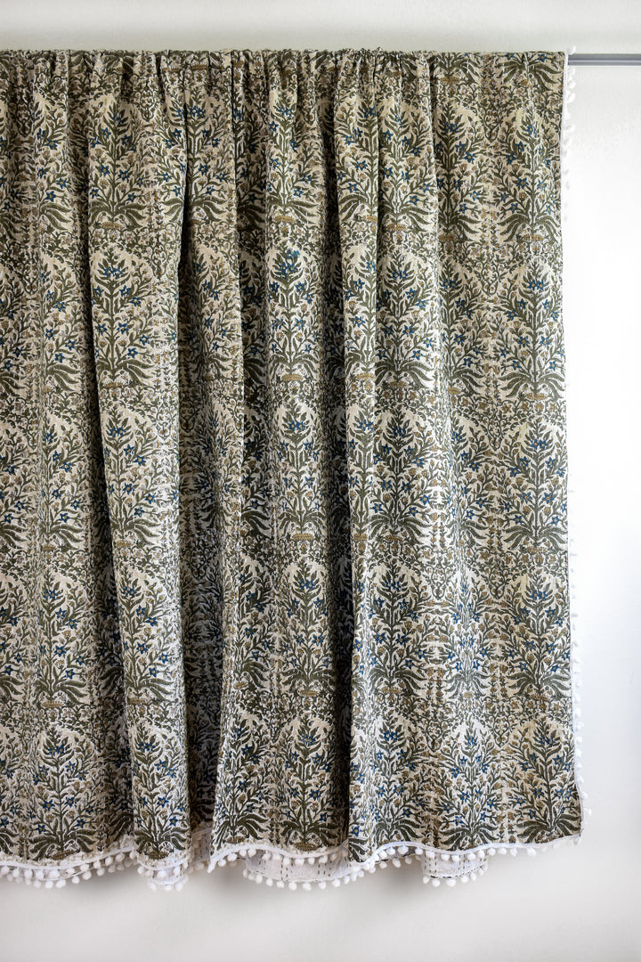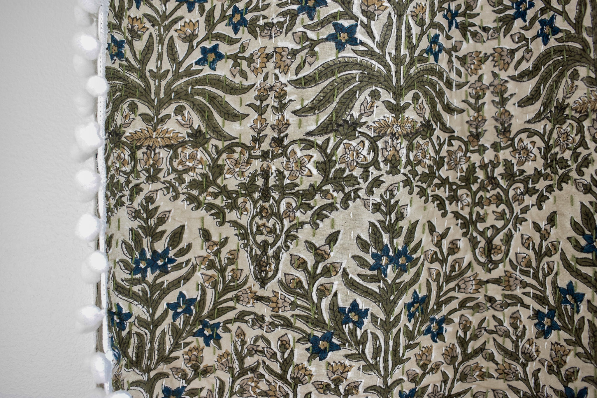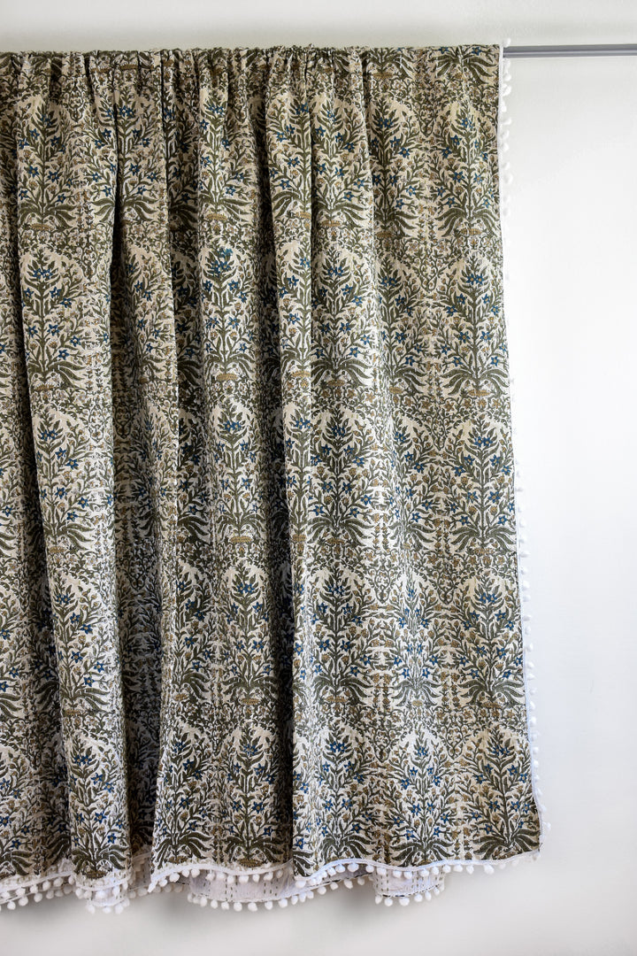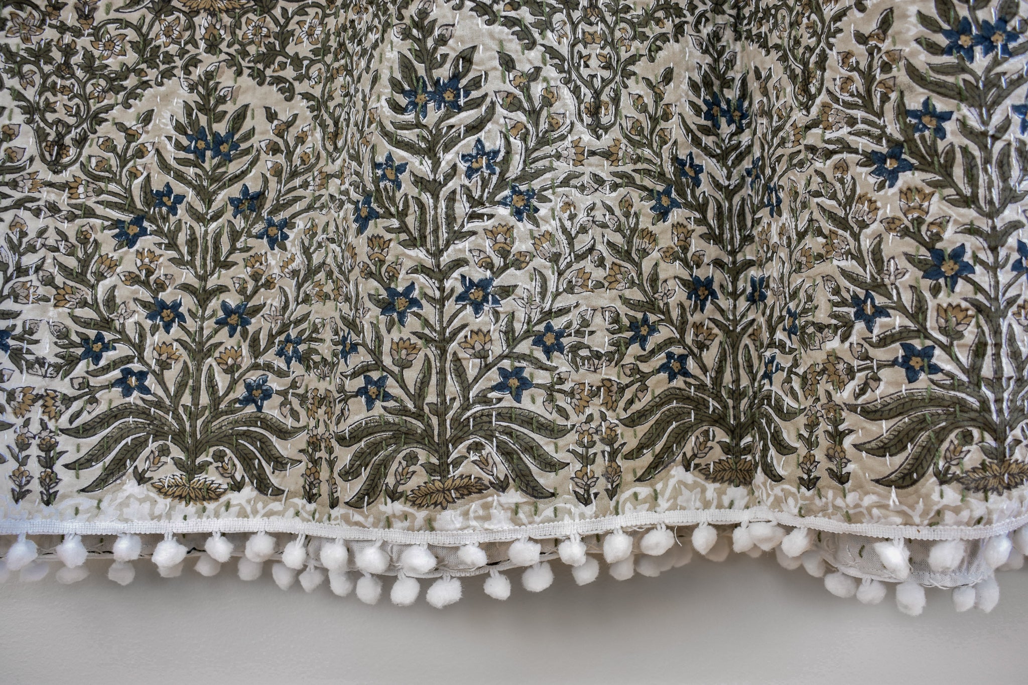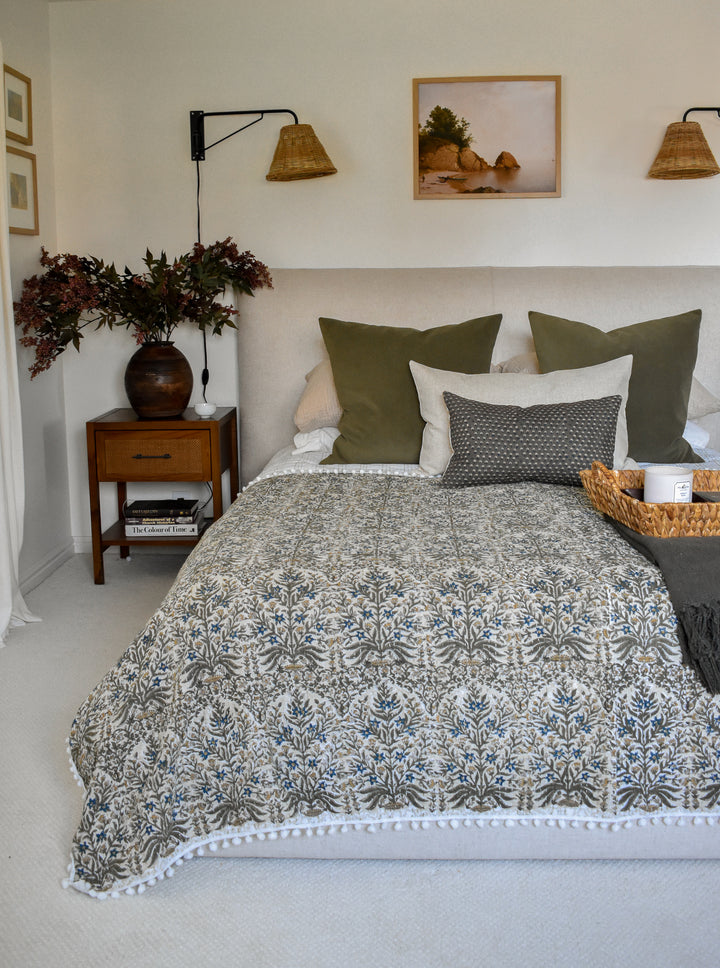 The Lucy Pom Pom Kantha Quilt in Beige, Olive, Ochre and Indigo - King/Queen Sized