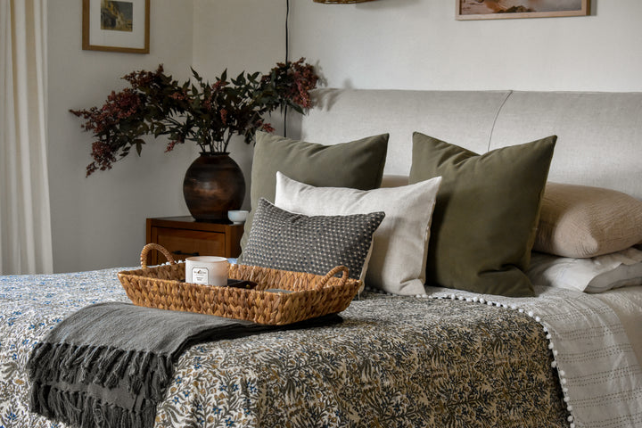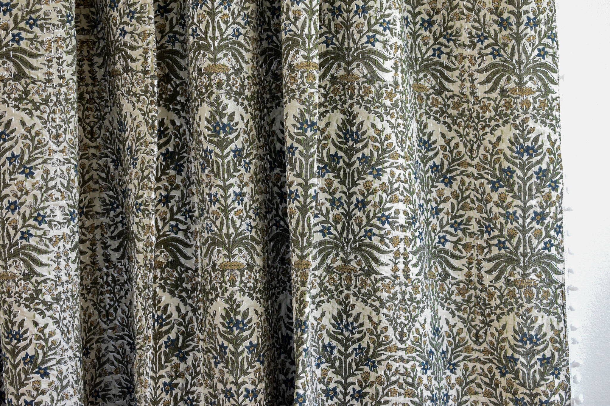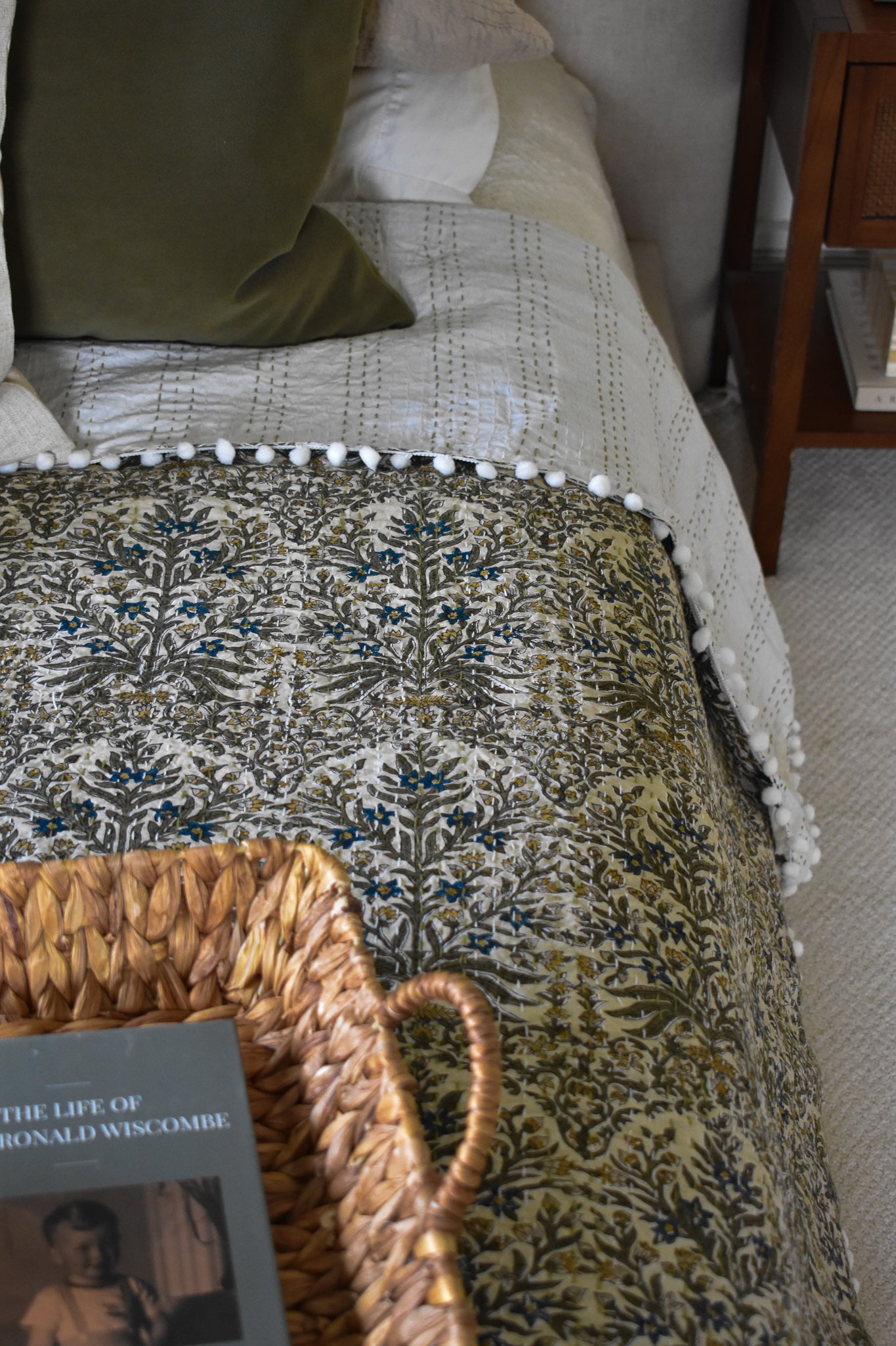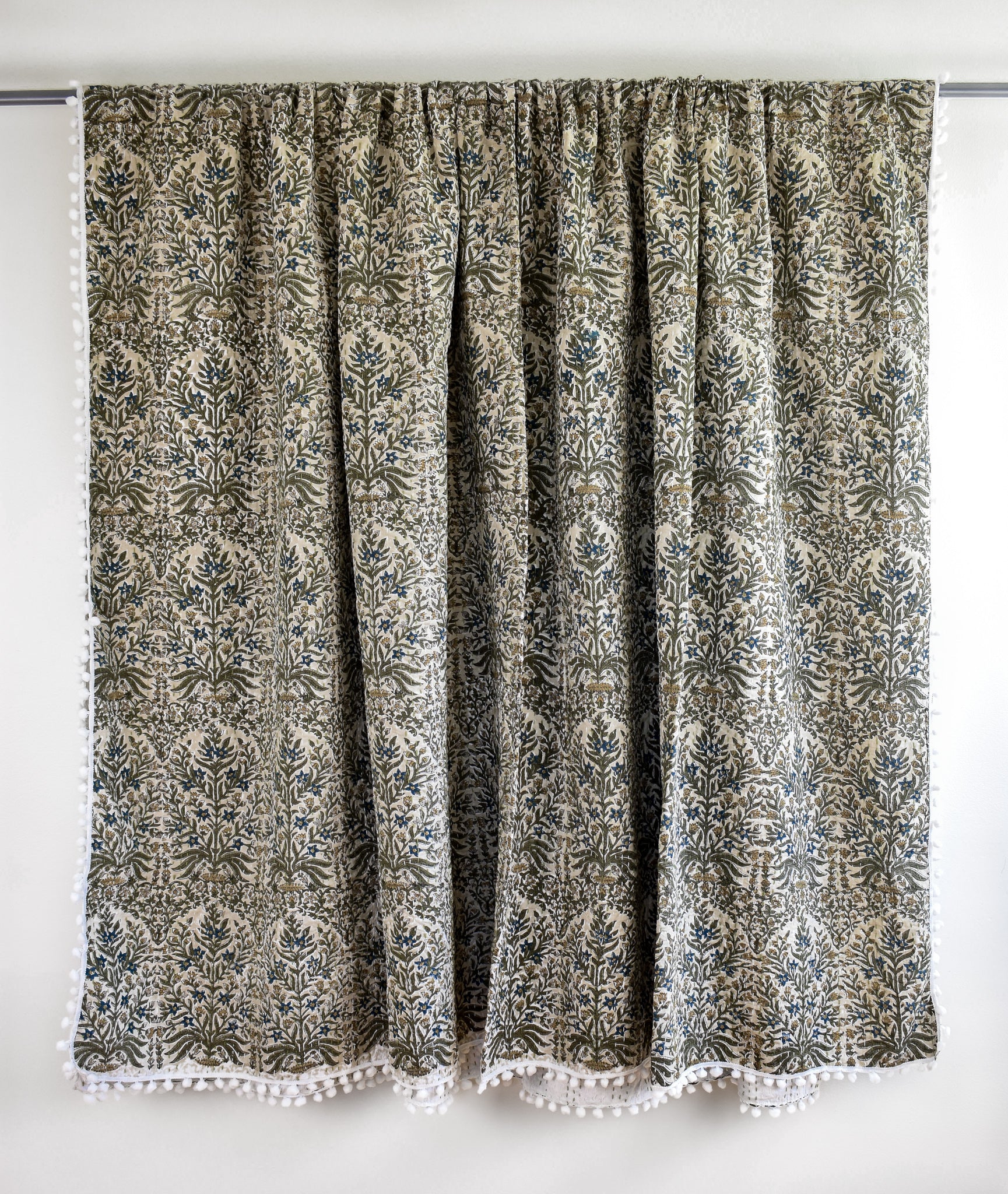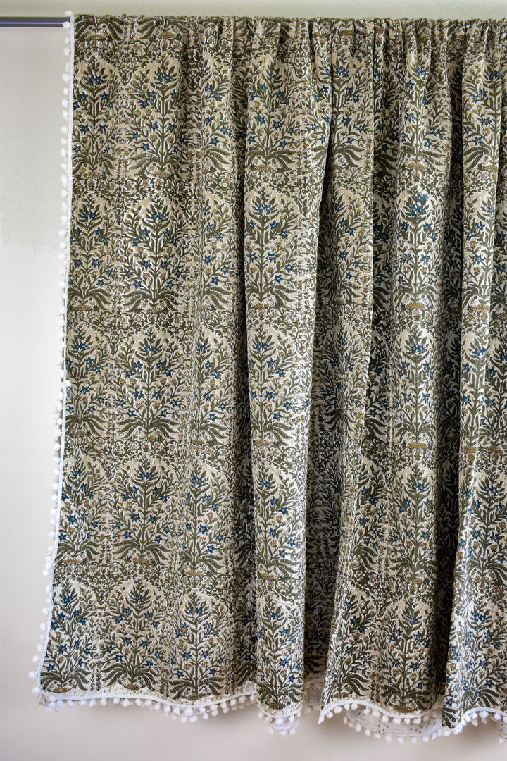 The Lucy Pom Pom Kantha Quilt in Beige, Olive, Ochre and Indigo - King/Queen Sized
