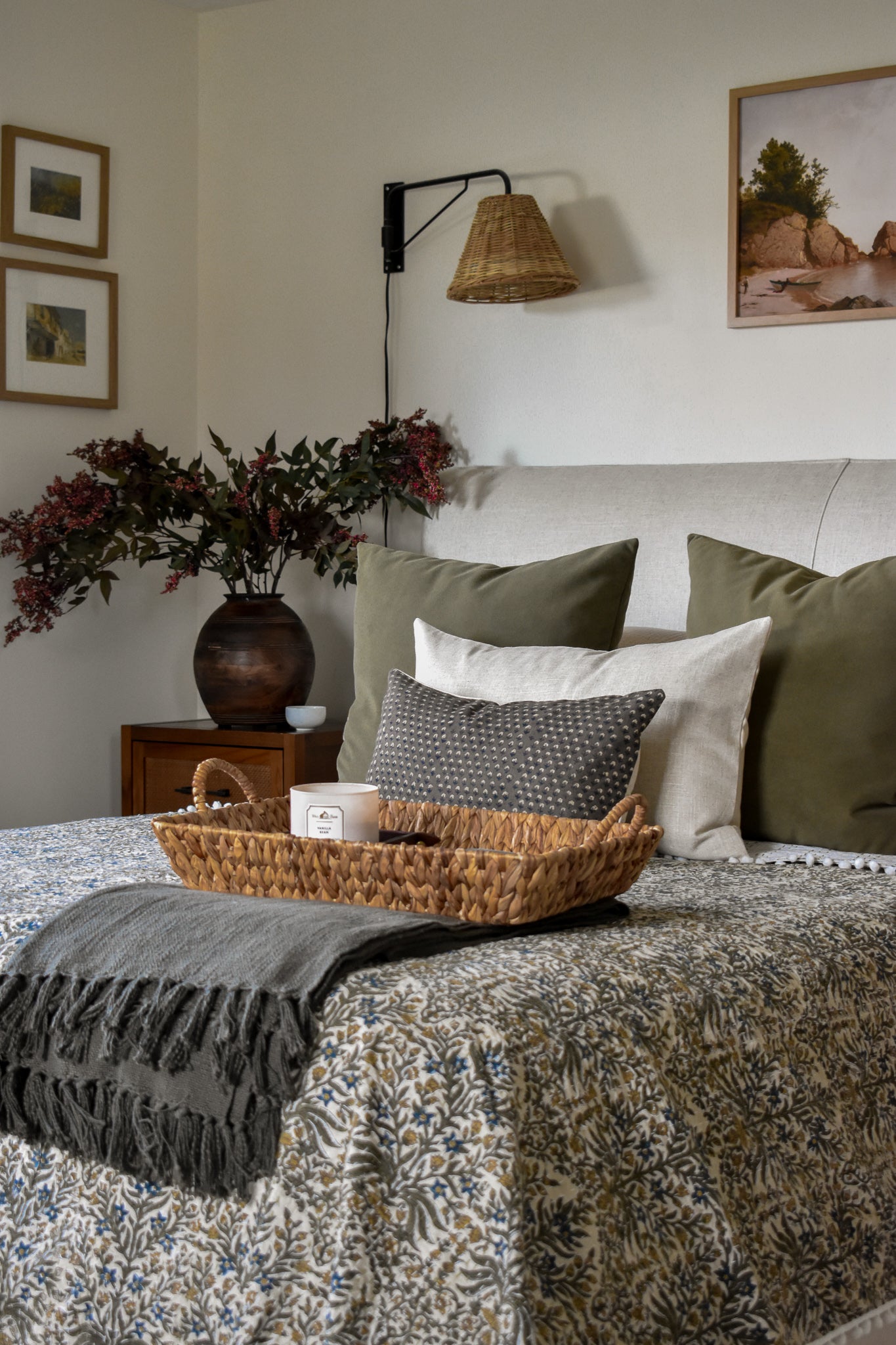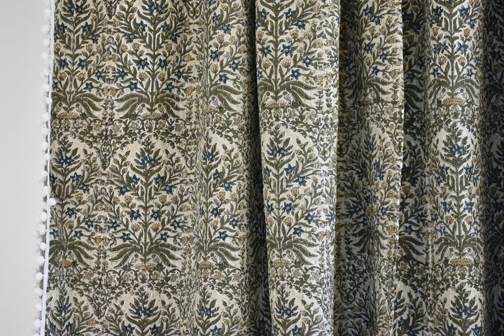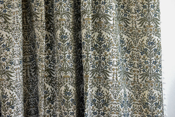 Colors: Olive, ochre, taupe, indigo, brown block print on a light beige background