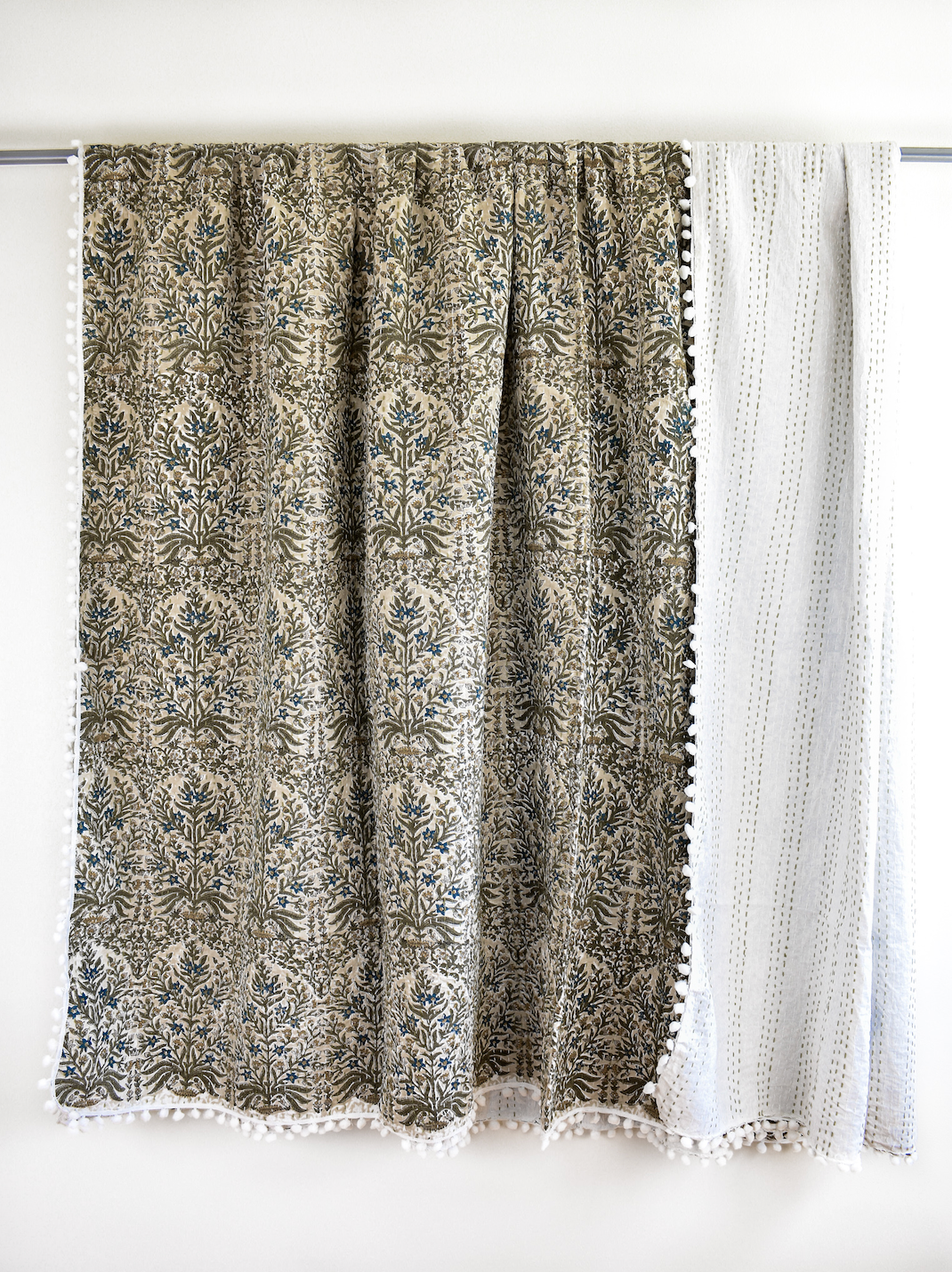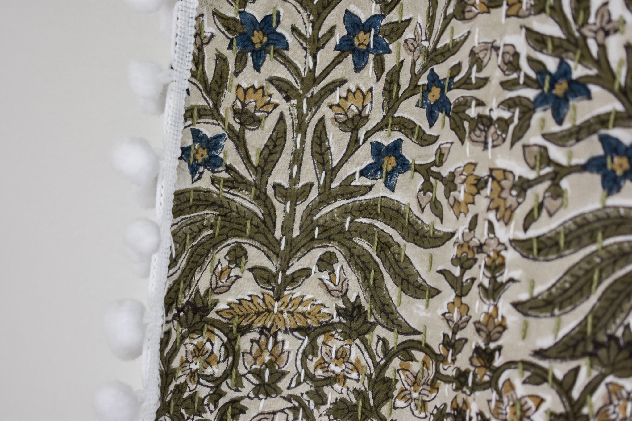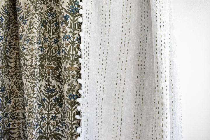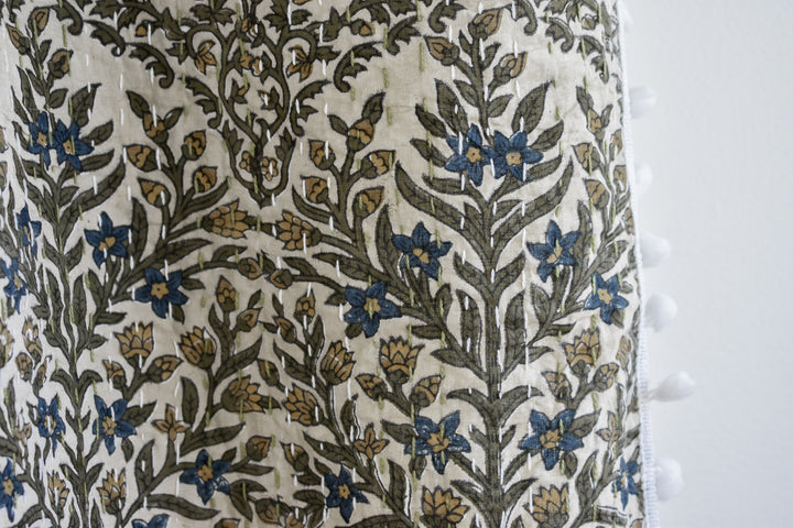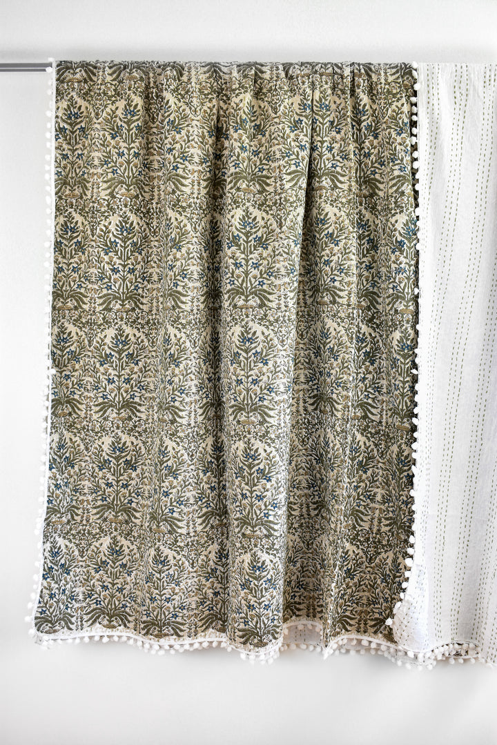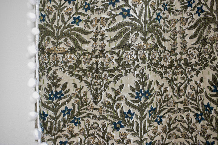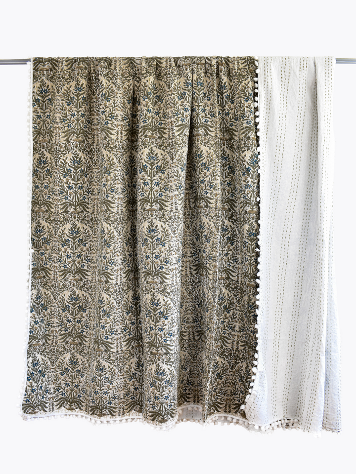 Lucy Pom Pom Kantha Quilt in Beige, Olive, Ochre and Indigo - King/Queen Sized