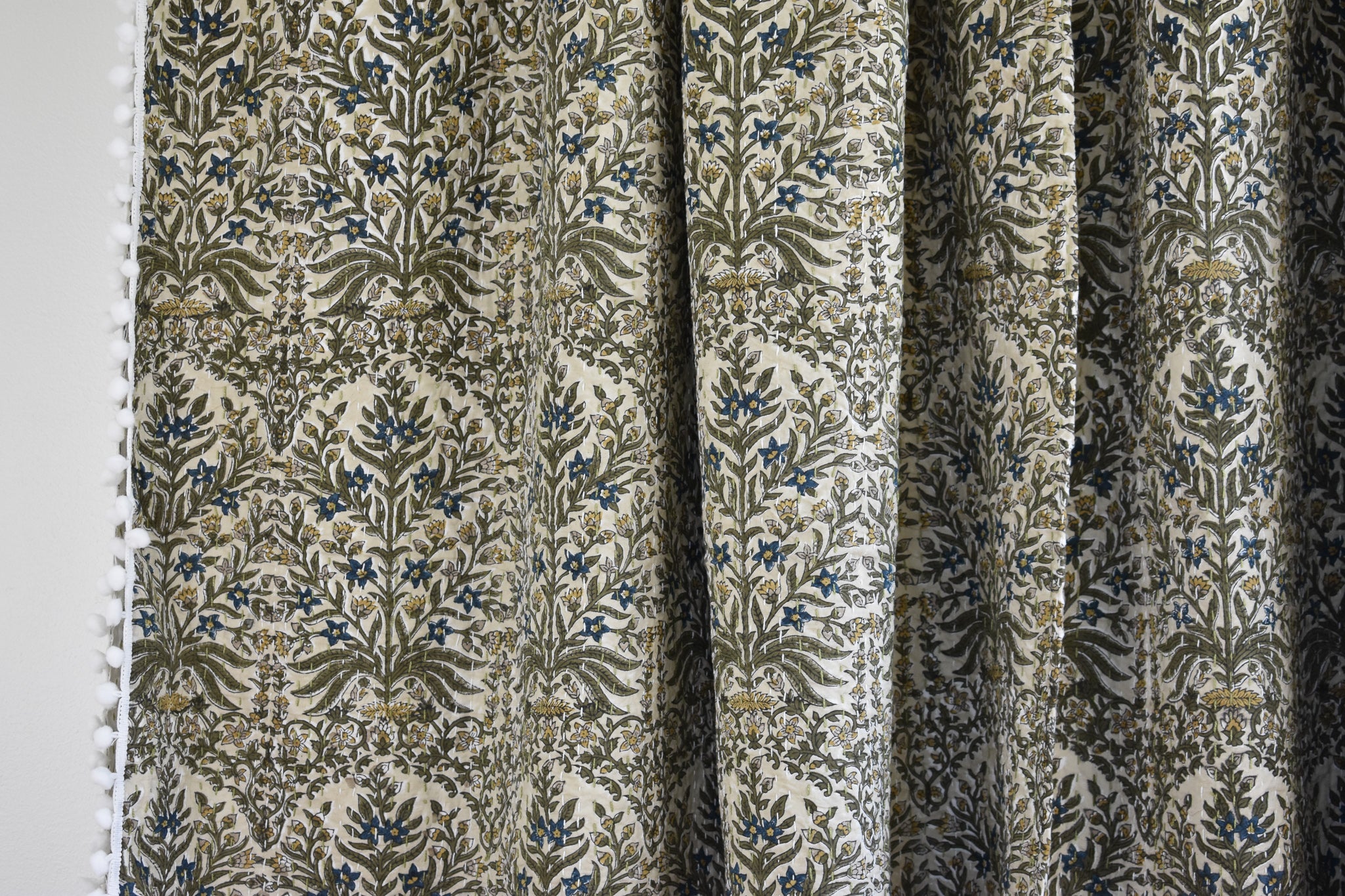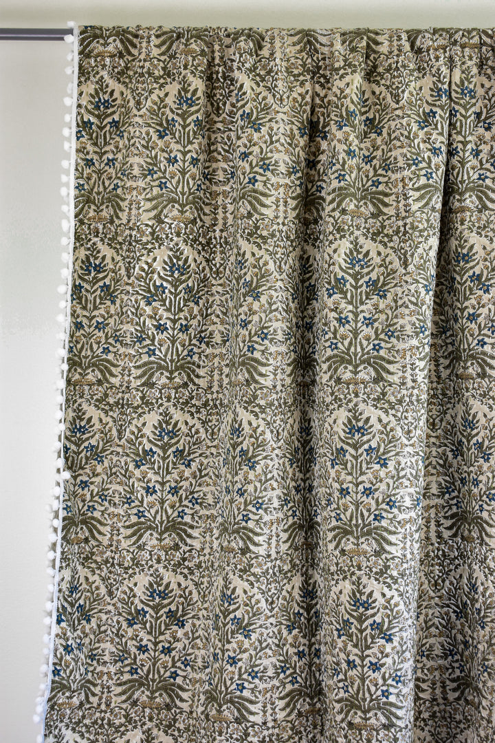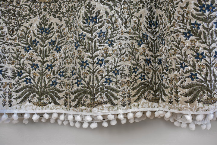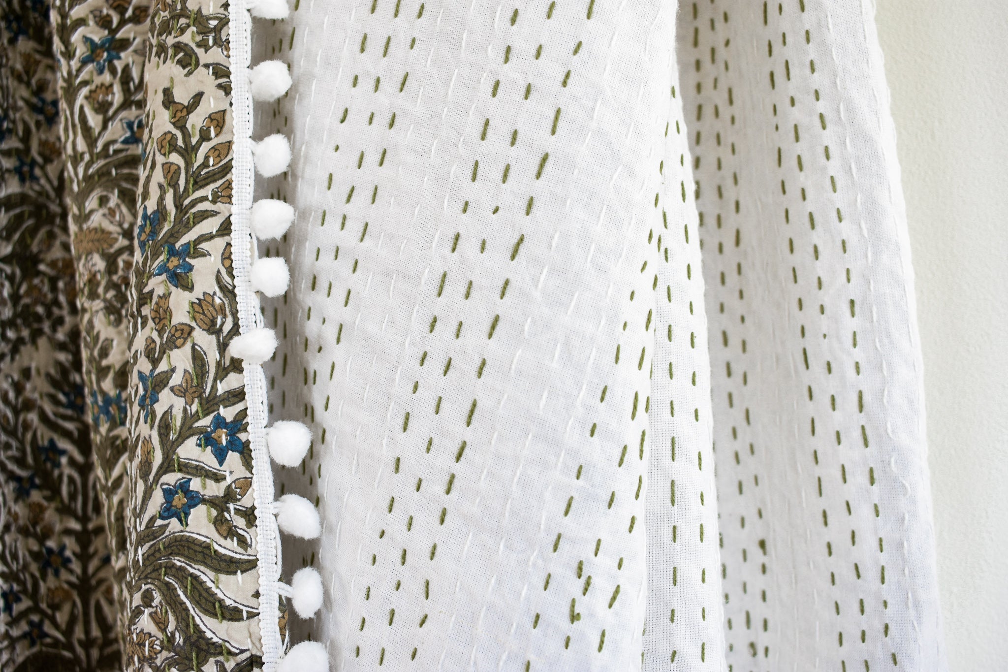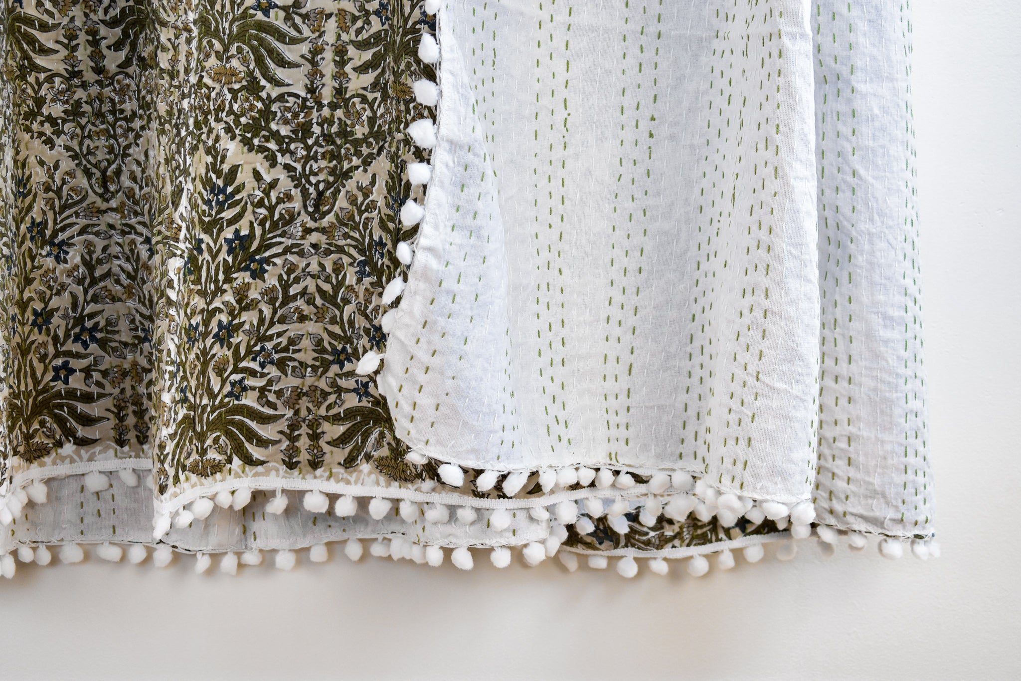 Lucy Pom Pom Kantha Quilt in Beige, Olive, Ochre and Indigo - King/Queen Sized