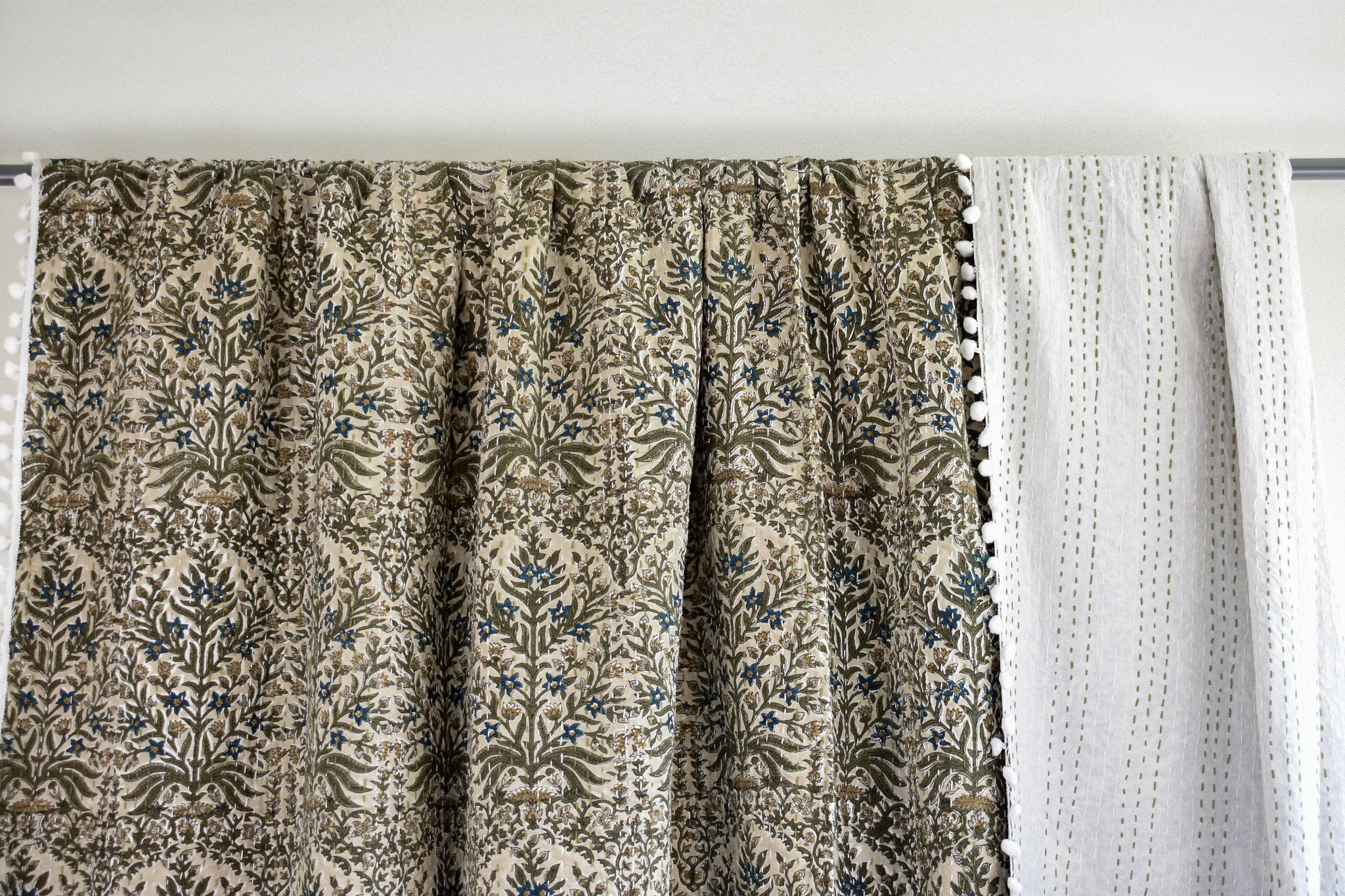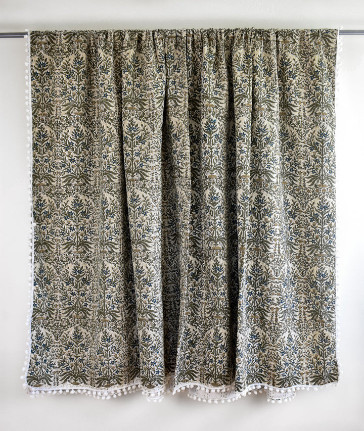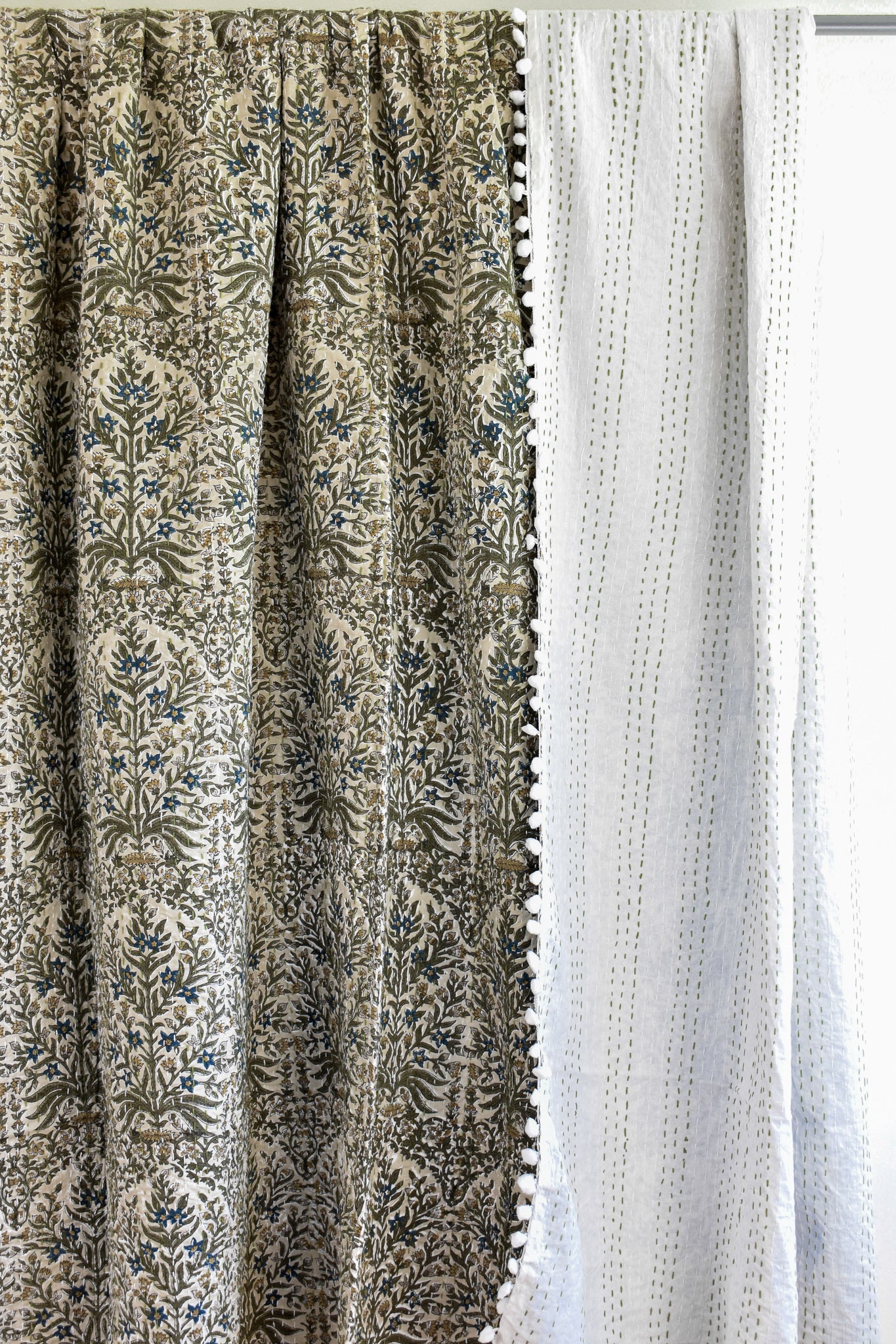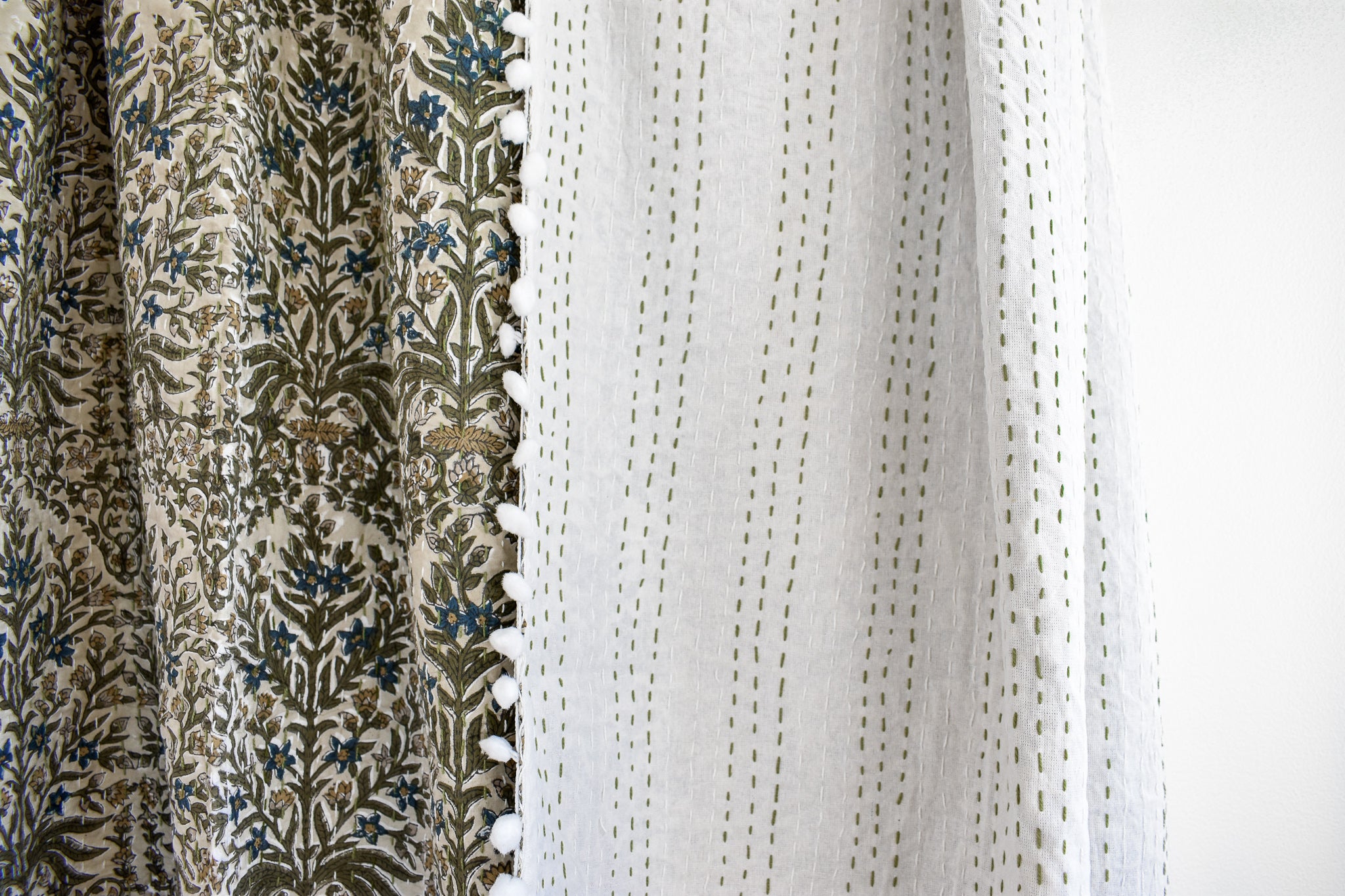 Lucy Pom Pom Kantha Quilt in Beige, Olive, Ochre and Indigo - King/Queen Sized