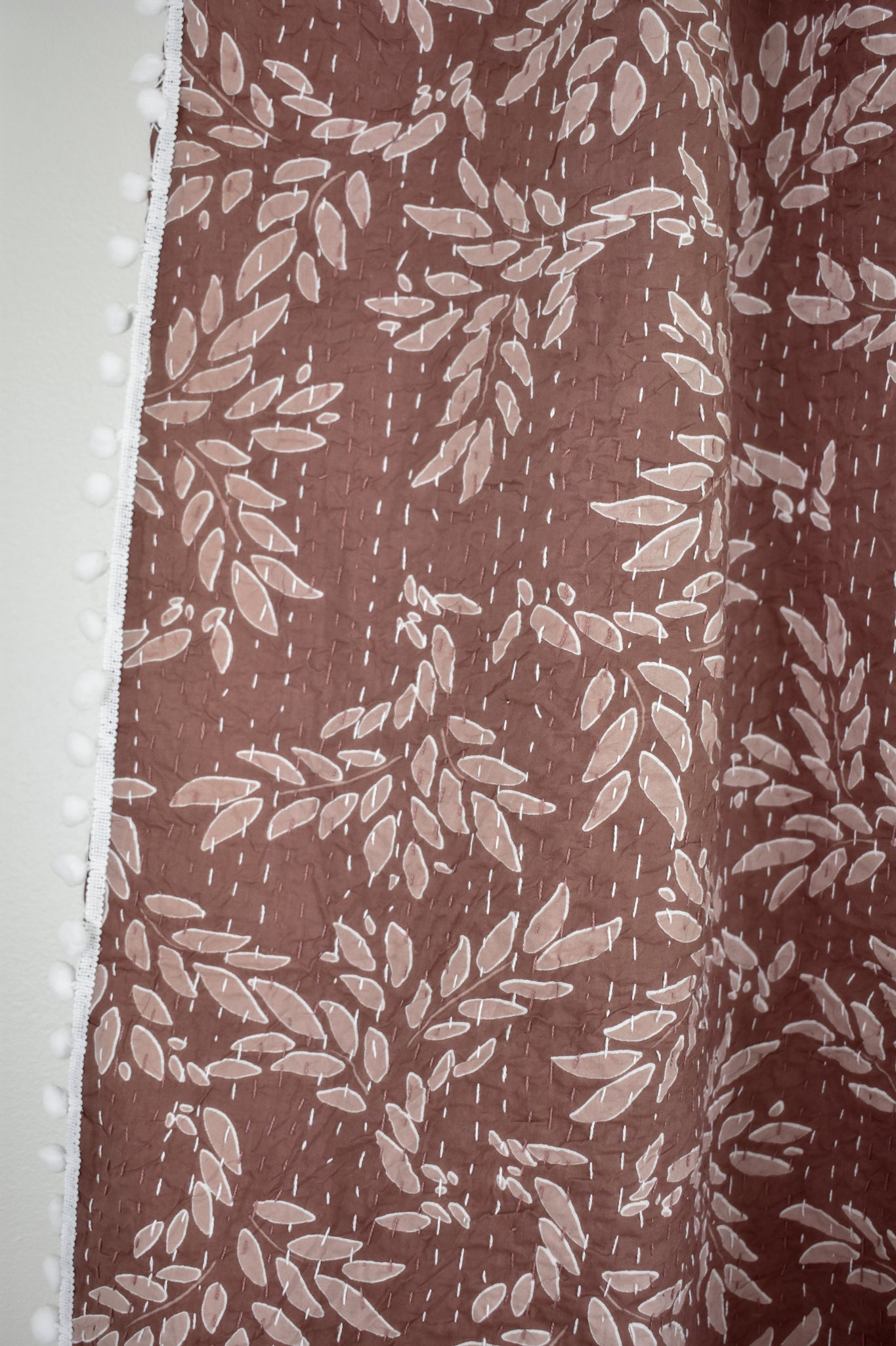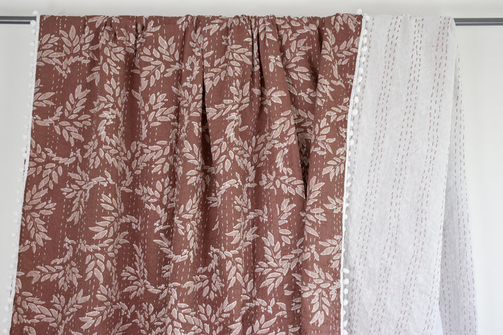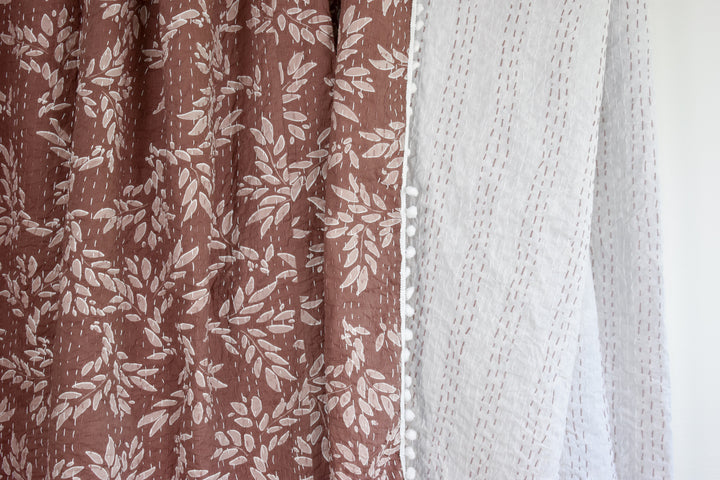 Our large, gorgeous, heirloom quality hand block printed quilts fit beautifully on both King and Queen sized beds. They are a lightweight coverlet-style, giving them a nice drape, and perfect for layering or standing on their own. Two thin layers of cotton fabric are stitched together with hundreds of "kantha" stitches, a centuries-old Bengali tradition of hand stitching. Each quilt is a true labor of love.
