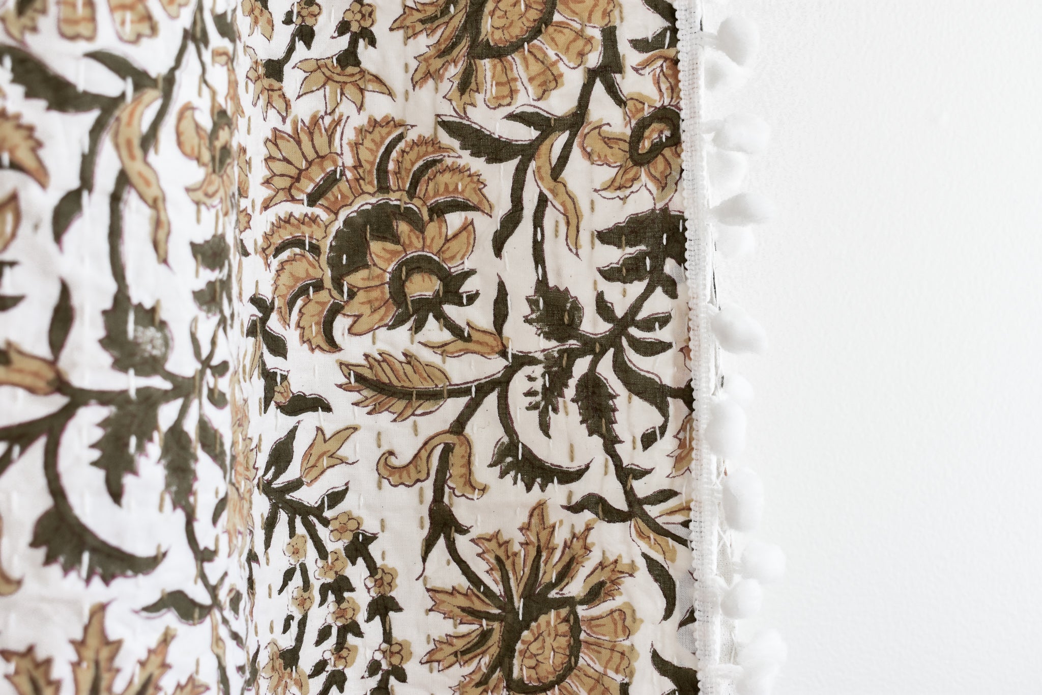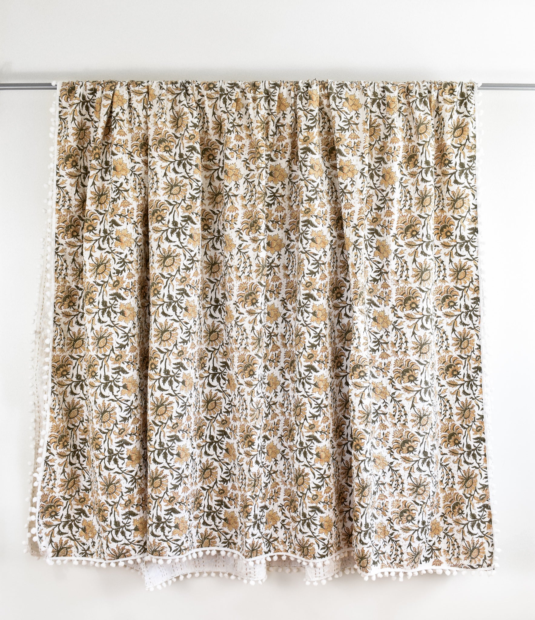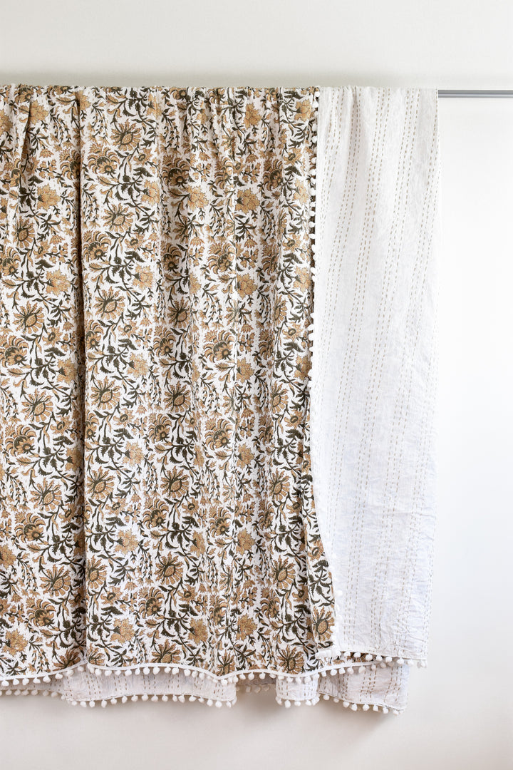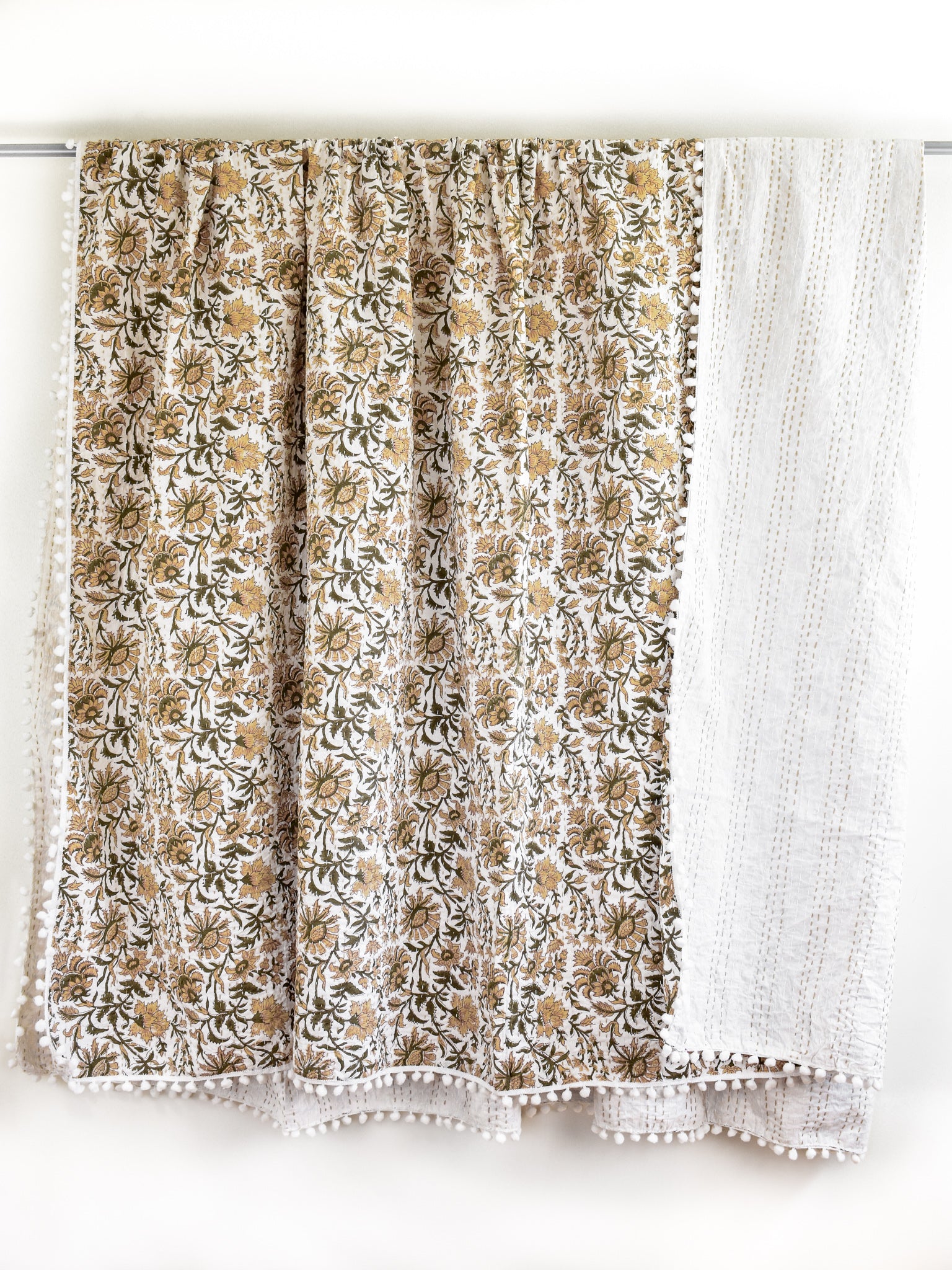 The Ella Pom Pom Kantha Quilt in Olive, Tan, and Faded Gold - King/Queen Sized