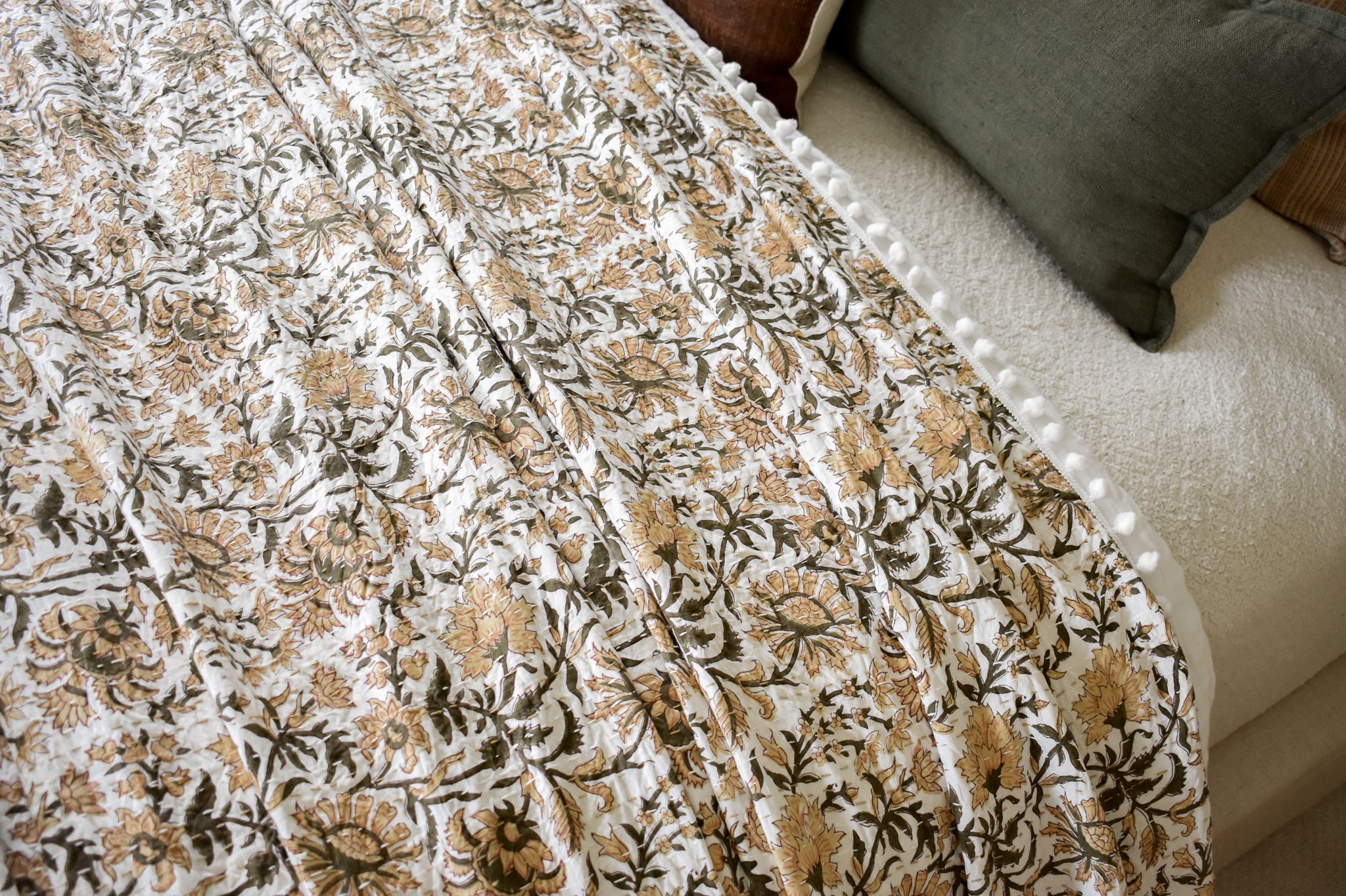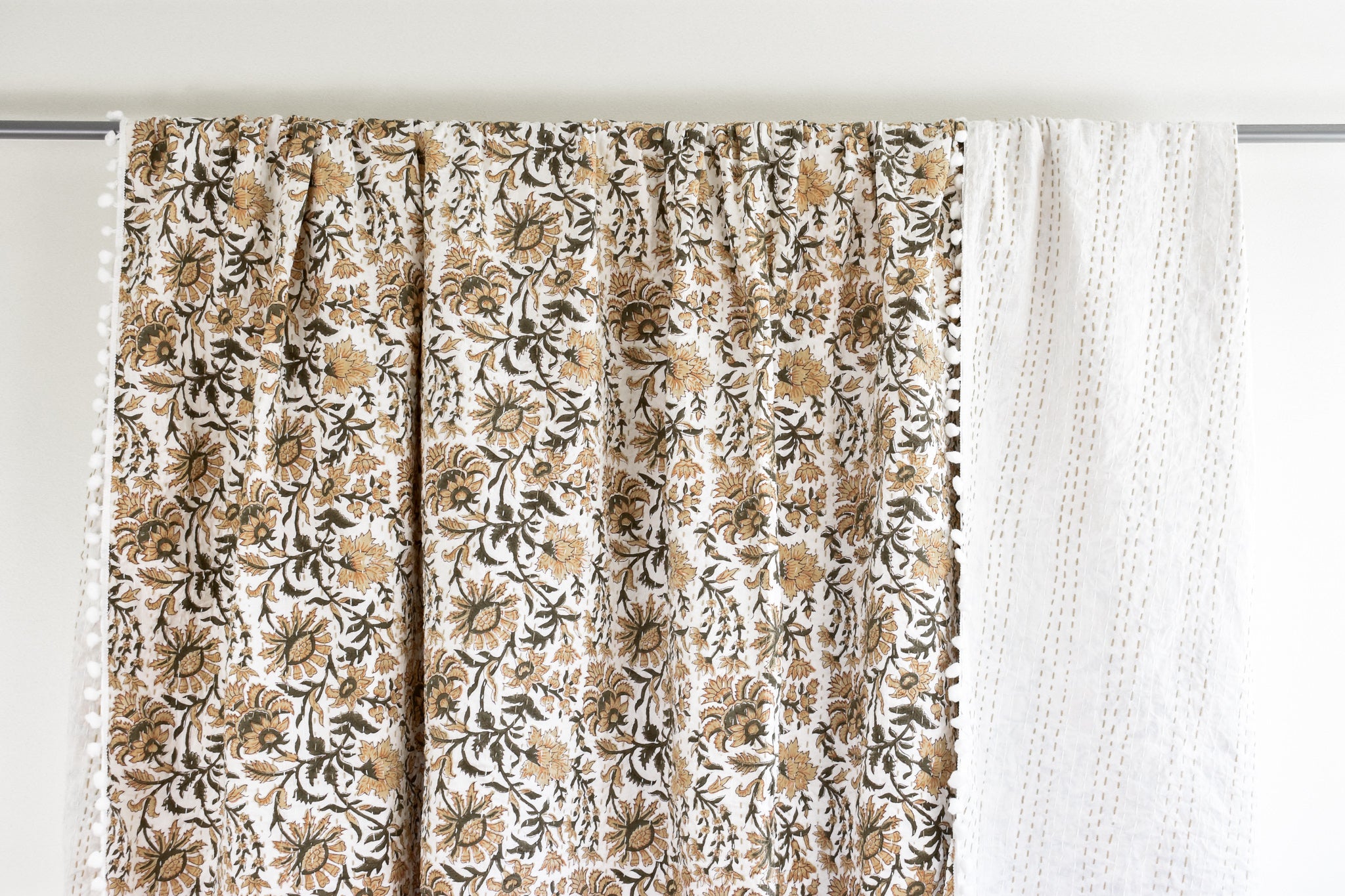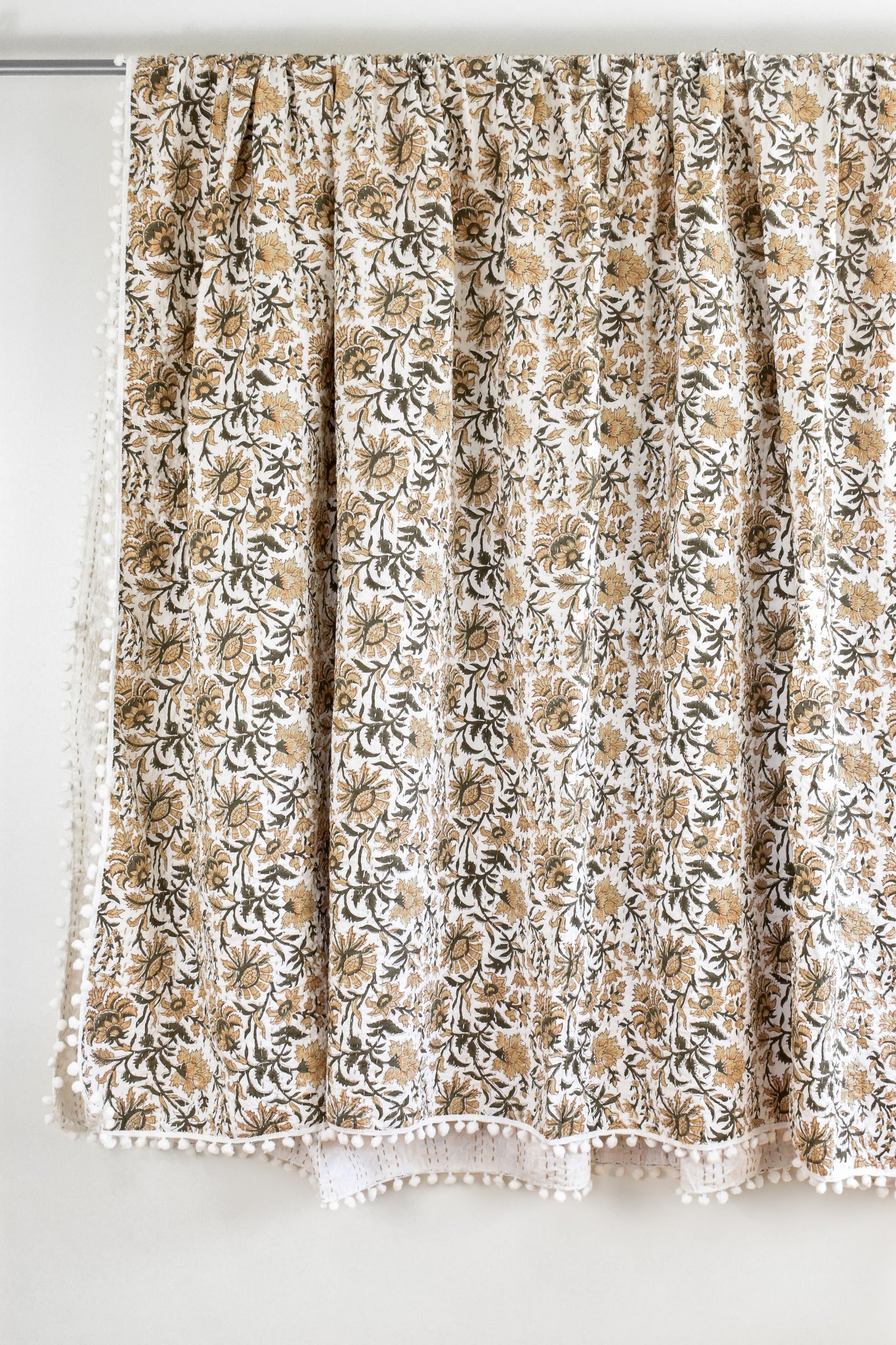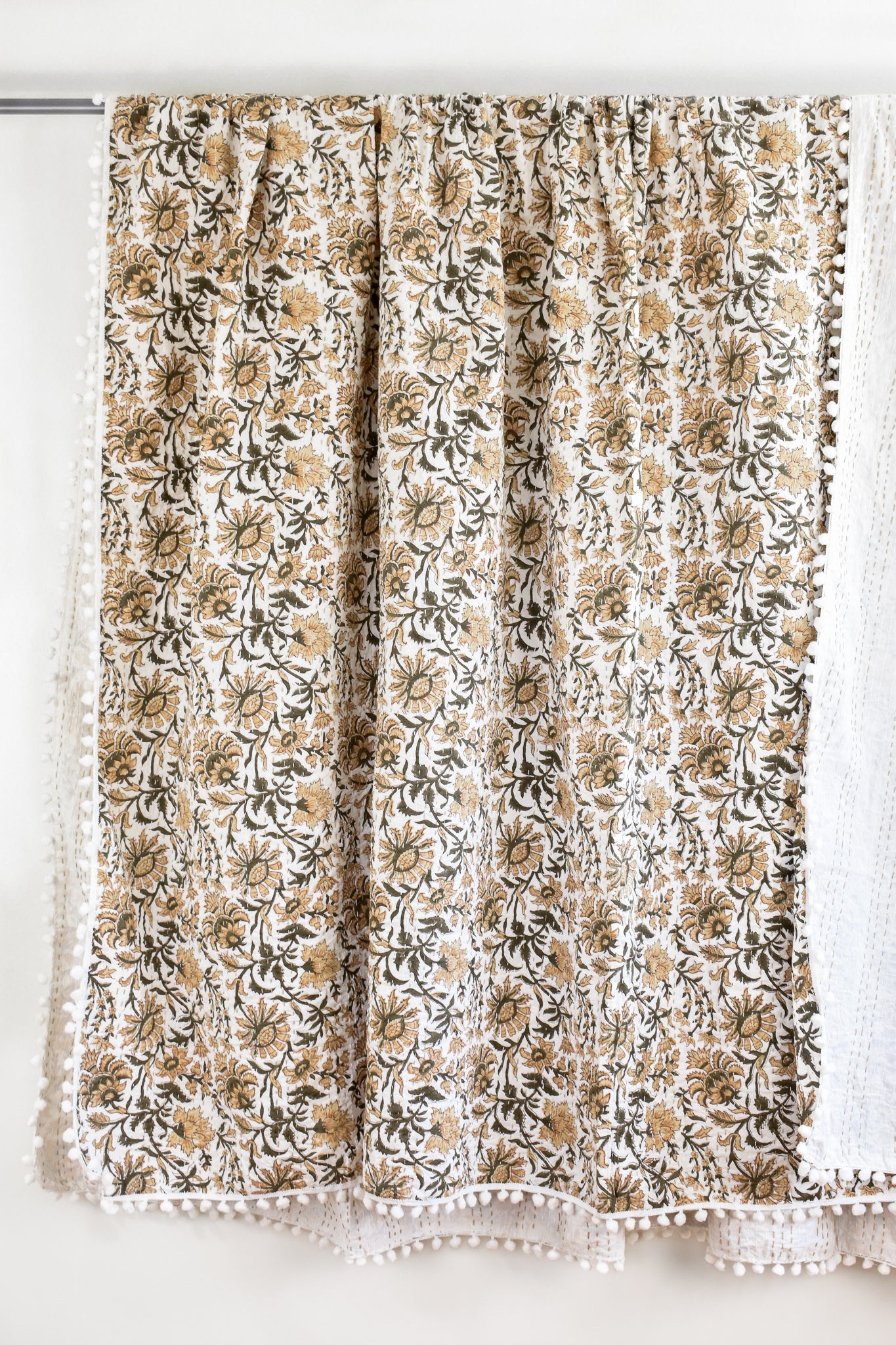 The Ella Pom Pom Kantha Quilt in Olive, Tan, and Faded Gold - King/Queen Sized