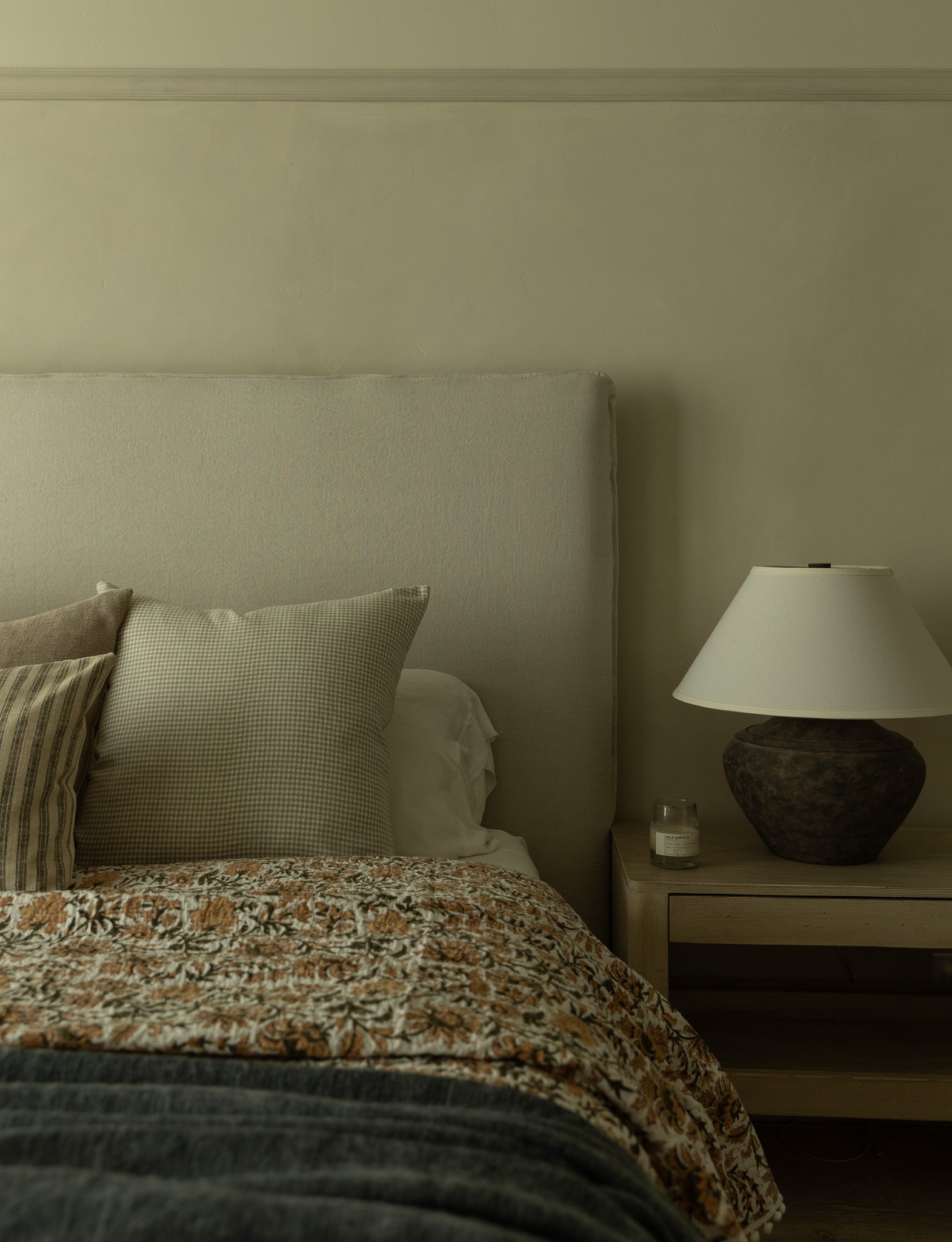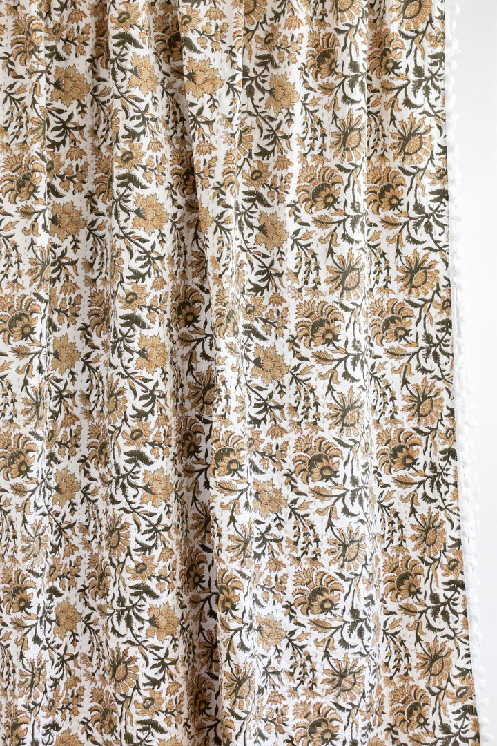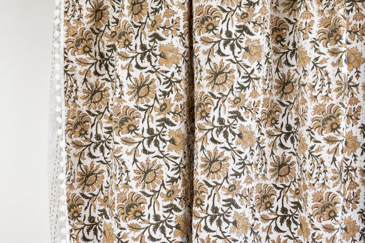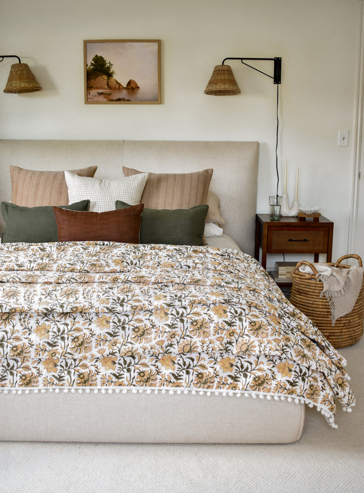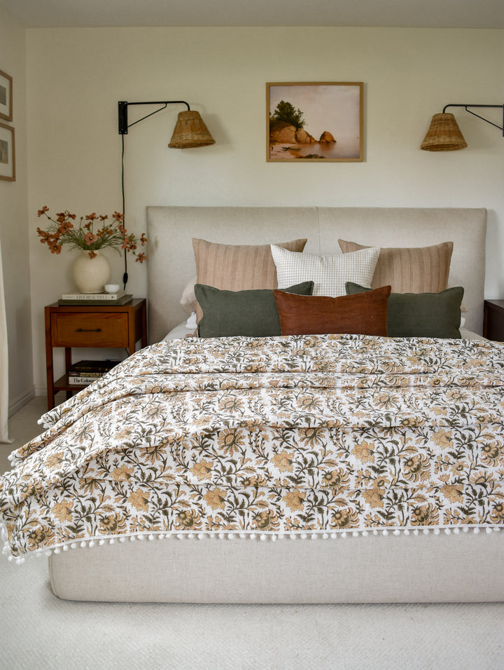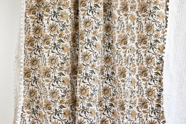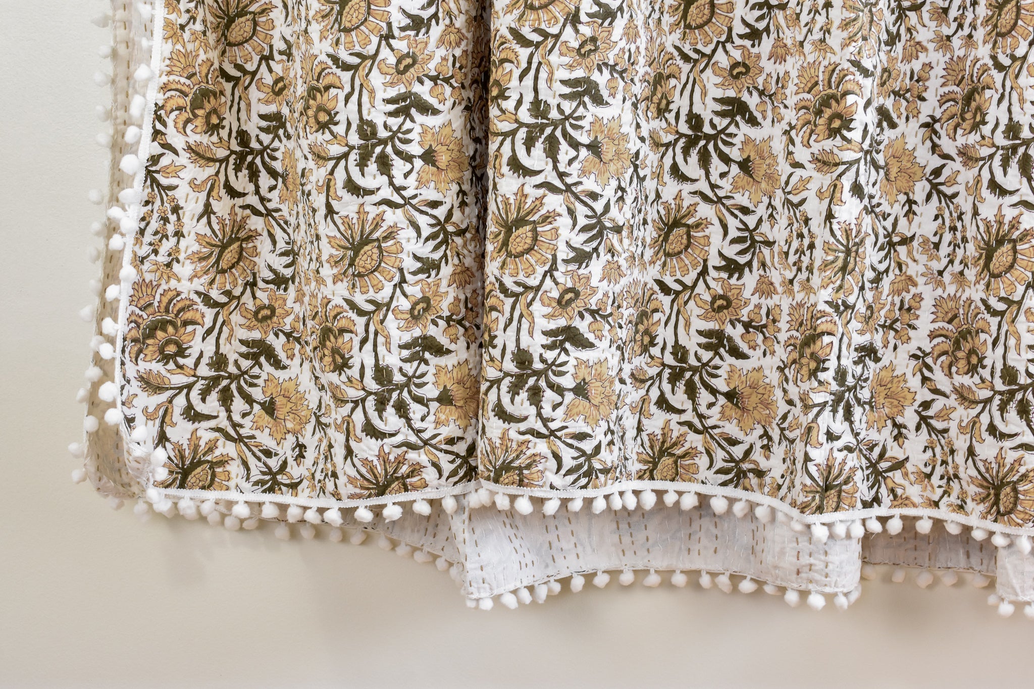 The Ella Pom Pom Kantha Quilt in Olive, Tan, and Faded Gold - King/Queen Sized