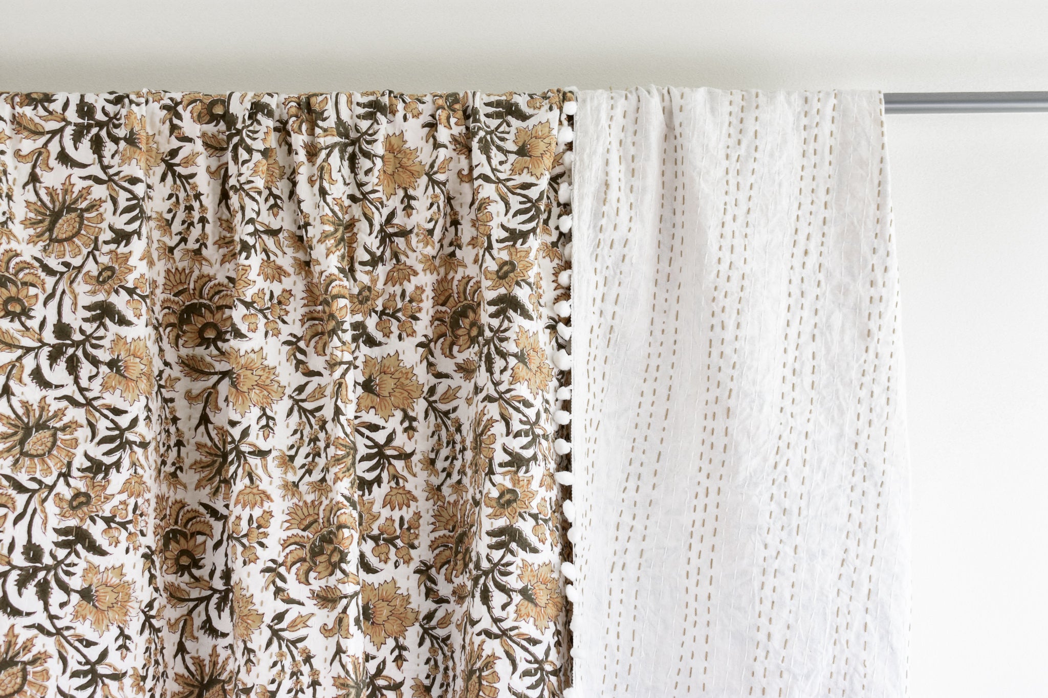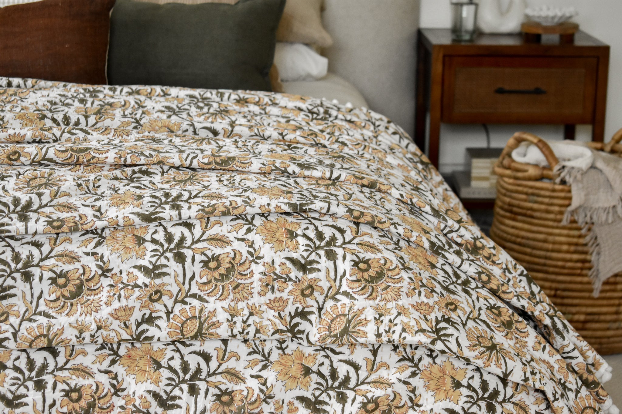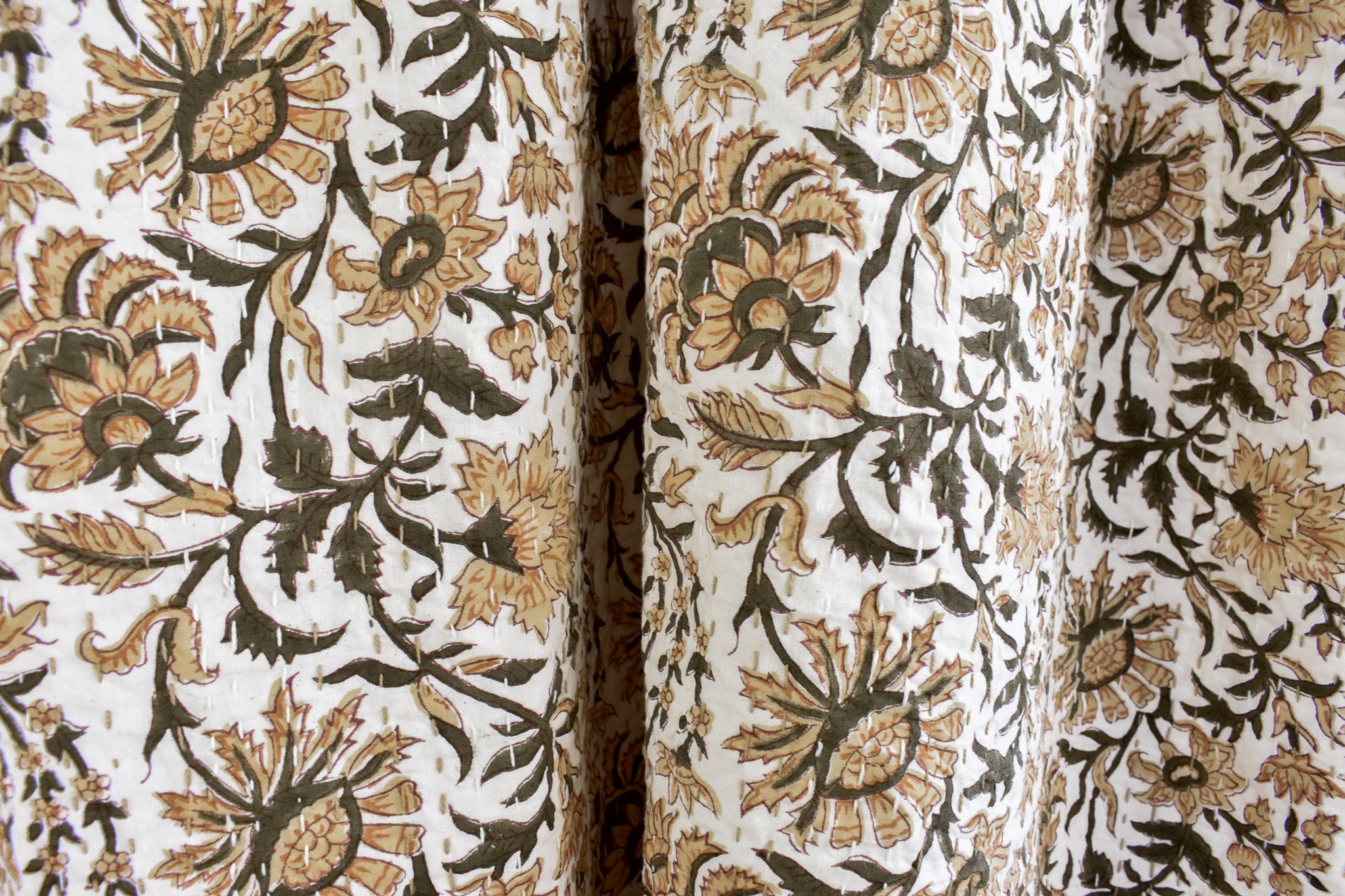 Our large, gorgeous, heirloom quality hand block printed quilts fit beautifully on both King and Queen sized beds. They are a lightweight coverlet-style, giving them a nice drape, and perfect for layering or standing on their own. Two thin layers of cotton fabric are stitched together with hundreds of "kantha" stitches, a centuries-old Bengali tradition of hand stitching. Each quilt is a true labor of love.