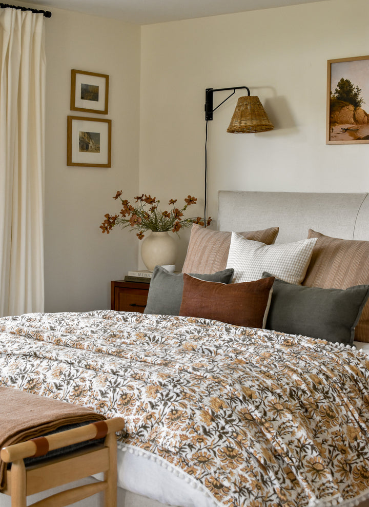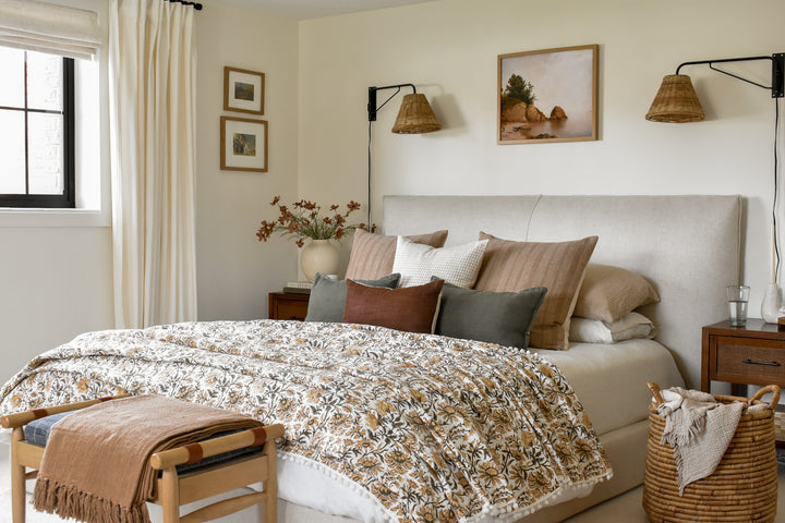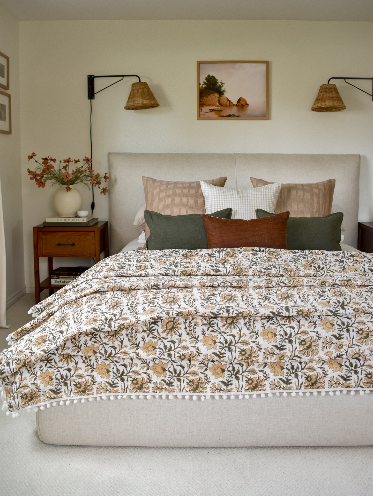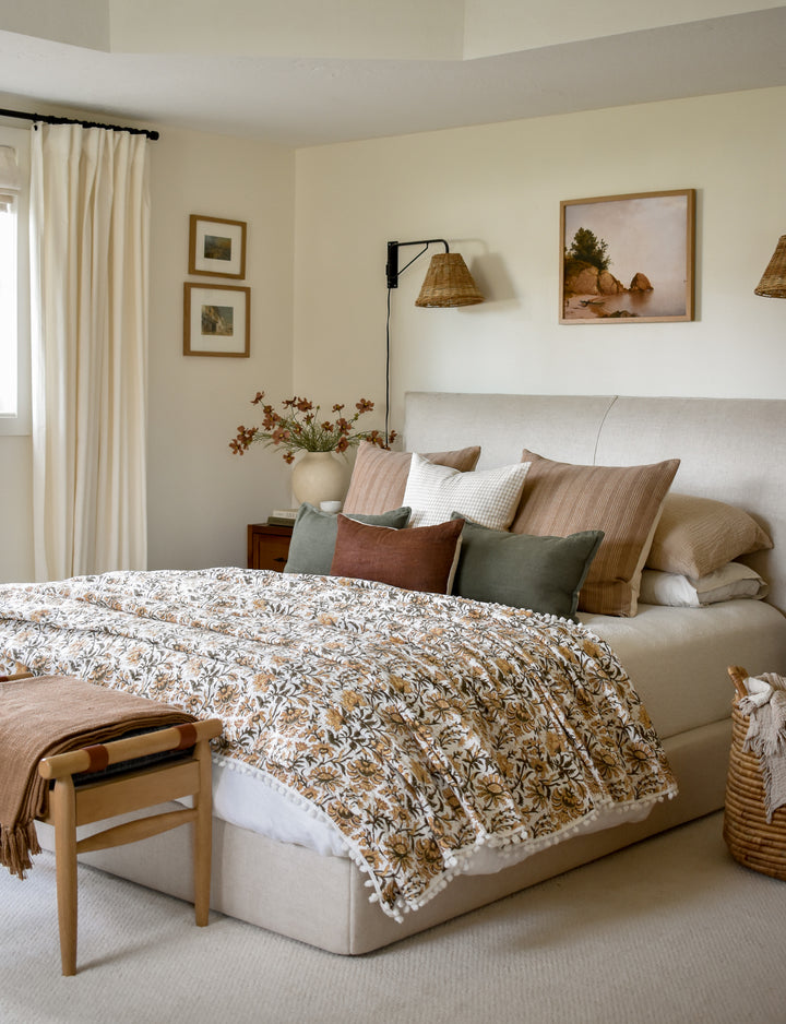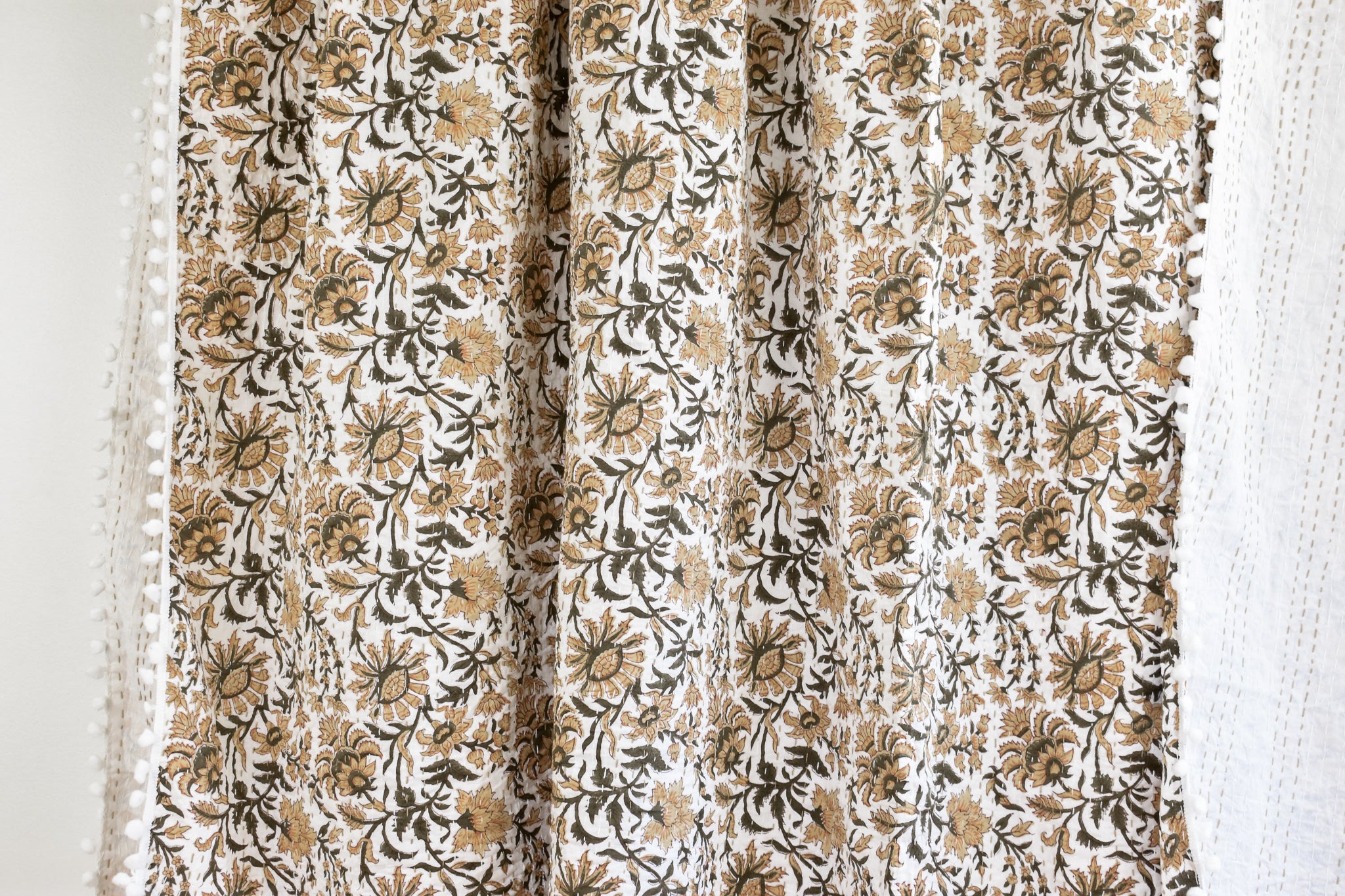 Our large, gorgeous, heirloom quality hand block printed quilts fit beautifully on both King and Queen sized beds. They are a lightweight coverlet-style, giving them a nice drape, and perfect for layering or standing on their own. Two thin layers of cotton fabric are stitched together with hundreds of "kantha" stitches, a centuries-old Bengali tradition of hand stitching. Each quilt is a true labor of love.