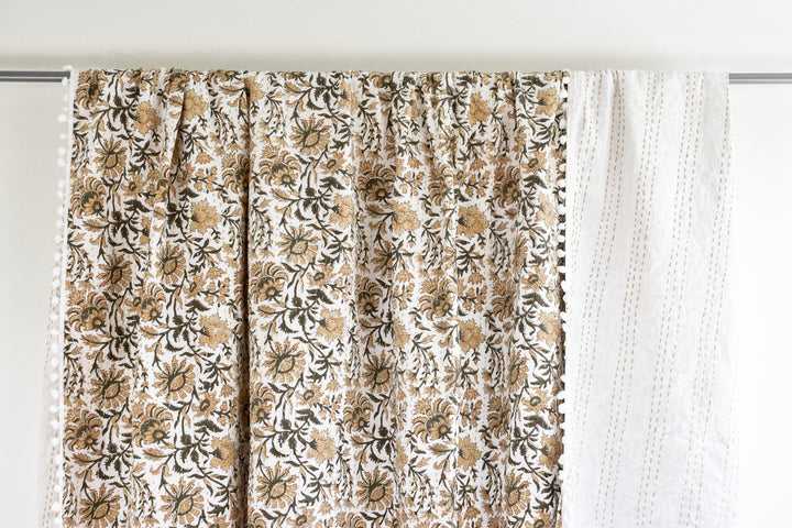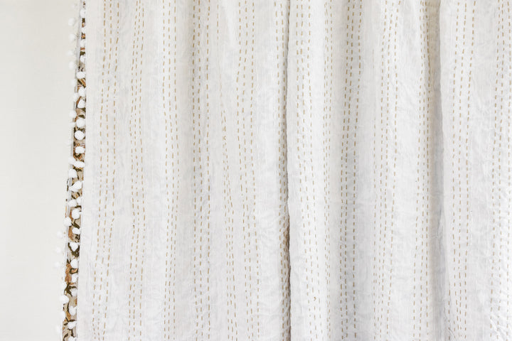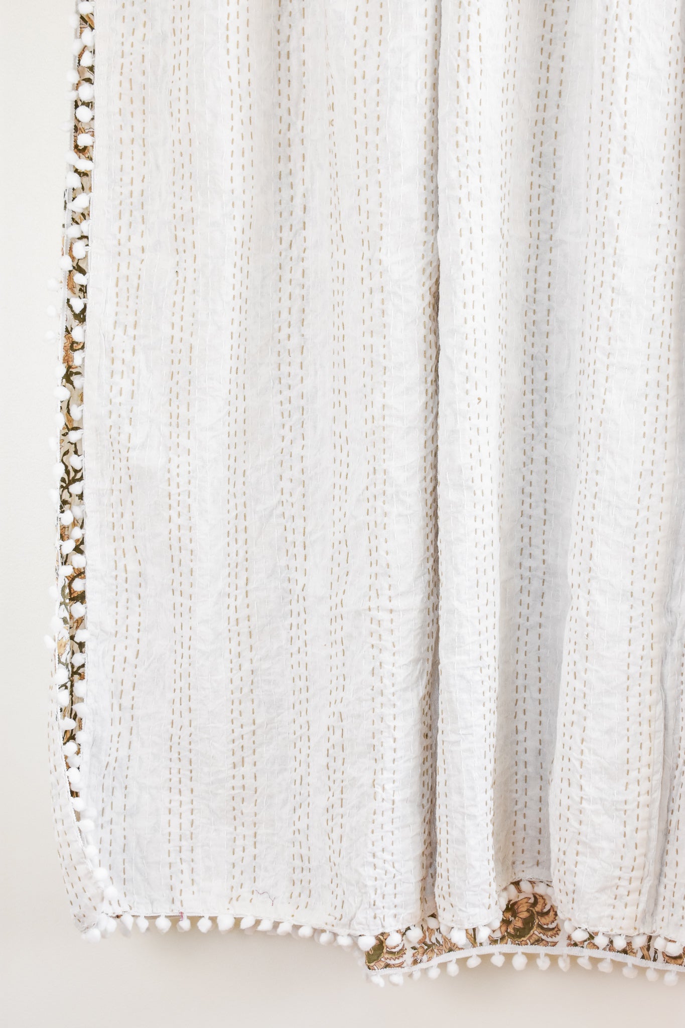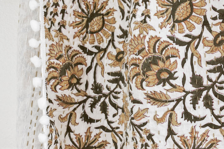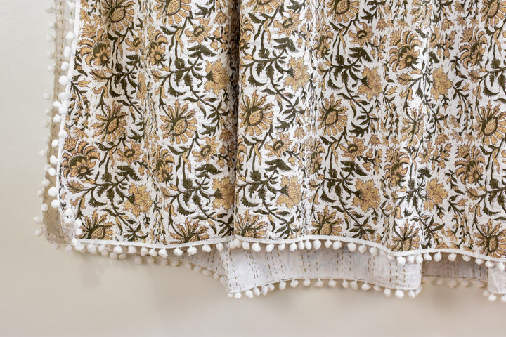 Ella Pom Pom Kantha Quilt in Olive, Tan and Faded Gold - King/Queen Sized