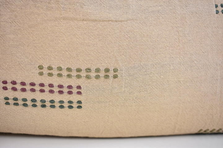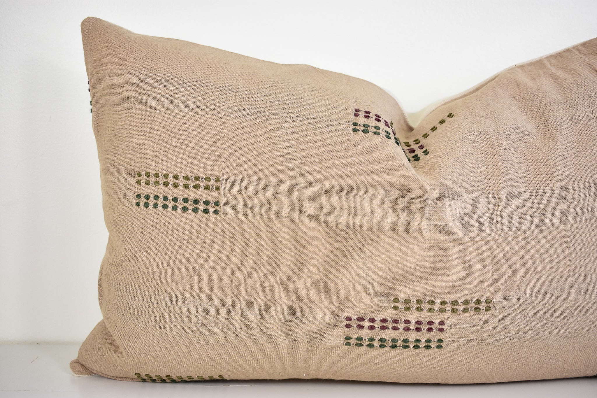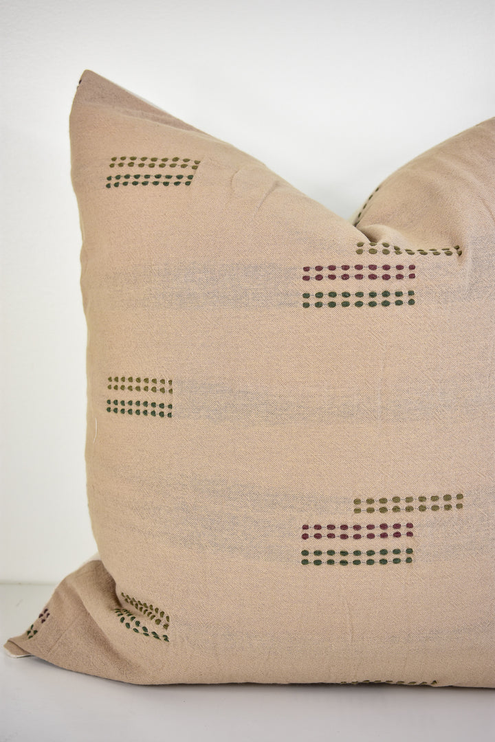 This pillow is crafted from a beautiful light sand colored sashiko fabric. We traveled to Thailand and hand picked each of these gorgeous fabrics to create a collection that is both unique and cohesive, so putting together a combo is effortless. By going straight to the source, we cut out middleman costs, so you get the high end designer look without the high end designer price.
