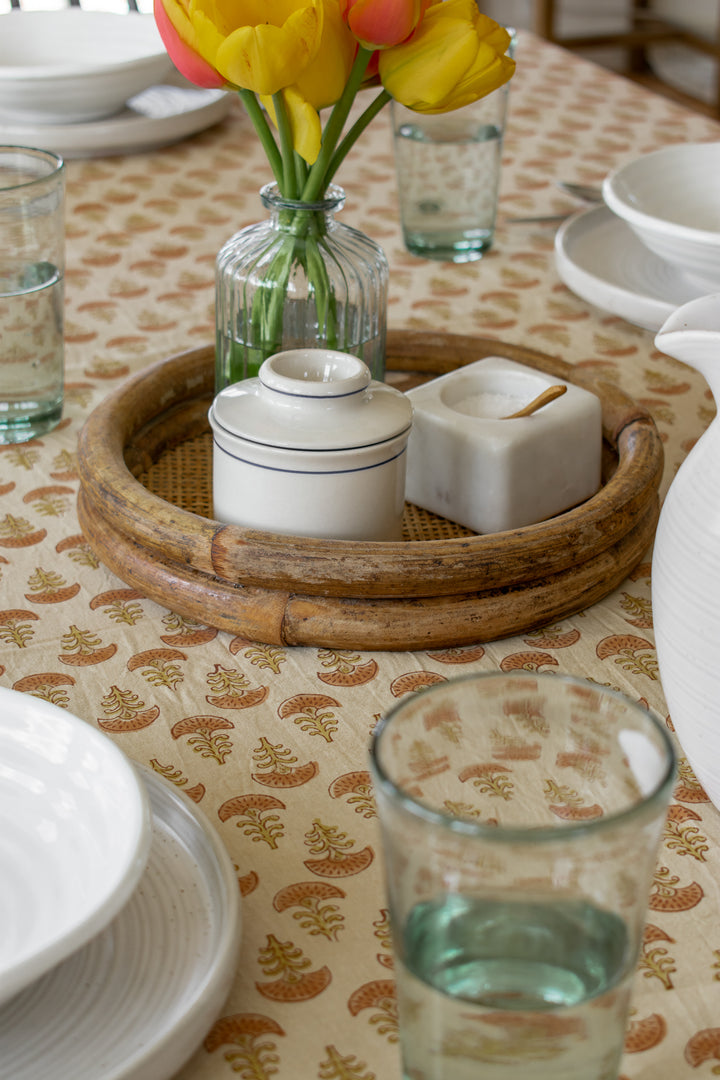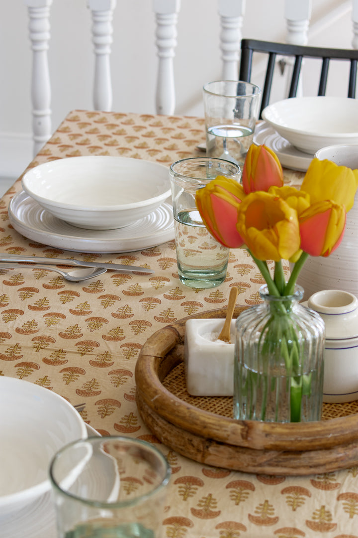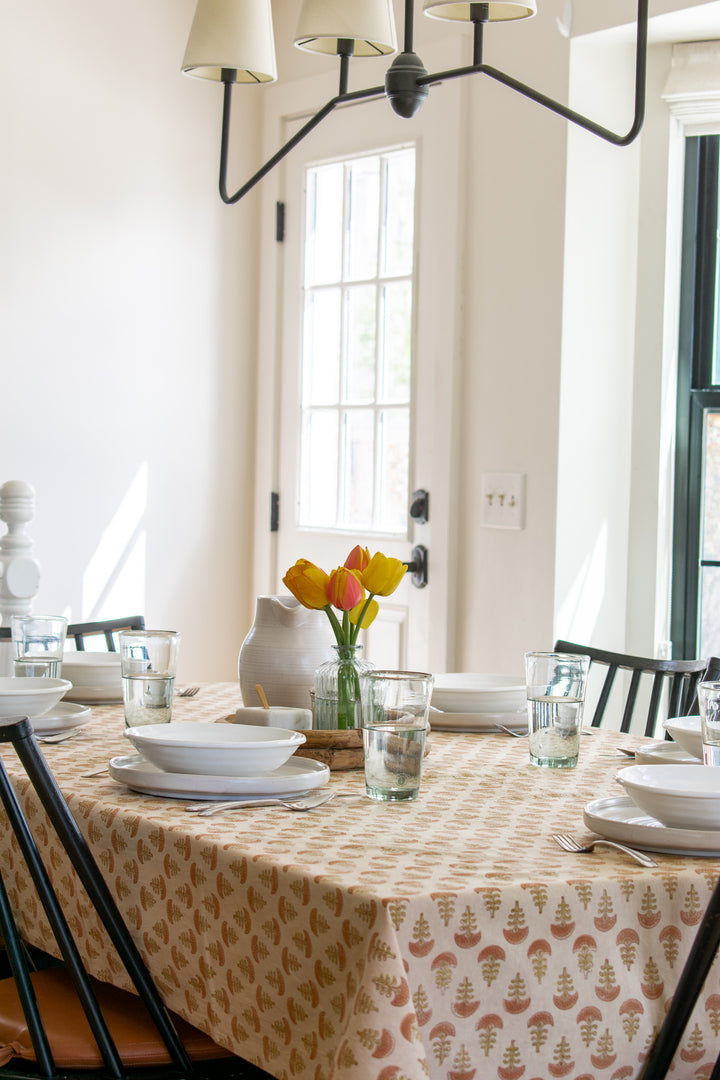 One of our most popular designs exclusive to Collectiv Co. is now available as a tablecloth! Hand block printed on organic cotton, the custom design and colors of the Bhuti Tablecloth adds warmth and charm to any dining space.