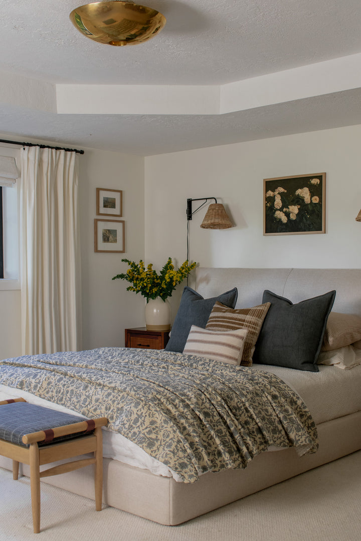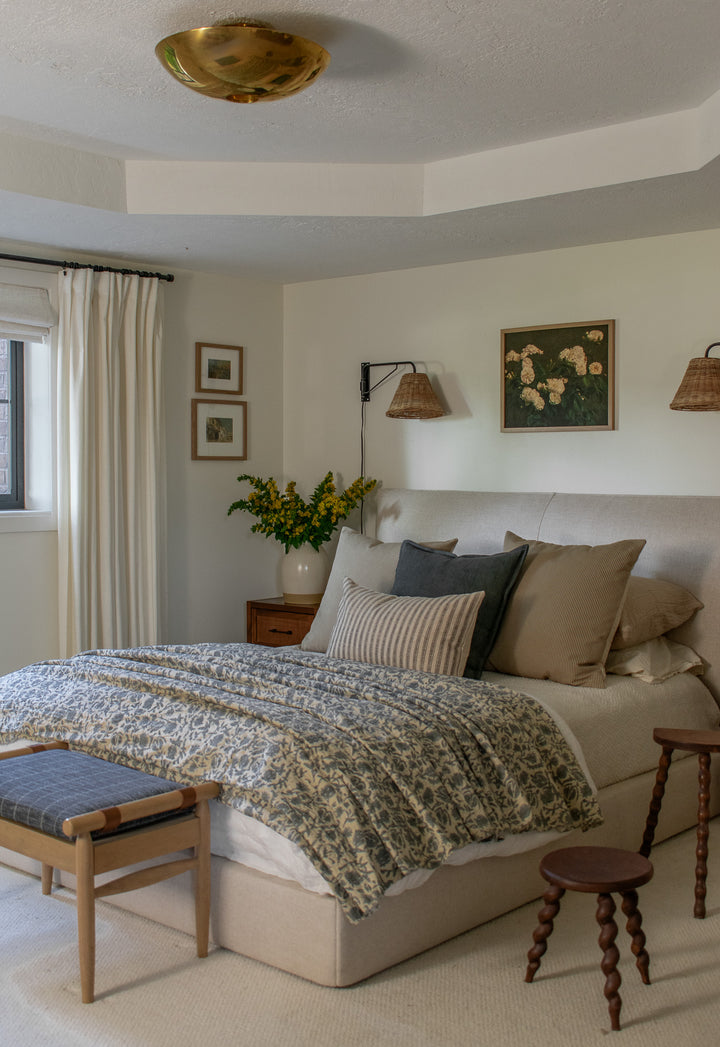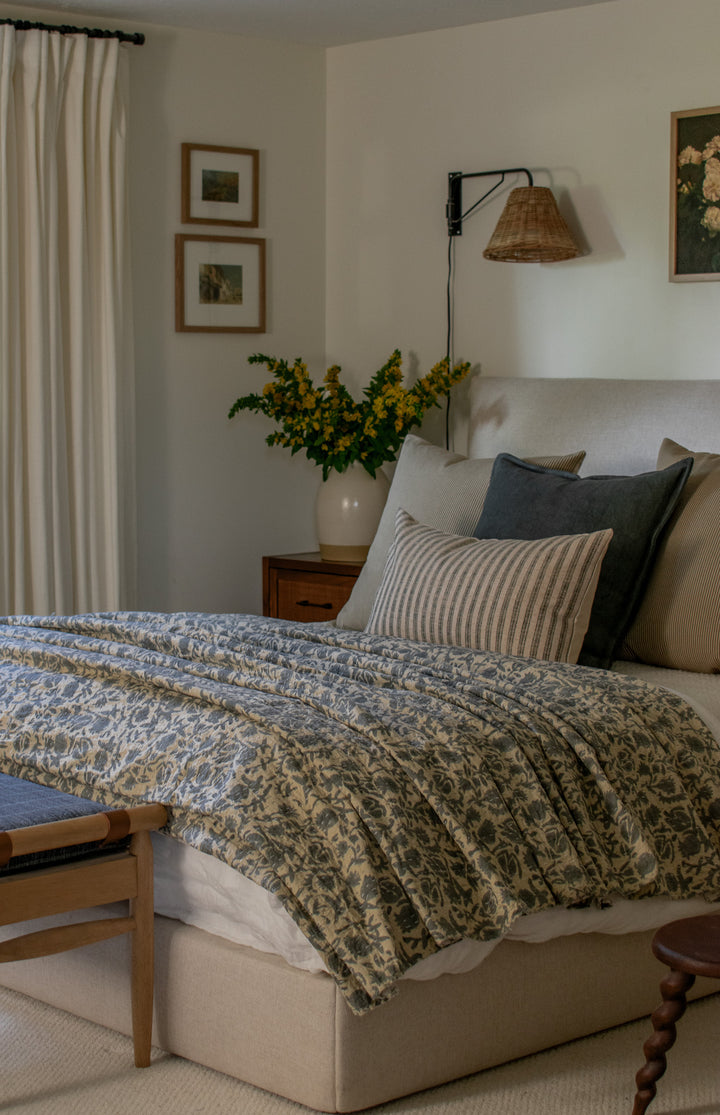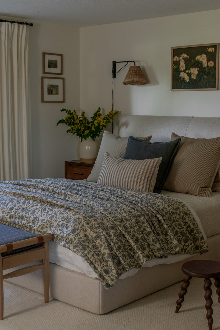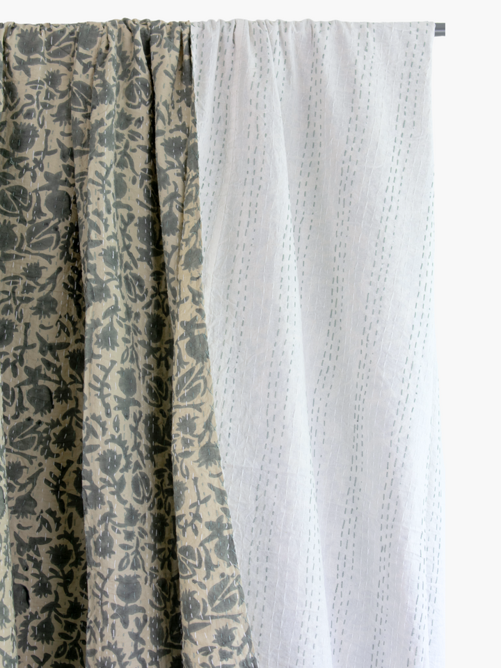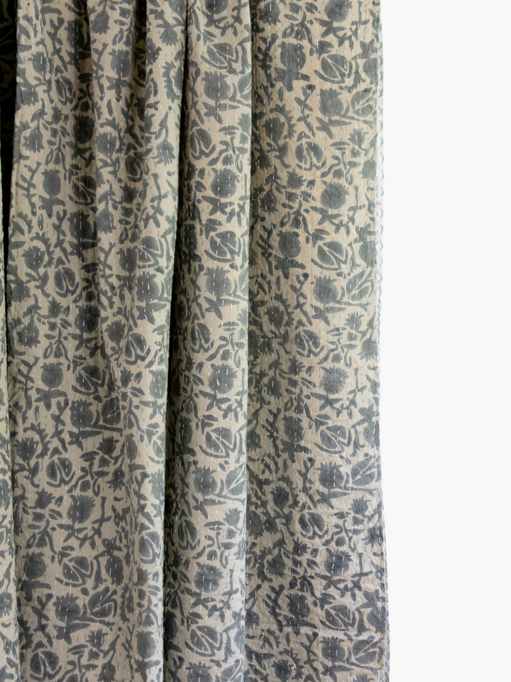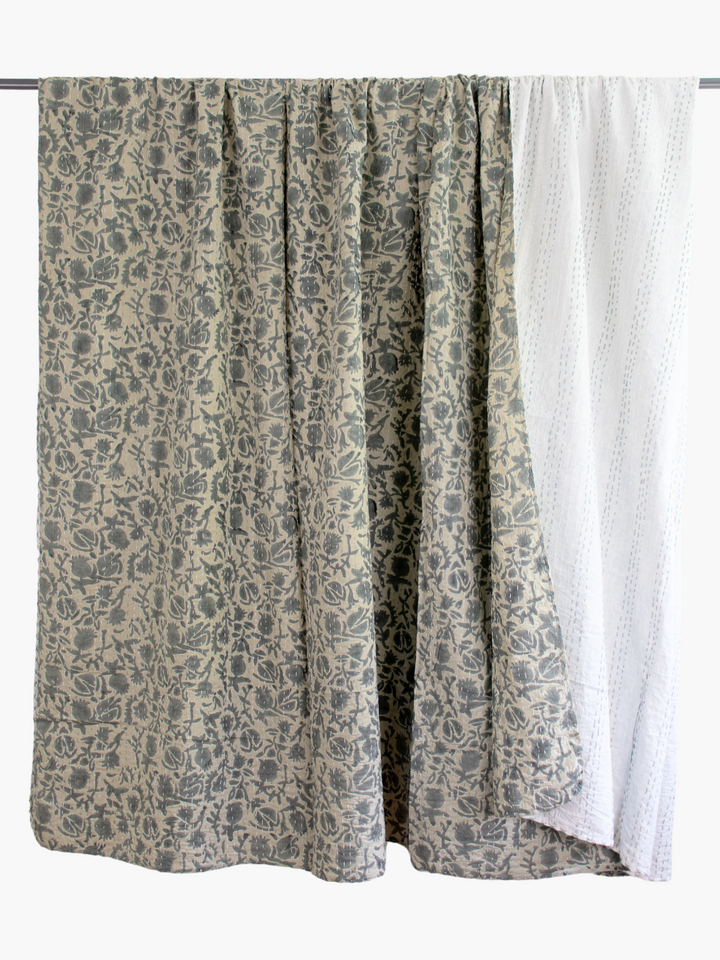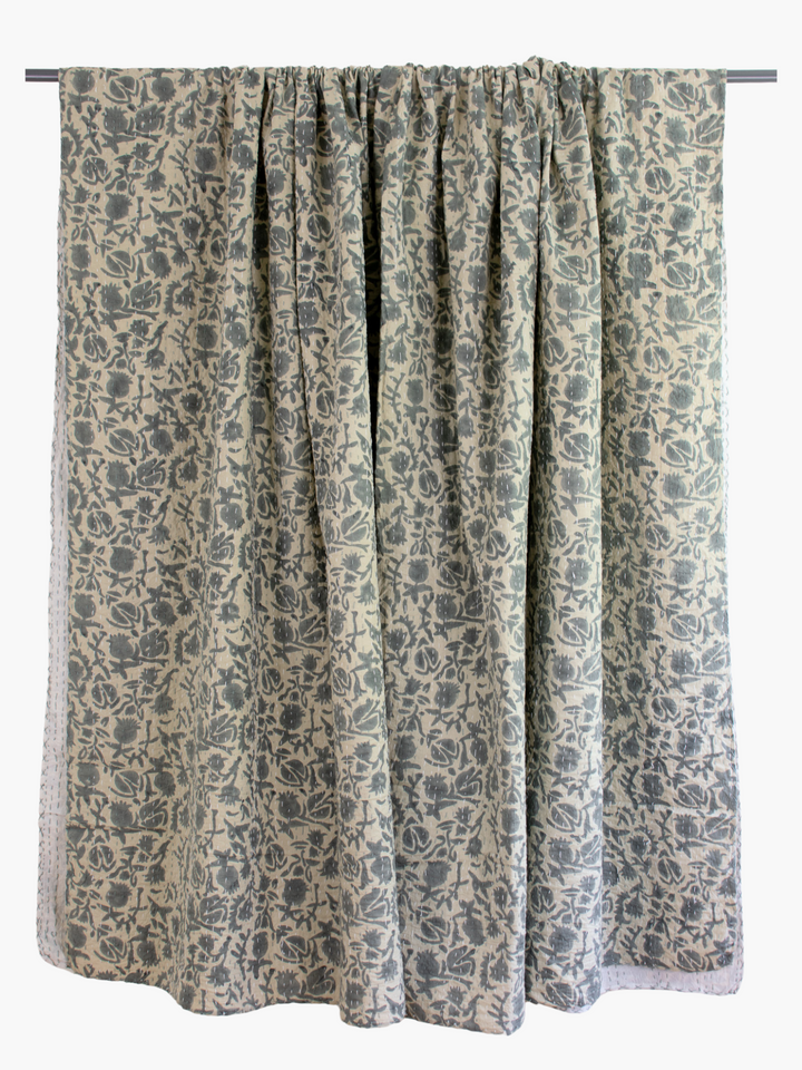 Our large, gorgeous, heirloom quality hand block printed quilts fit beautifully on both King and Queen sized beds. They are a lightweight coverlet-style, giving them a nice drape, and perfect for layering or standing on their own. Two thin layers of cotton fabric are stitched together with hundreds of "kantha" stitches, a centuries-old Bengali tradition of hand stitching. Each quilt is a true labor of love.
