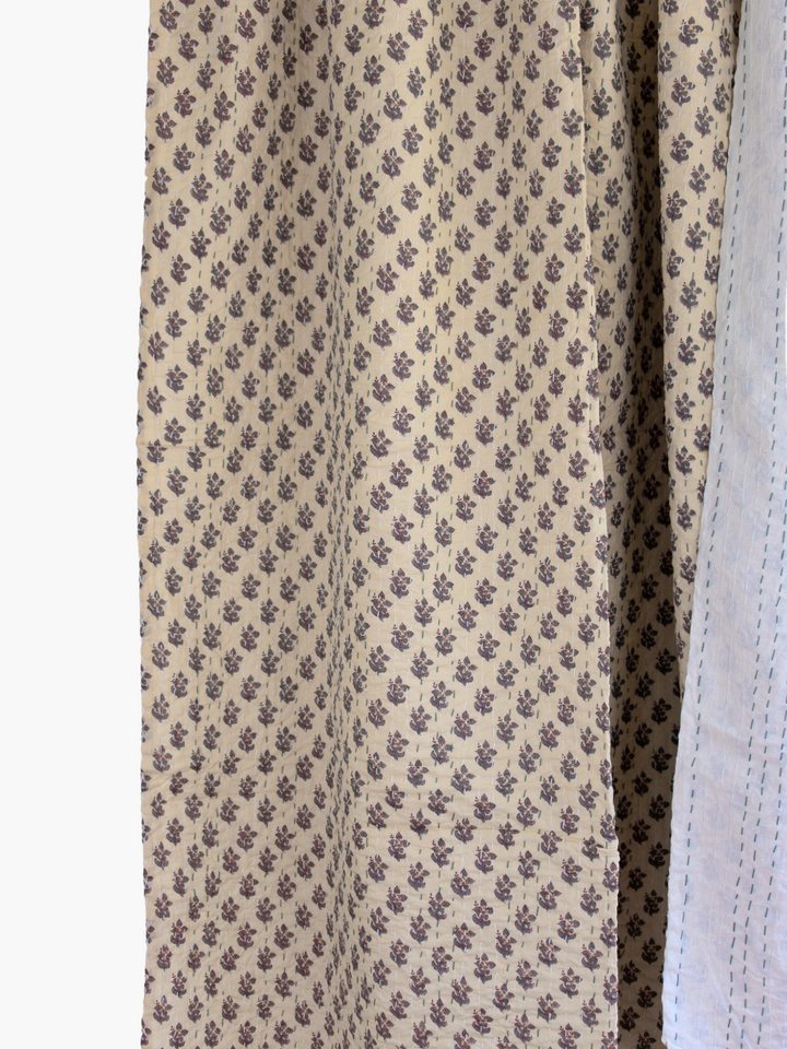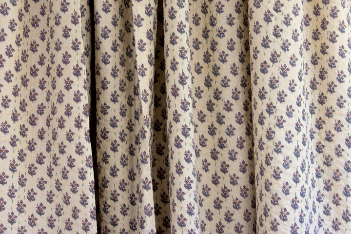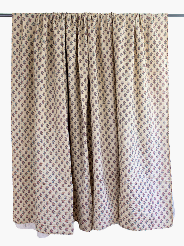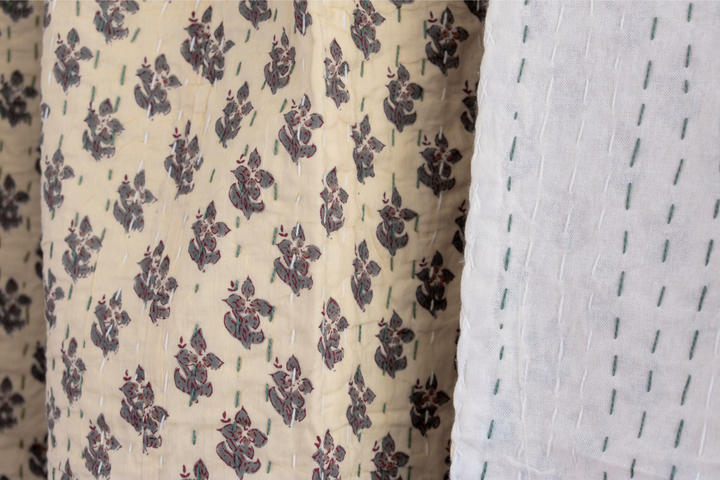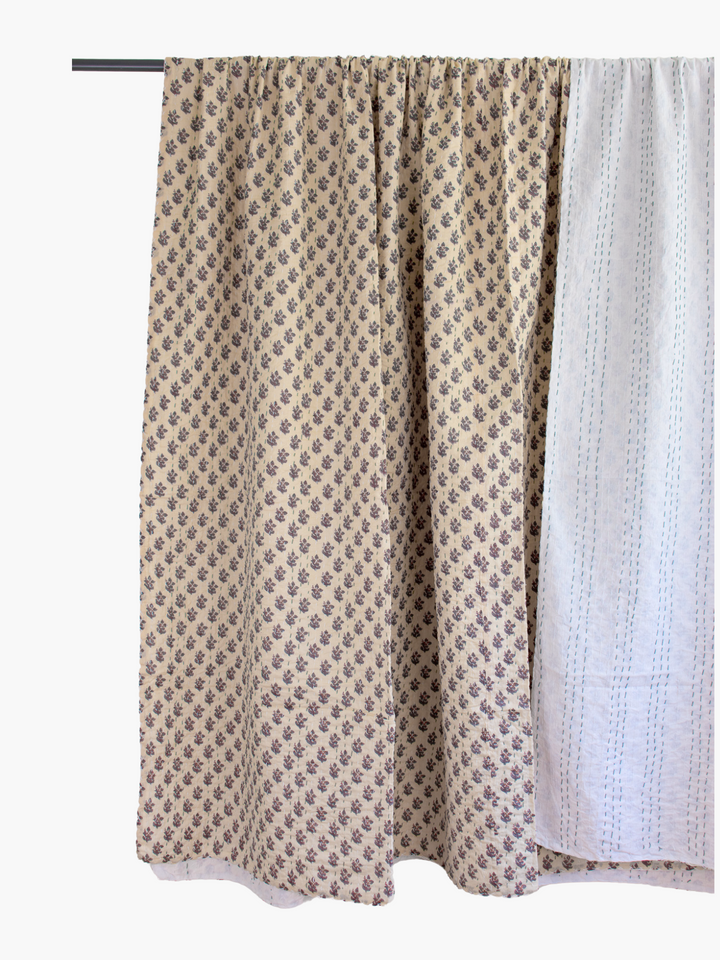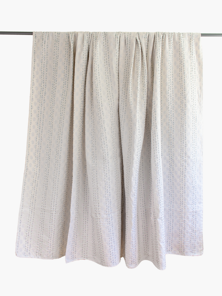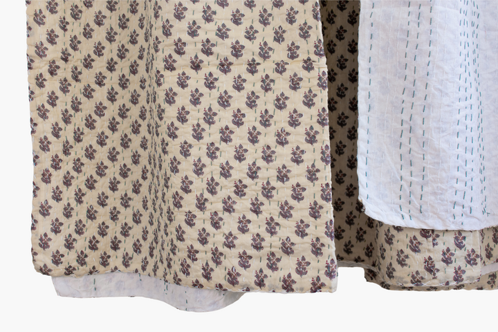 Our large, gorgeous, heirloom quality hand block printed quilts fit beautifully on both King and Queen sized beds. They are a lightweight coverlet-style, giving them a nice drape, and perfect for layering or standing on their own. Two thin layers of cotton fabric are stitched together with hundreds of "kantha" stitches, a centuries-old Bengali tradition of hand stitching. Each quilt is a true labor of love.