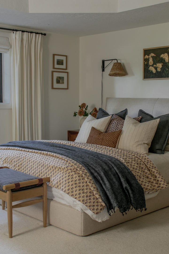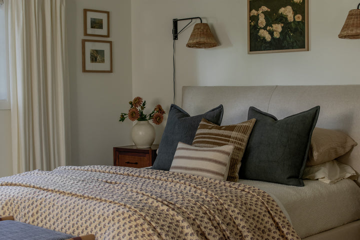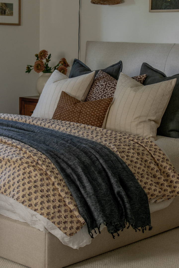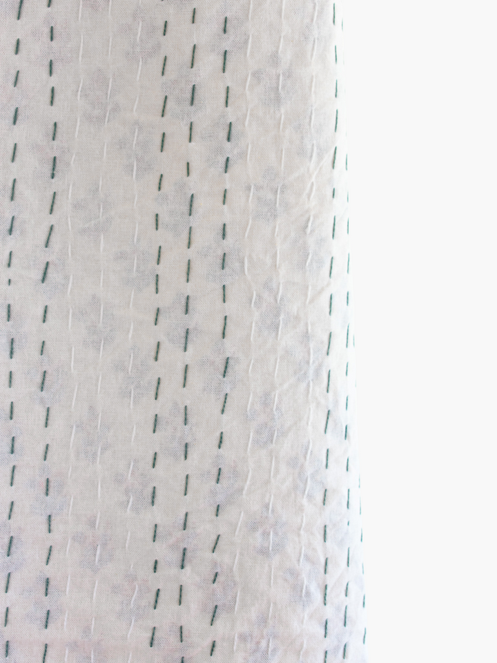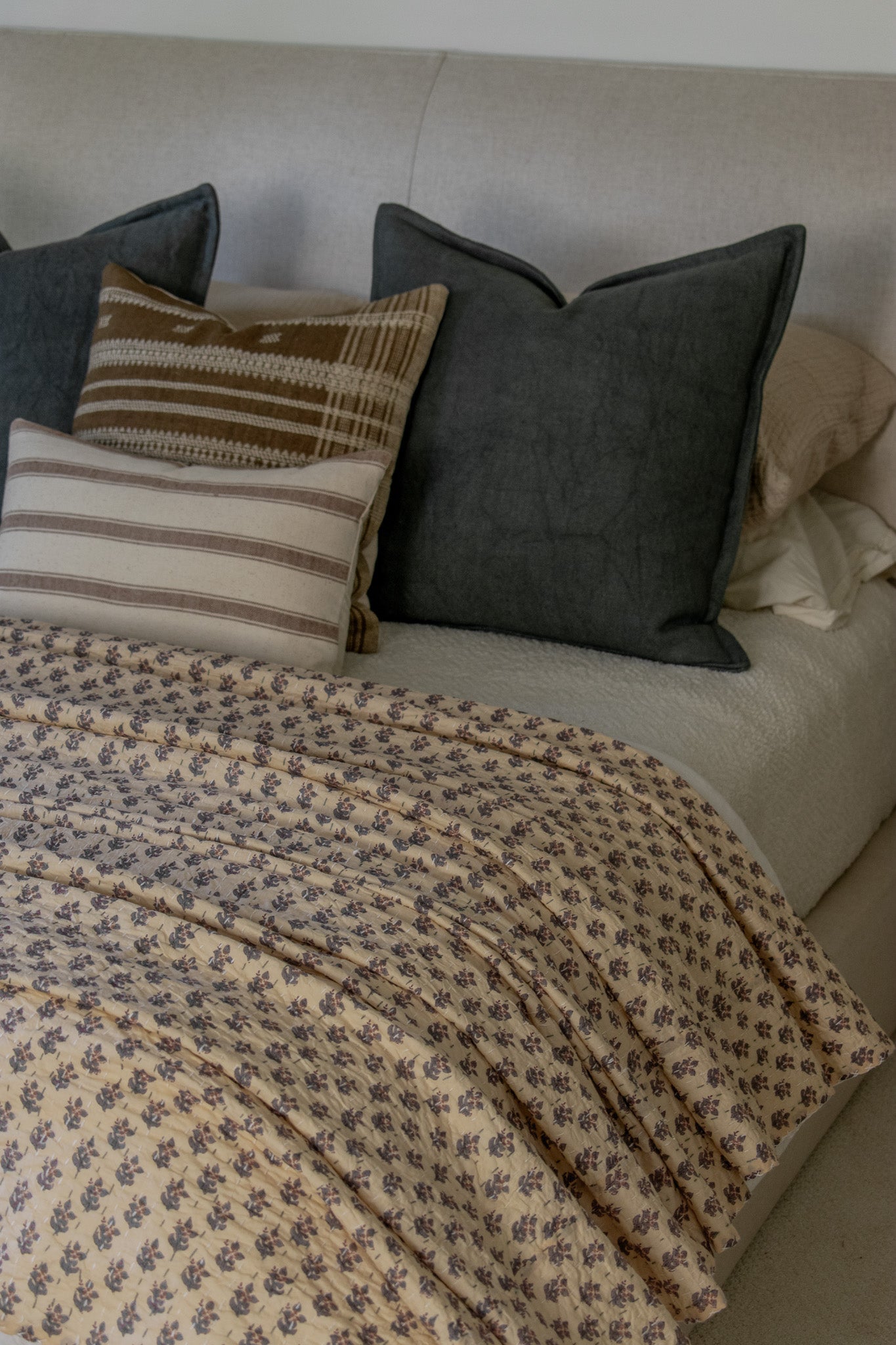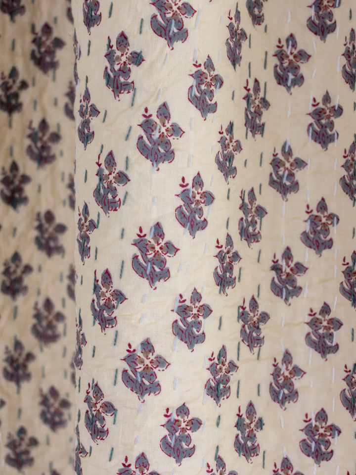 Our large, gorgeous, heirloom quality hand block printed quilts fit beautifully on both King and Queen sized beds. They are a lightweight coverlet-style, giving them a nice drape, and perfect for layering or standing on their own. Two thin layers of cotton fabric are stitched together with hundreds of "kantha" stitches, a centuries-old Bengali tradition of hand stitching. Each quilt is a true labor of love.