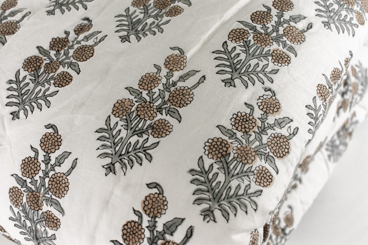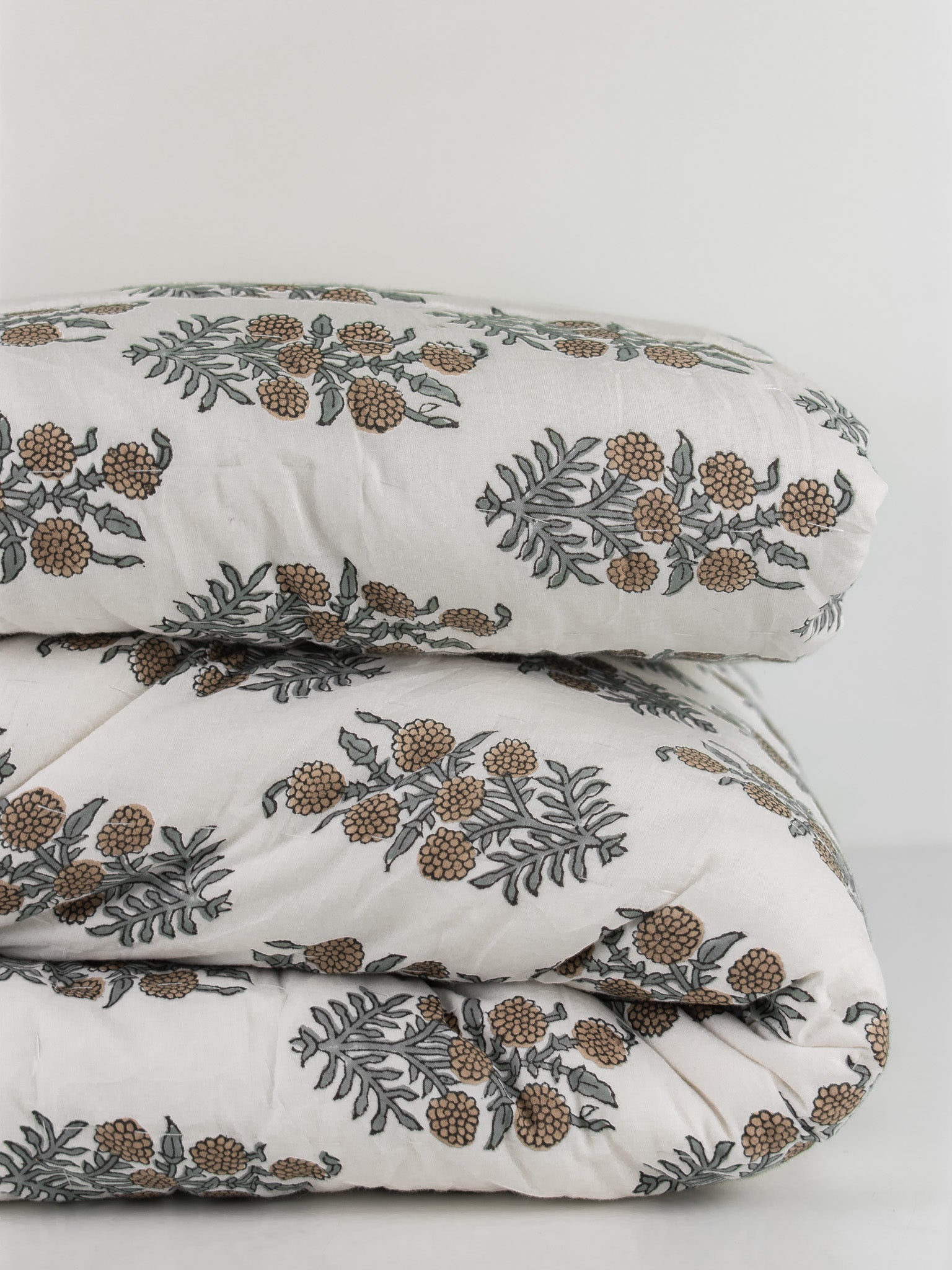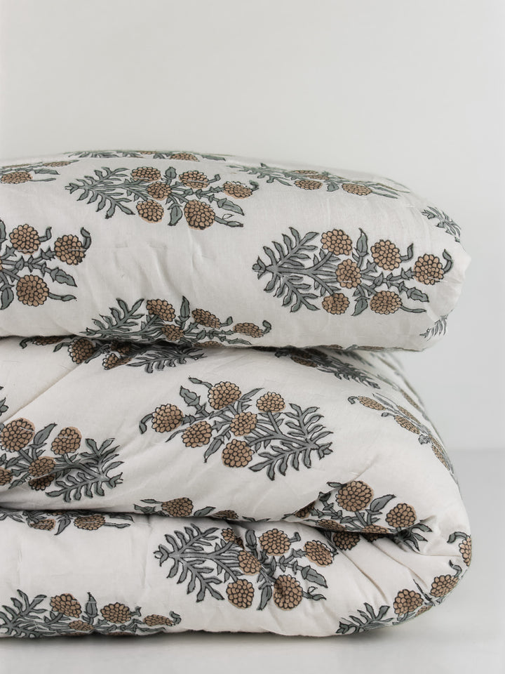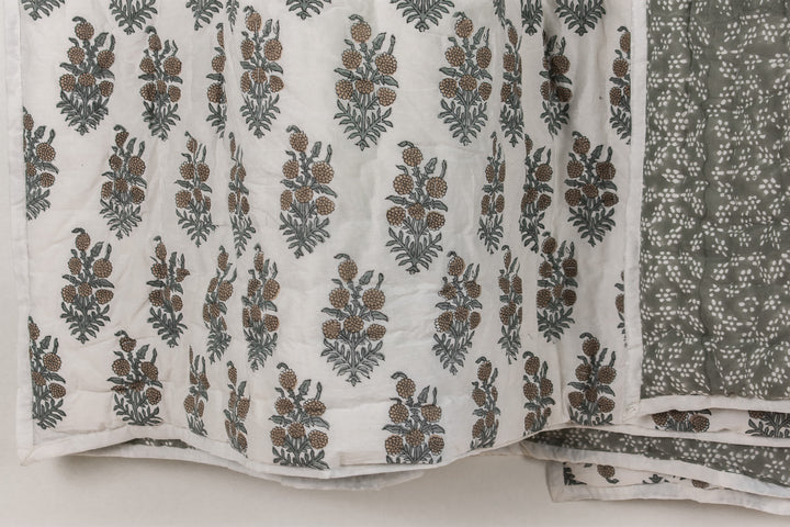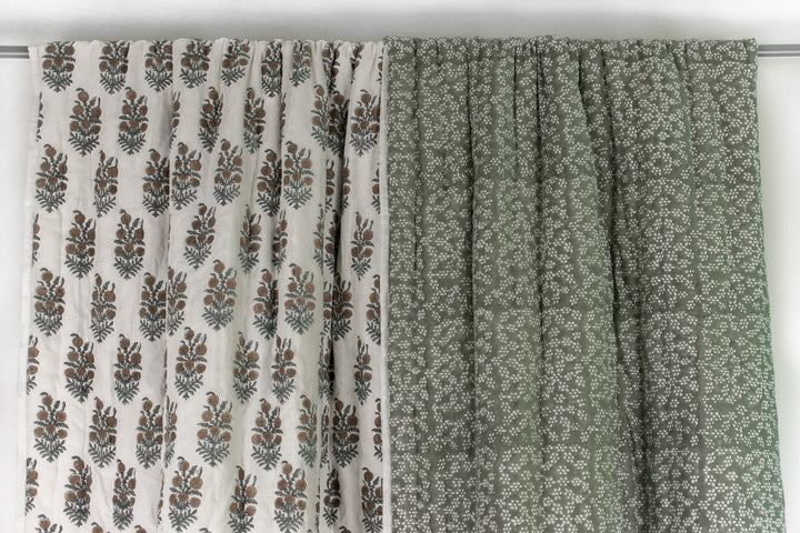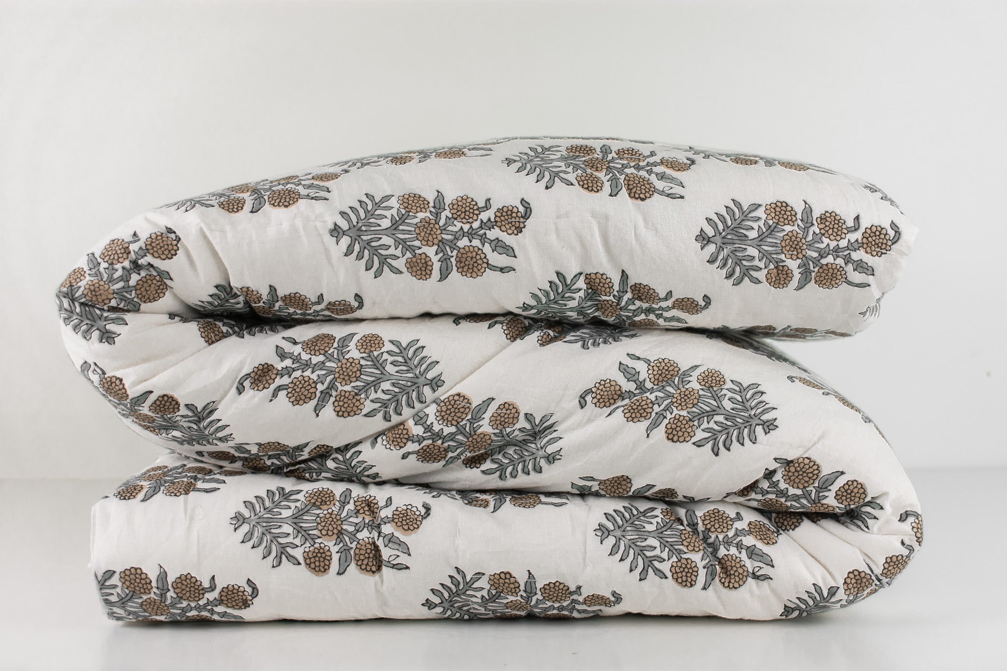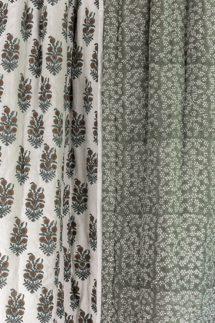 Made from 100% cotton that is meticulously hand block printed on both sides, this heirloom quality quilt offers an amazing two-for-one deal you can mix and match to your heart's content. It's filled with a layer of organic cotton batting, making it extra cozy and perfect for layering or to stand on its own.