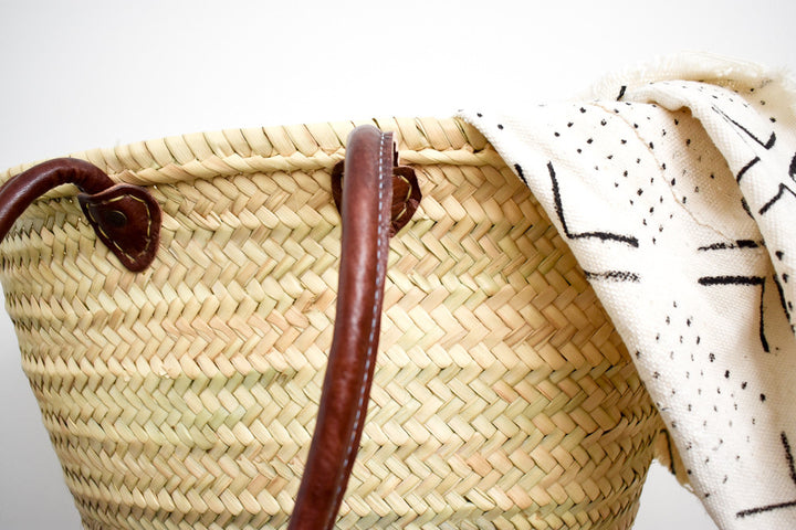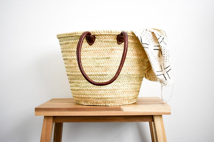 Our Moroccan Market Baskets are made by hand by the sweetest family (a father and 2 sons) we meet in Marrakech. They are made of Palm straw and leather.