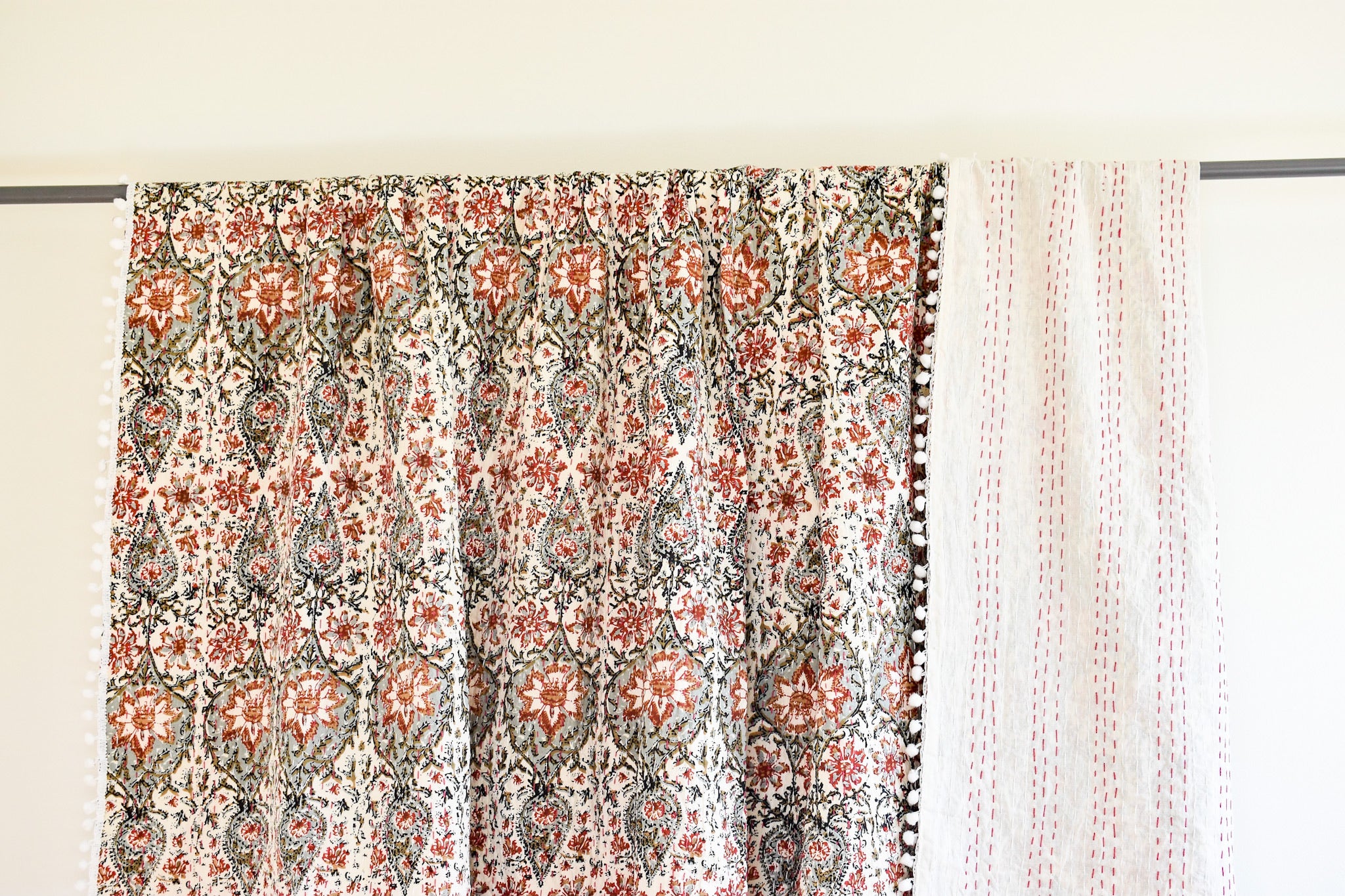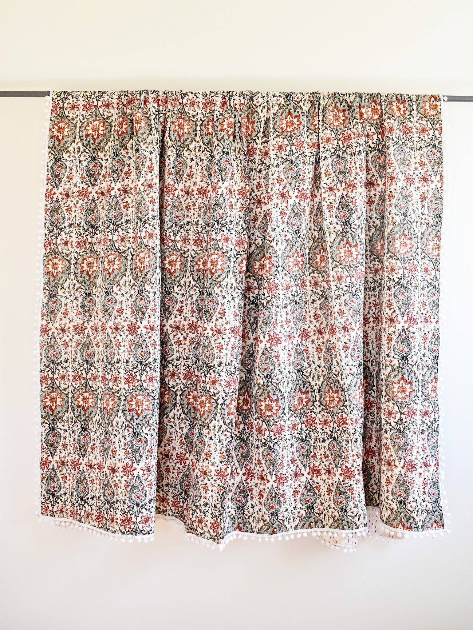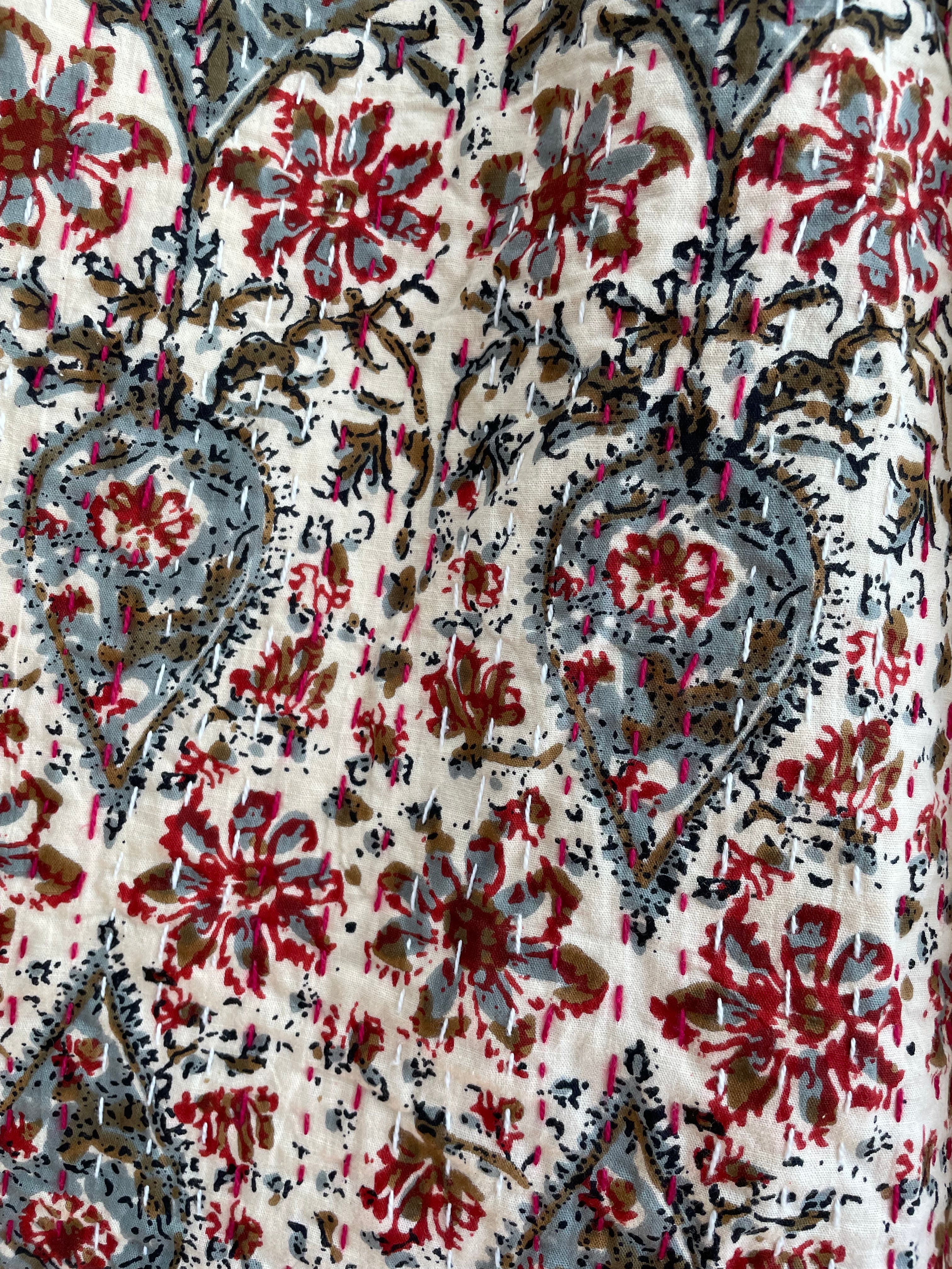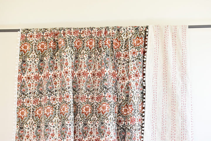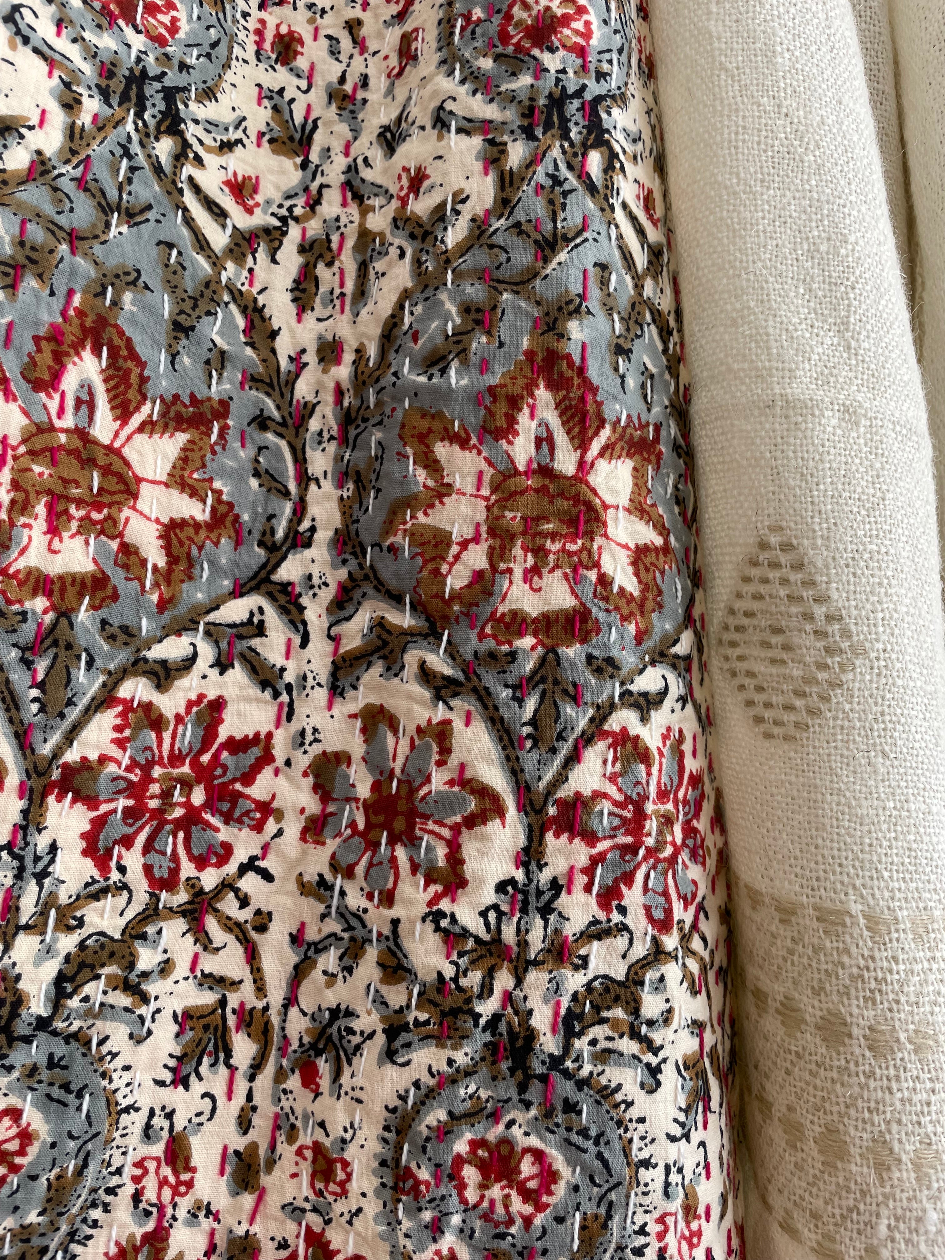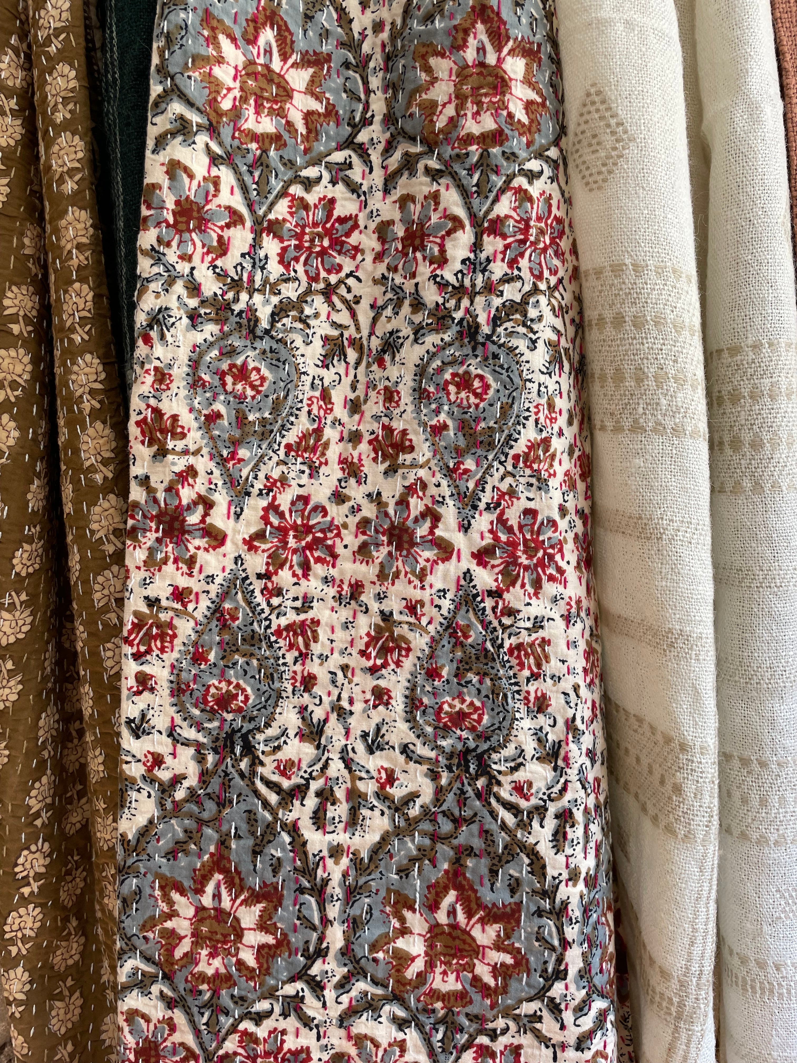 Our large, gorgeous, heirloom quality hand block printed quilts fit beautifully on both King and Queen sized beds. They are a lightweight coverlet-style, giving them a nice drape, and perfect for layering or standing on their own. Two thin layers of cotton fabric are stitched together with hundreds of "kantha" stitches, a centuries-old Bengali tradition of hand stitching. Each quilt is a true labor of love.