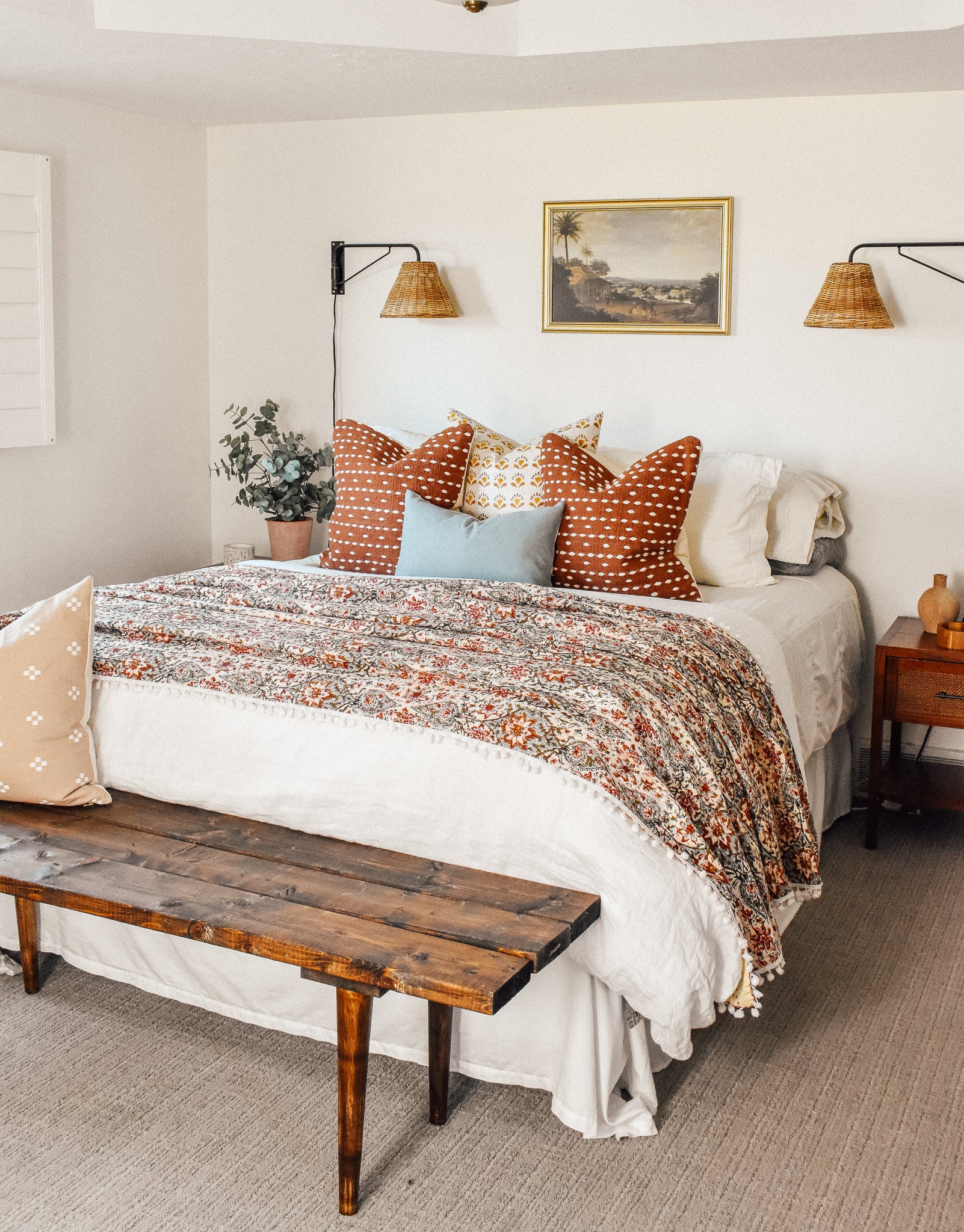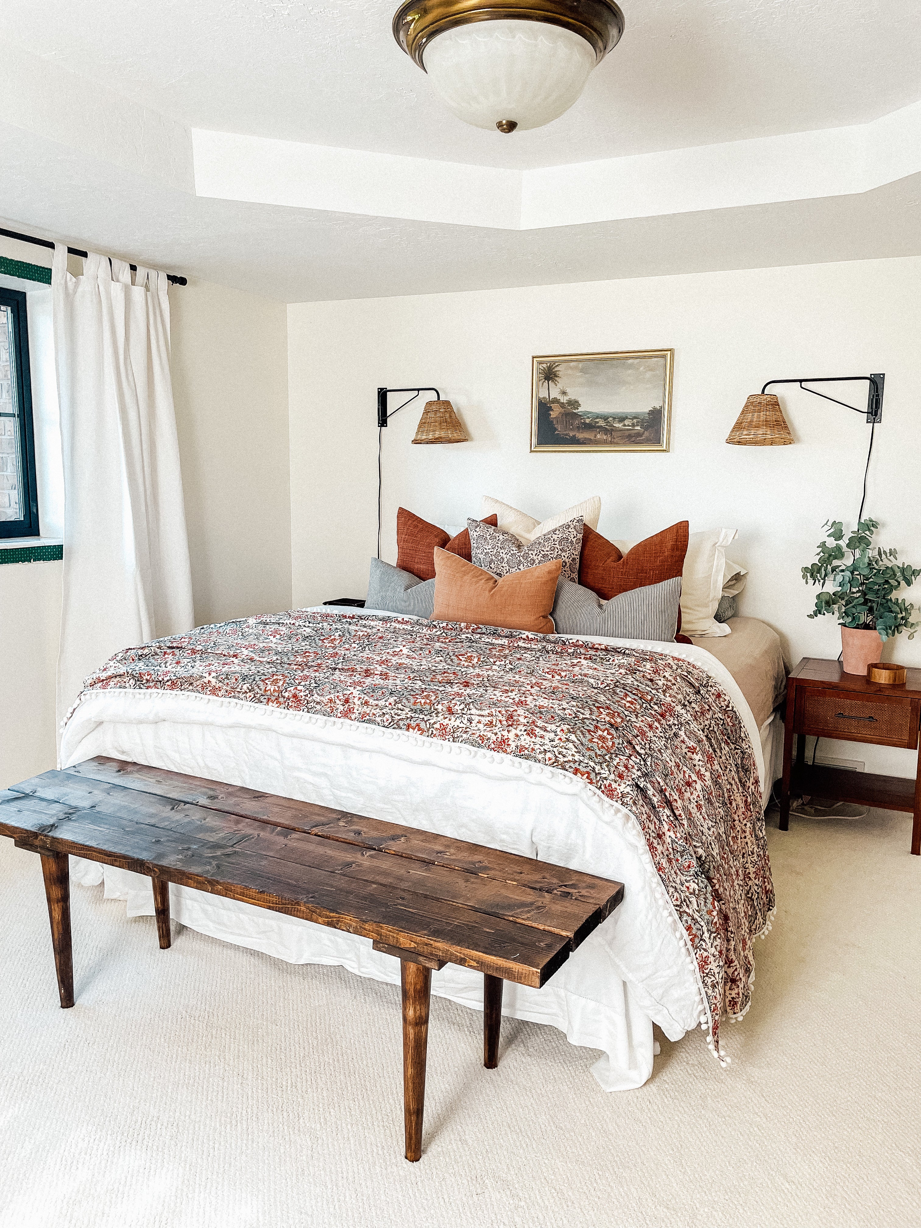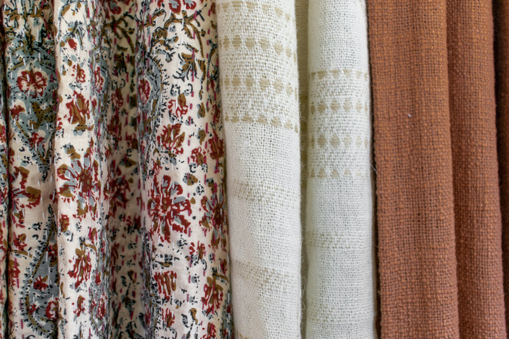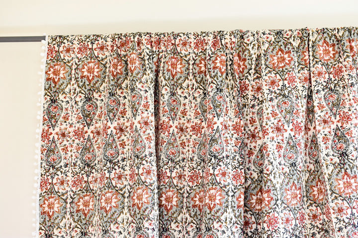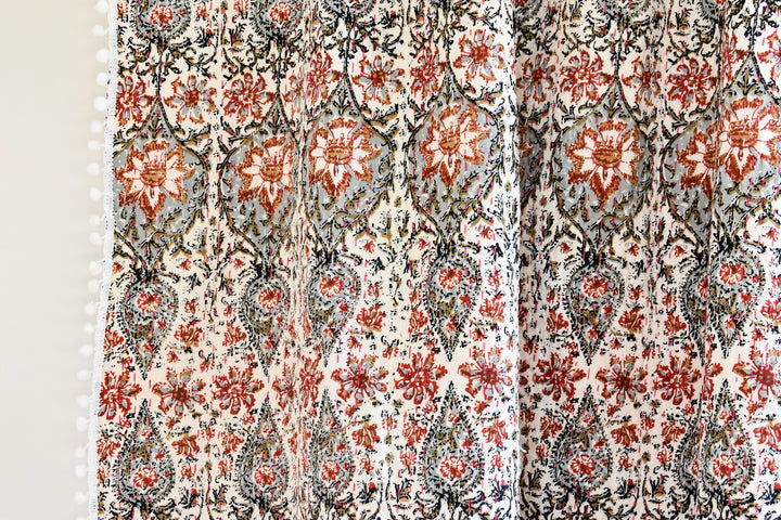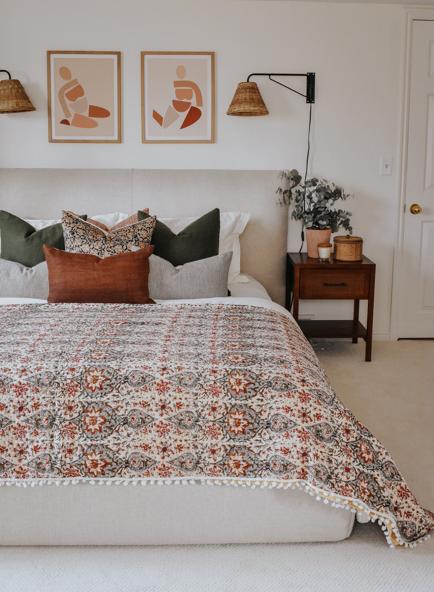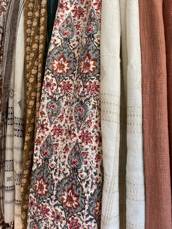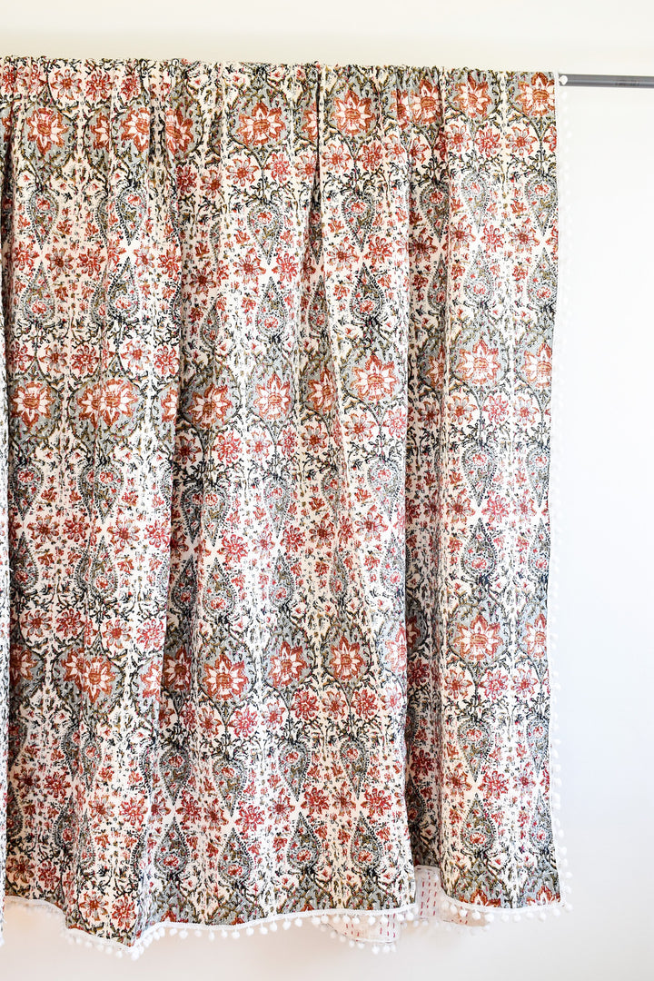 Our large, gorgeous, heirloom quality hand block printed quilts fit beautifully on both King and Queen sized beds. They are a lightweight coverlet-style, giving them a nice drape, and perfect for layering or standing on their own. Two thin layers of cotton fabric are stitched together with hundreds of "kantha" stitches, a centuries-old Bengali tradition of hand stitching. Each quilt is a true labor of love.