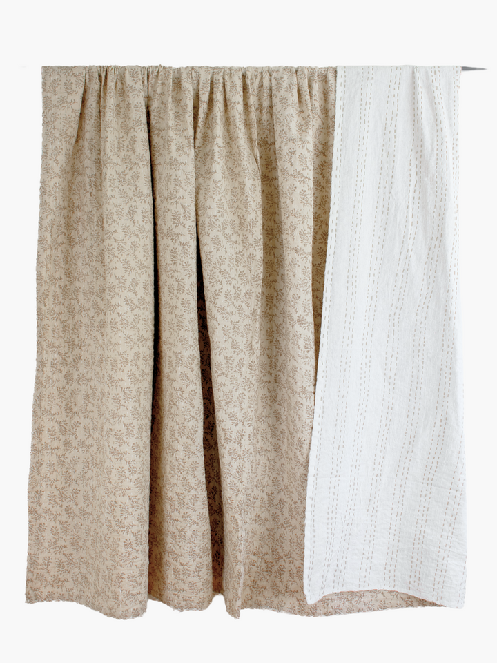 Our large, gorgeous, heirloom quality hand block printed quilts fit beautifully on both King and Queen sized beds. They are a lightweight coverlet-style, giving them a nice drape, and perfect for layering or standing on their own. Two thin layers of cotton fabric are stitched together with hundreds of "kantha" stitches, a centries-old Bengali tradition of hand stitching. Each quilt is a true labor of love.